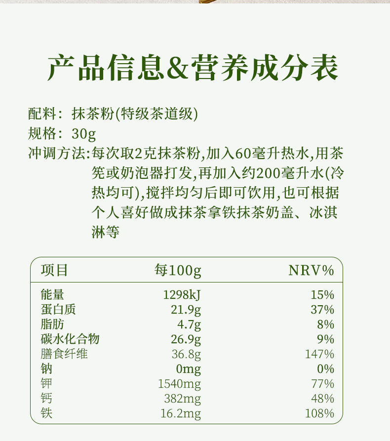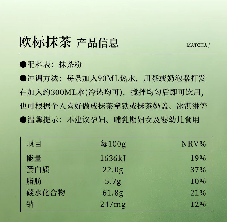 | Packaging specifications | Tea ceremony grade matcha powder [2g*8 pieces],Oriental chiti-european standard matcha [2g*10 strips]/bag,Isuzu matcha powder [30g/can] |