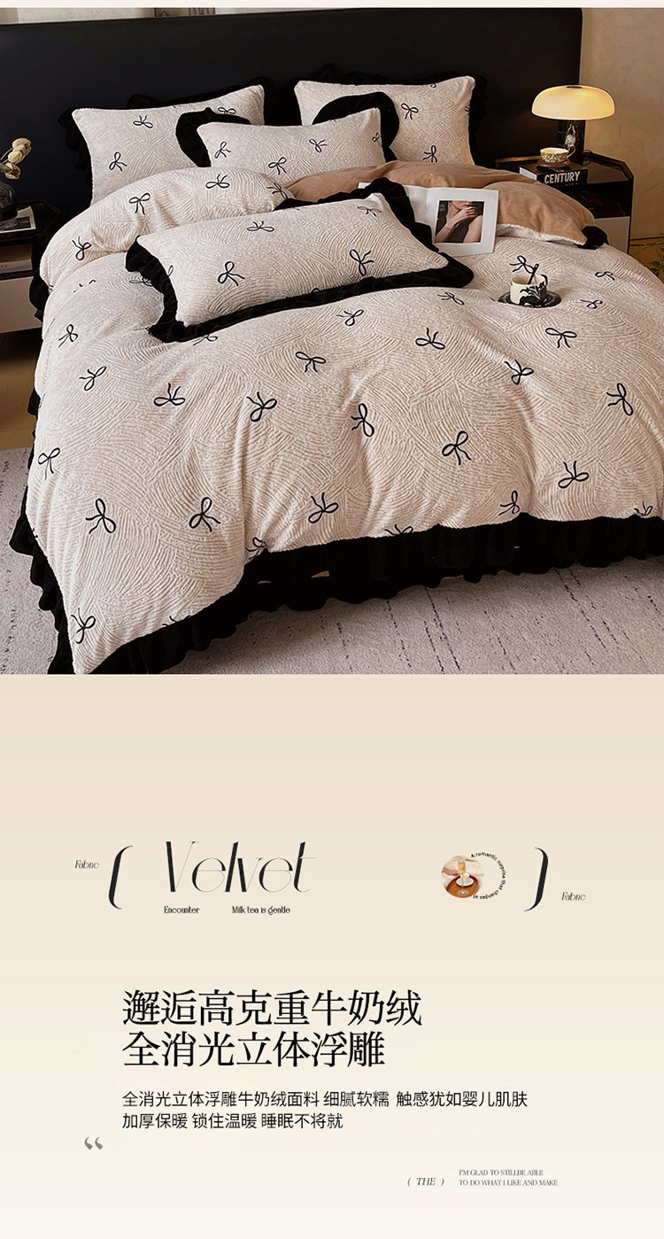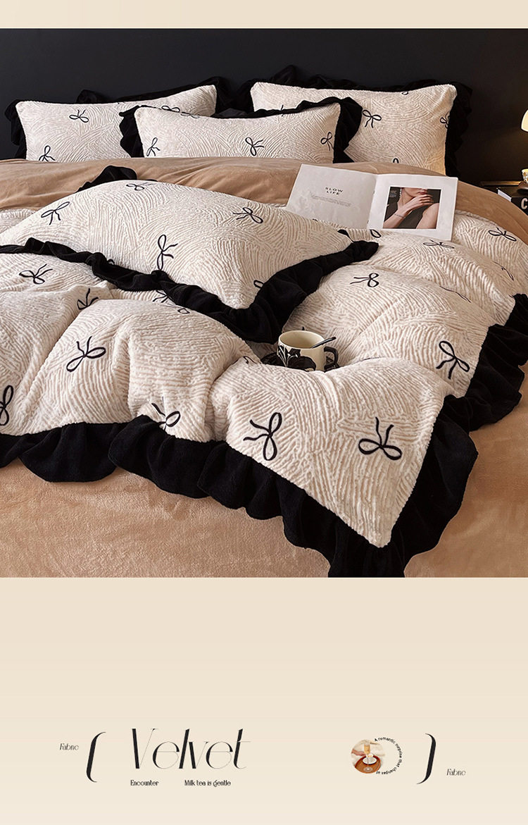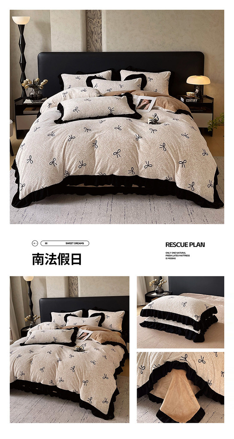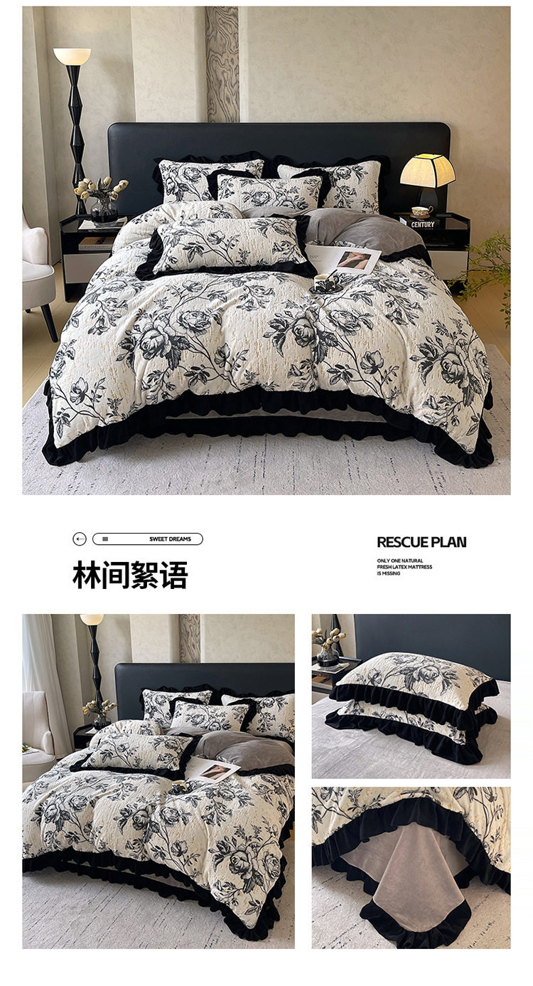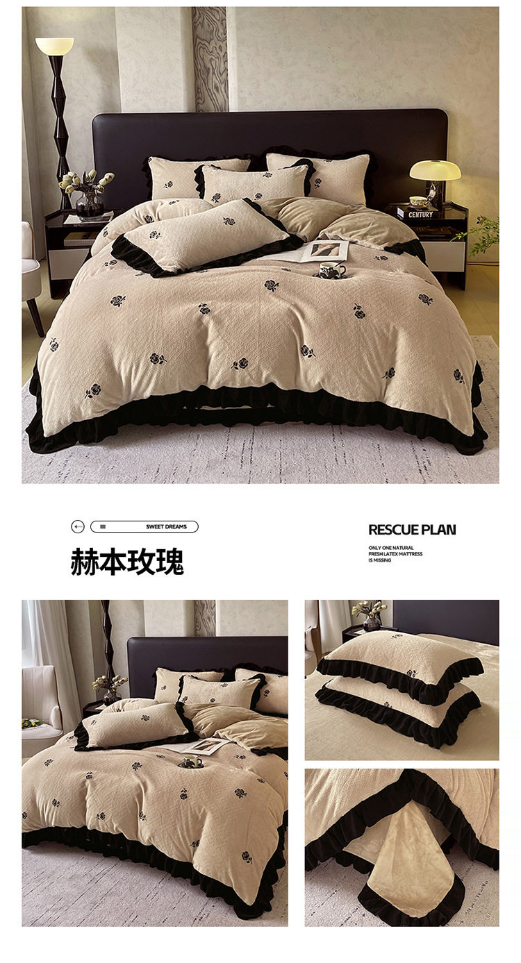 Plush Retro Style Hepburn Light French High Weight Milk Velvet Fully Matte Stereo Relief French Lace Four-Piece Set