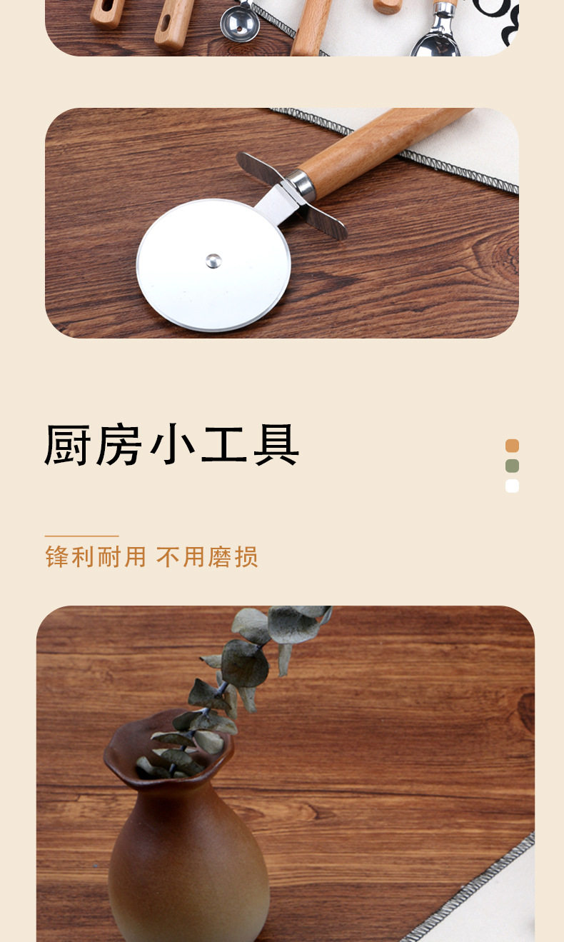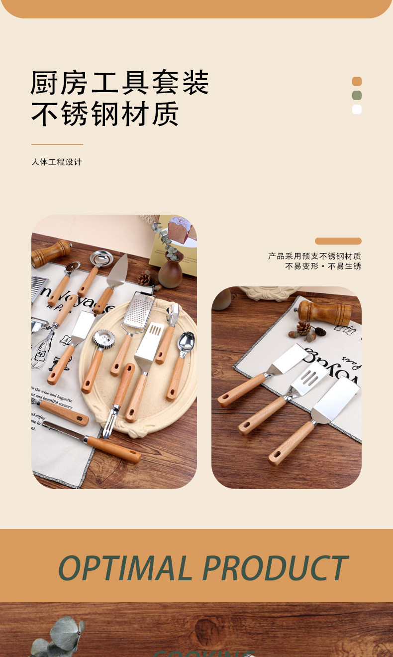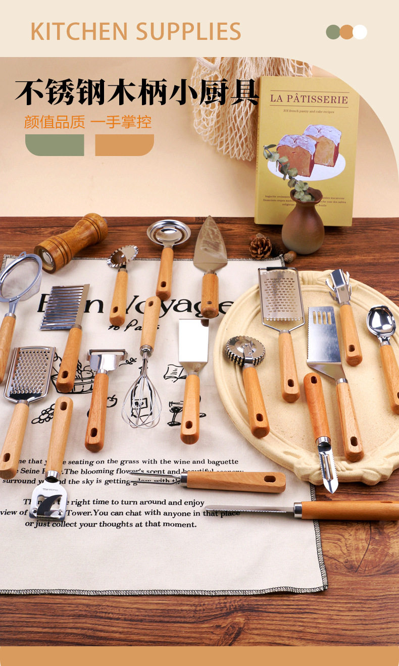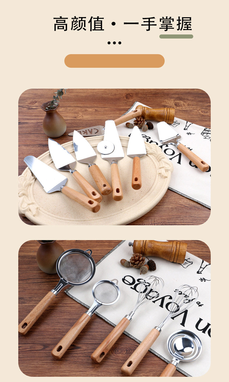 Kitchen Gadgets Wooden Handle Small Kitchen Utensils Stainless Steel Egg Beater Miscellaneous Baking Set Pizza Cheese Knife Wooden Handle