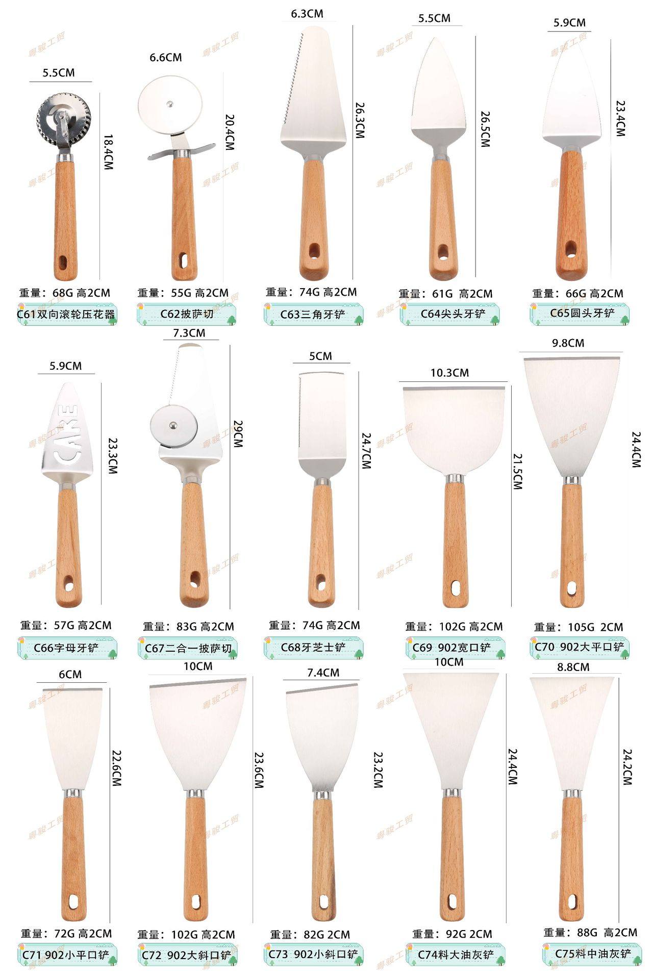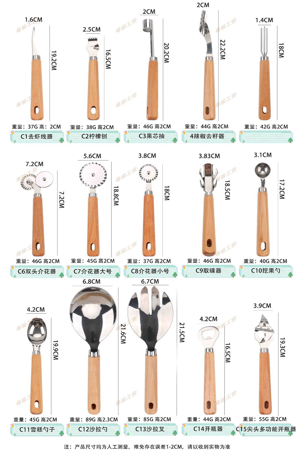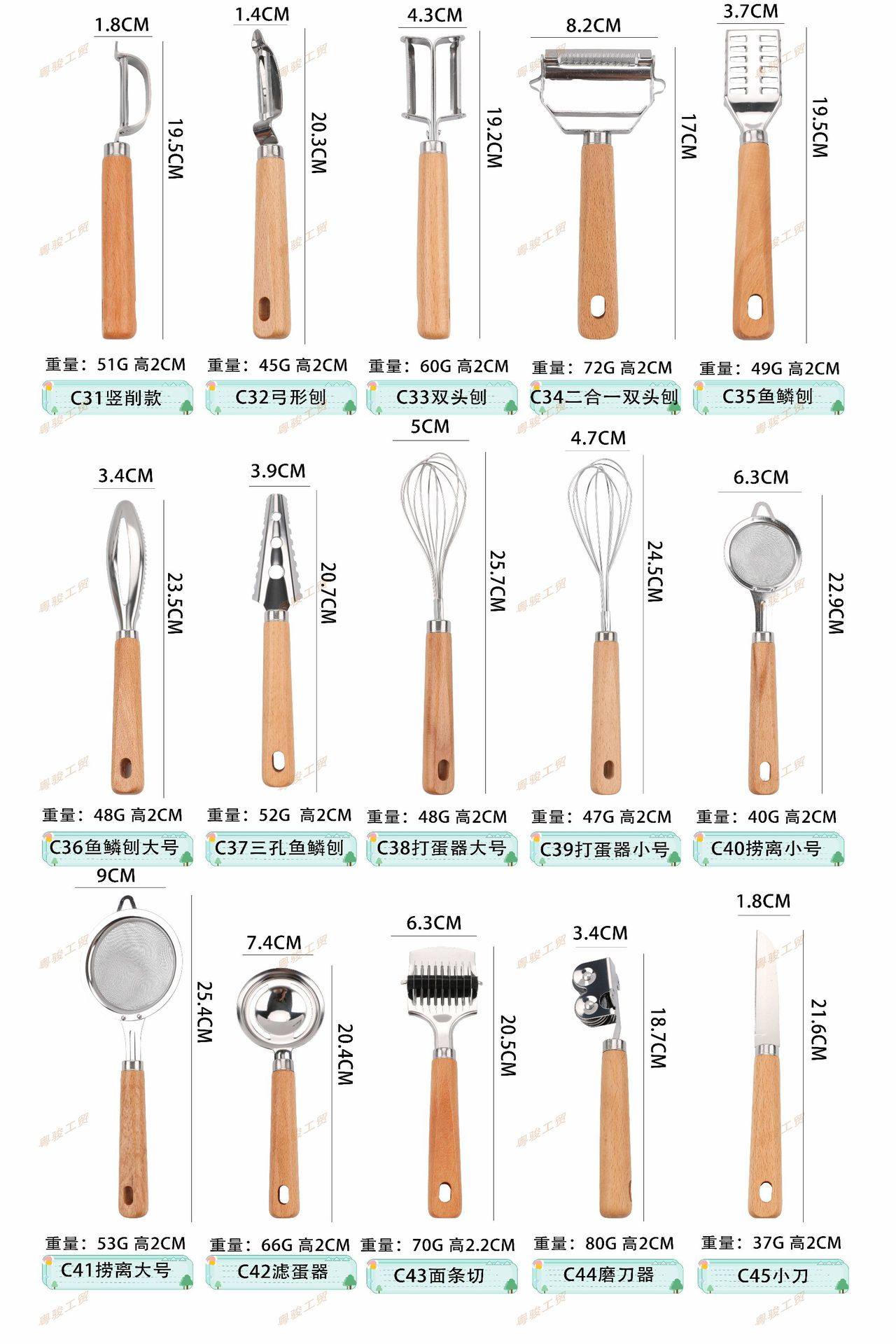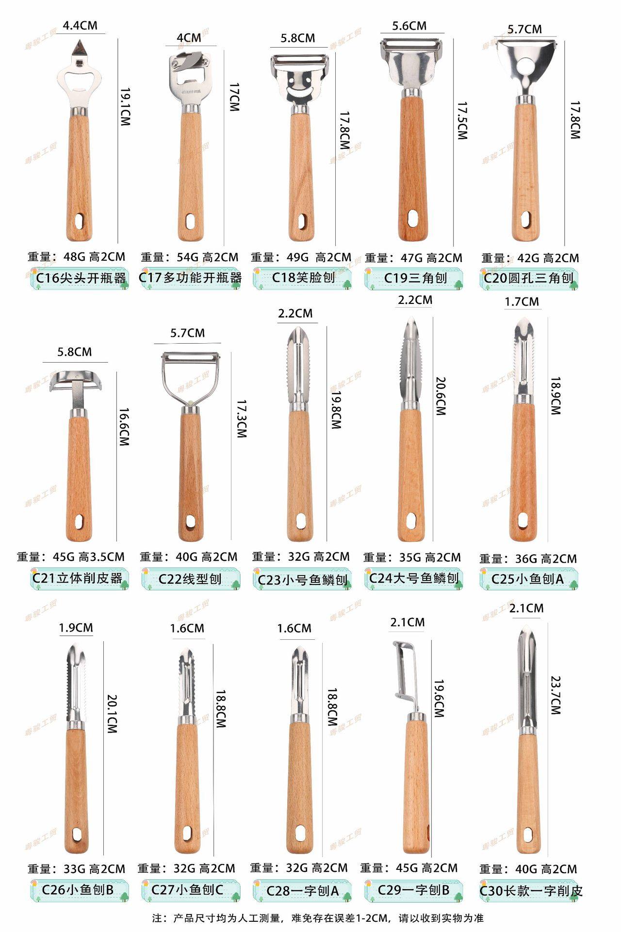 | Specifications | C1 shrimp remover,C2 lemon peeler,C3 fruit core smoke,C4 pepper seed remover,C5 corn fork,C6 double-headed flower introducer,C7 flower holder large size,C8 flower holder small size,C9 disc taker,C10 fruit scoop,C11 ice cream spoon,C12 salad spoon,C13 salad fork,C14 bottle opener,C15 pointed multifunctional bottle opener,C16 pointed bottle opener,C17 multifunctional bottle opener,C18 smiley face planer,C19 triangle planer,C20 round hole triangular planer,C21 three-dimensional peeler,C22 linear planer,C23 small fish scale planer,C24 large fish scale plane,C25 small fish plane a,C26 small fish plane b,C27 small fish plane c,C28 slot planer a,C29 sliding table saw b,C30 long straight peeler,C31 vertical cutting model,C32 bow planer,C33 double head planer,C34 two-in-one double-head planer,C35 fish scale planer,C36 fish scale planer large size,C37 three-hole fish scale plane,C38 large egg beater,C39 egg beater small size,C40 fishing away from small size,C41 fishing away from large size,C42 egg filter,C43 noodle cutting,C44 knife sharpener,C45 pocket knife,C46 fruit knife,C47 small kitchen knife,C48 cane knife,C49 fishtail knife,C50 oyster knife,C51 small cutter,C52 butter spatula type b,C53 three-hole dental knife,C54 three-hole flat knife,C55 letter tooth knife,C56 three-eye shovel,C57 cheese knife,C58 dense hole small frying spatula,C59 three-hole small frying spatula,C60 fish shovel,C61 two-way roller embossing machine,C62 pizza cutter,C63 triangular tooth shovel,C64 pointed tooth shovel,C65 round head tooth shovel,C66 letter tooth shovel,C67 2-in-1 pizza shovel,C68 tooth cheese shovel,C69 902 wide mouth shovel,C70 902 large flat shovel,C71 902 small mouth shovel,C72 902 large inclined shovel,C73 902 small inclined shovel,C74 large putty shovel,C75 medium putty shovel,C76 small putty shovel,C77 cheese shovel,C78 triangular flat shovel,C79 cheese grater,C80 8inch curved spatula,C 816inch curved spatula,C82 8inch straight spatula,C83 6inch straight spatula,C85 one-word potato cutter,C86 potato cutting,C87 potatoes cut into large size,C88 fine hole radish planer large size,C89 coarse hole radish planer large size,C90 multifunctional grater large size,C91 coarse hole radish planer short style,C92 fine hole radish planer short style,C93 multifunctional grater slim model,C94 ginger and garlic shaved short style,C95 fine hole radish planer long style,C96 coarse hole carrot planer long style,C97 fine hole ginger planer long style,C98 u-shaped ginger and garlic planer long style,C99 fine hole cheese grater,C100 ice filter,C101 carving tool type a,C102 pineapple machine,C103 small potato press,C105 fork,C106 oil brush |