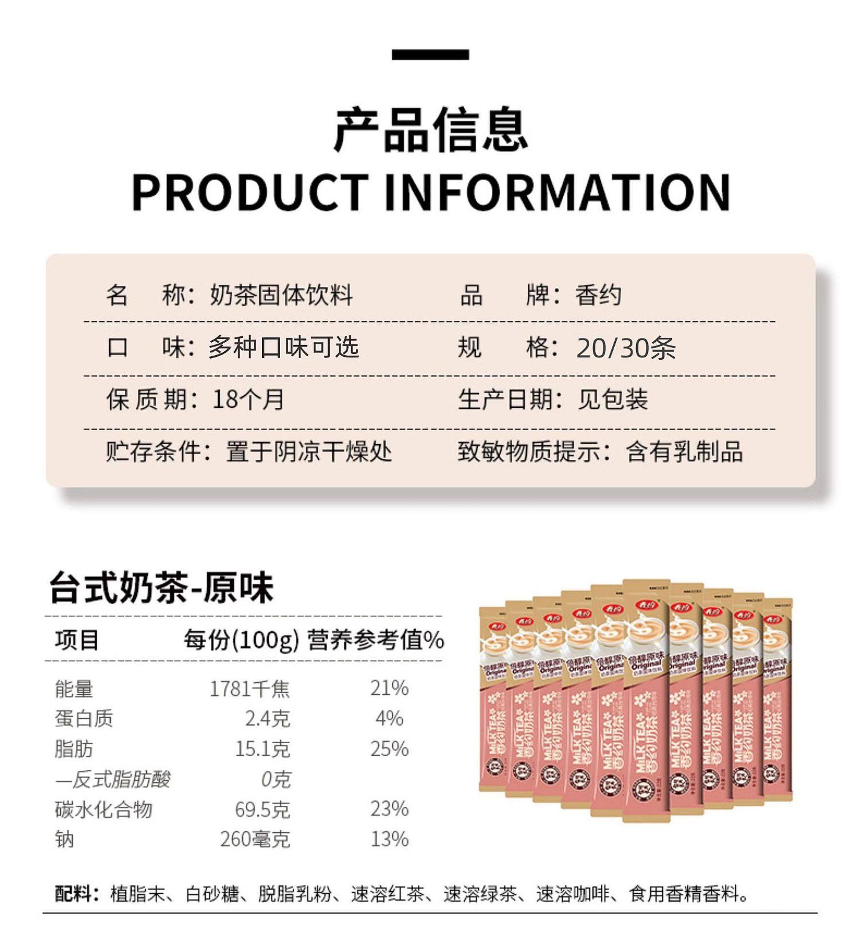 | Packaging specifications | 30 mixes (no giveaways) §,30 pieces of original flavor (no gifts) §,30 pieces of taro (no gifts) §,30 pieces of strawberry flavor (no gifts) §,30 pieces of fragrant wheat flavor (no gifts) §,30 pieces of milk coffee flavor (no gifts) §,30 pieces of cantaloupe flavor (no gifts) §,30 mixes (flavors optional) free glacier cup + spoon§,30 mixes (flavors optional) free ceramic cup + spoon§,30 mixes (flavors optional) and 10 coconuts§,30 mixes (flavors optional) and 10 packs of red beans§,30 mixes (flavors optional) 5 coconut 5 red bean§,30 pieces of taro (free glacier cup + spoon) §,30 pieces of original flavor (free glacier cup + spoon) §,30 strawberries (free glacier cup + spoon) §,30 pieces of milk coffee flavor (free glacier cup + spoon) §,[two boxes of 60 pieces] mix and match (flavor optional) + glacier cup + spoon §,[two boxes of 60 pieces] mix and match (flavor optional) + ceramic cup + spoon§,[two boxes of 60 pieces] mix and match (flavors optional) + lipton classic tea bags 5 packs§,30 mixes (flavors optional) and 5 packs of lipton classic tea bags§,30 mixes (flavors optional) 5 red beans 5 pearls §,30 mixes (flavors optional) 5 coconuts 5 pearls §,30 mixes (flavors optional) and 10 packs of pearls§ |