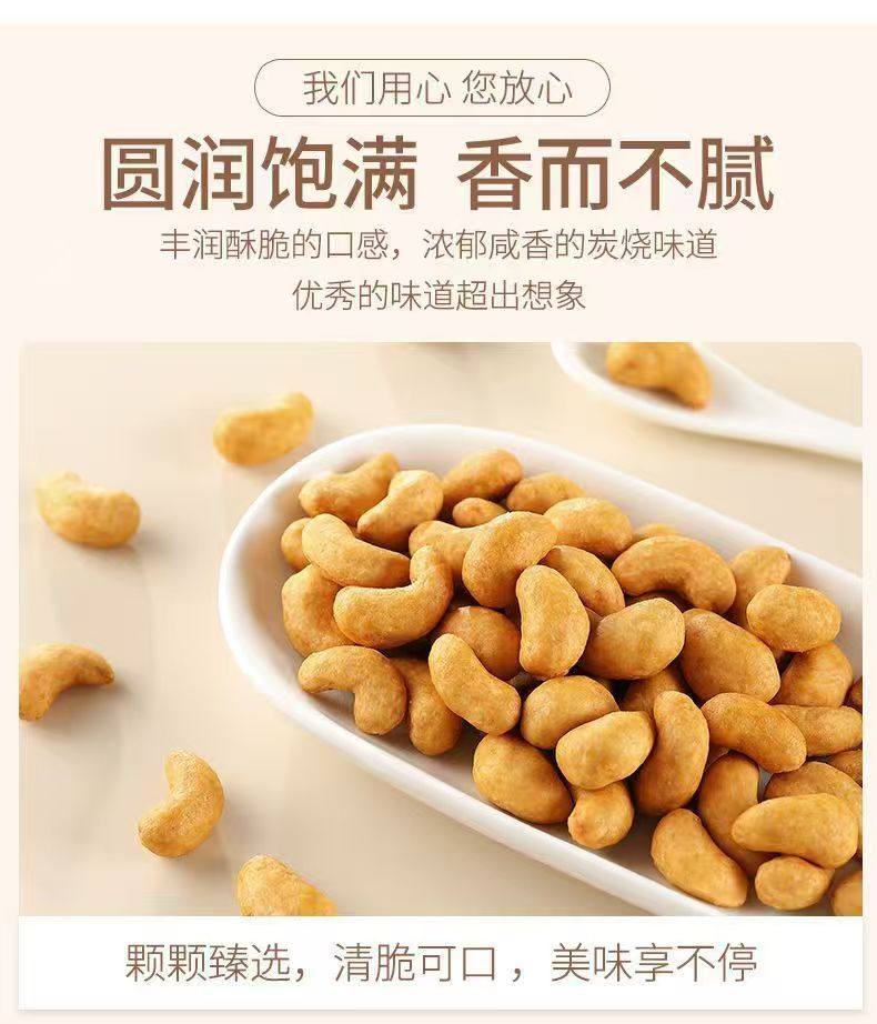 | Taste | [stock up, large quantity and cheap] 500g*2 bags,[sold only in net weight, no desiccant weighing] 500g*1 bag,[net weight 250g*1 bag] charcoal roasted cashew nuts,[small portable package] 100g*1 bag |