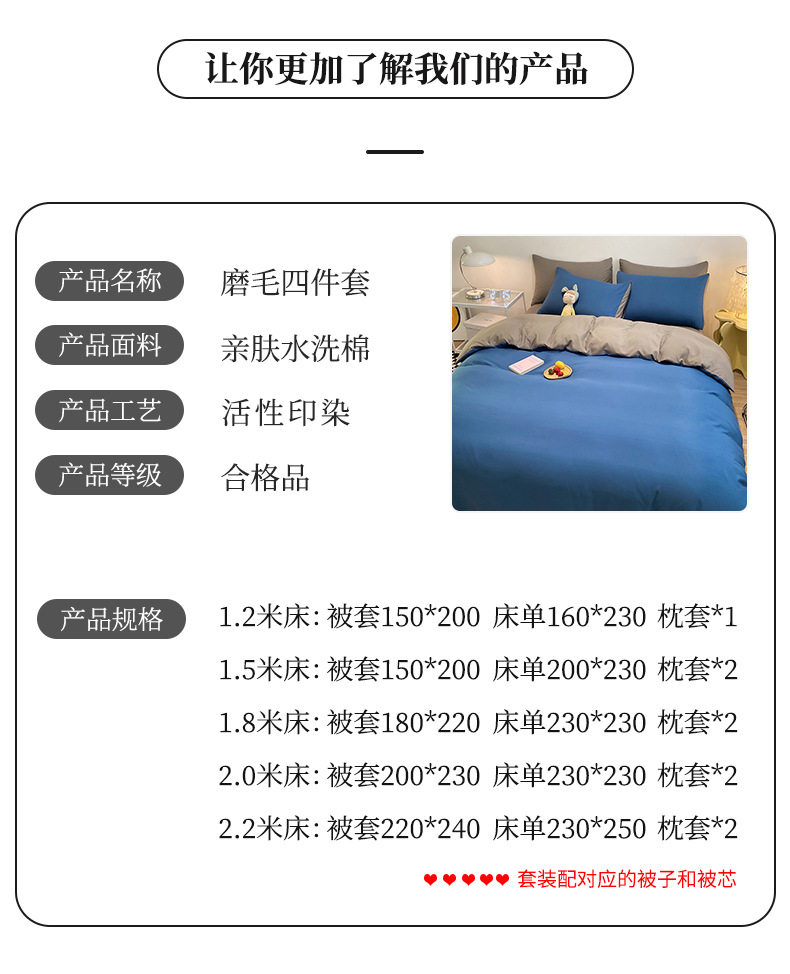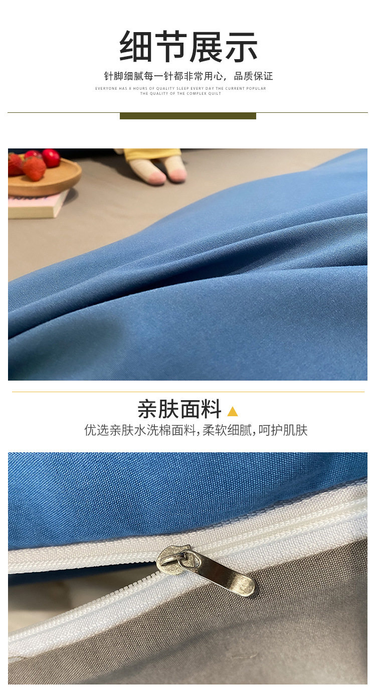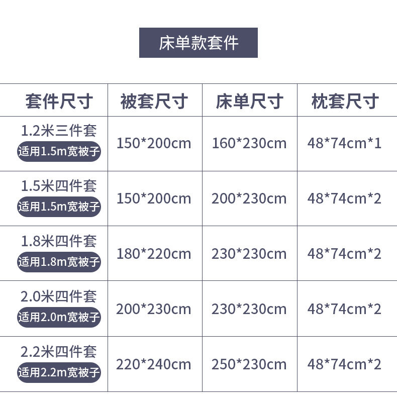 | Size specifications | 1.2m three-piece set [quilt cover 150x200cm],1.5m bed four-piece set [quilt cover 150x200cm],1.8m four-piece set [quilt cover 180x220cm],2.0m four-piece set [quilt cover 200x230cm],Single quilt cover 150*200cm,Single quilt cover 180*220cm,Single quilt cover 200*230cm,Single bed sheet 150x230cm,Single bed sheet 180x230cm,Single bed sheet 220x230cm,Single bed sheet 230x250cm,1 pillowcase |