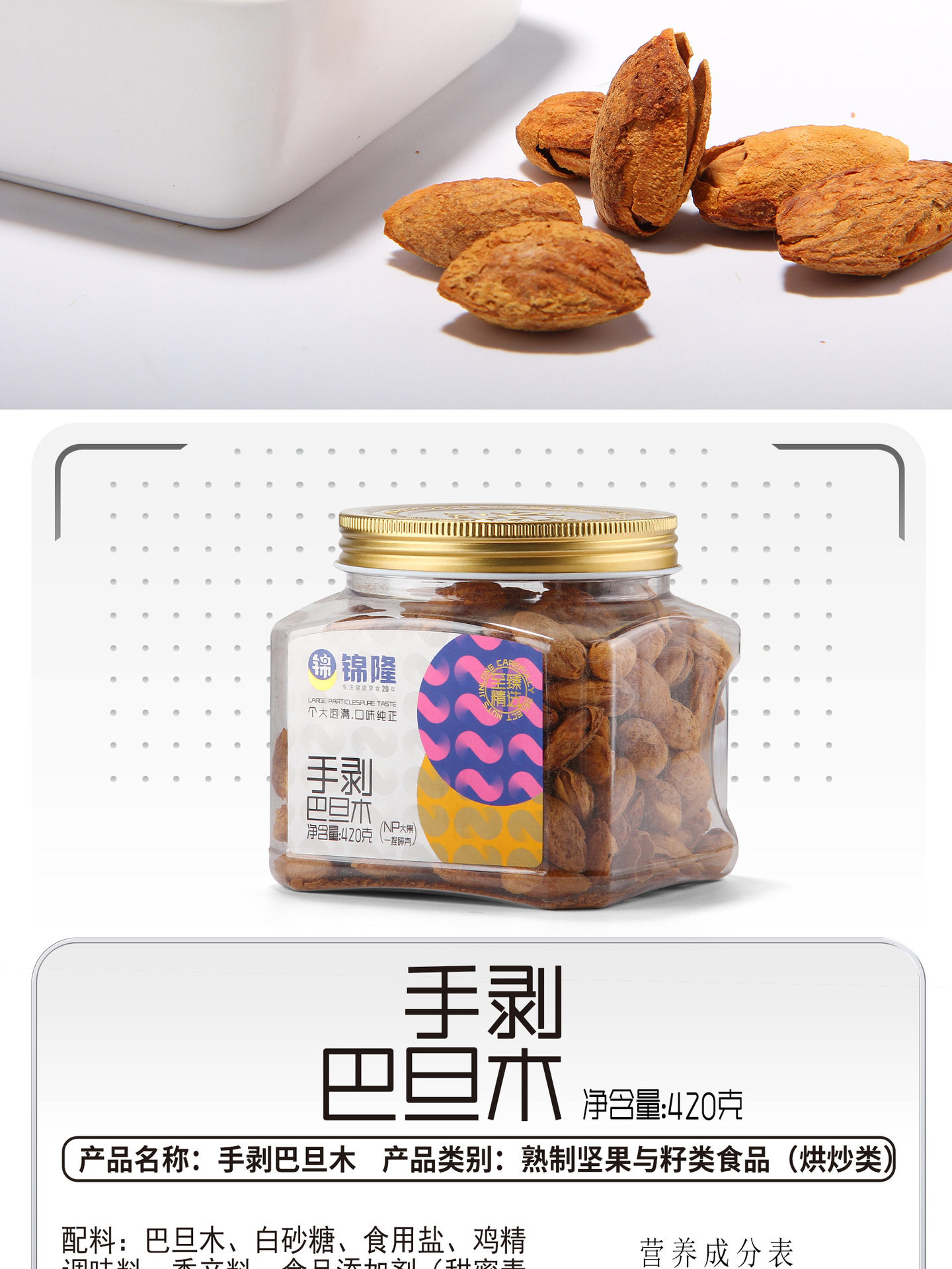 | Packaging specifications | Hand peeled almonds 420g*1 can |