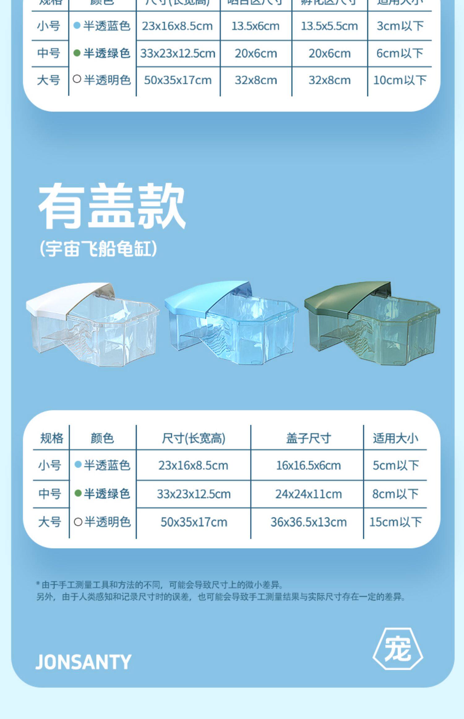 | Specifications | Chinese soft-shell turtle (2 playmate turtles),Brazilian turtle (2 playmate turtles),Small spaceship white cylinder, free gift package + food,Medium spaceship white tank, free gift pack + food,Large spaceship white tank, free gift package + food,Small spaceship white tank [upgraded cover] free 2 turtles + gift package + food,Medium spaceship white tank [upgraded cover] free 2 turtles + gift package + food,Large spaceship white tank [upgraded cover] free 2 turtles + gift package + food,Medium spaceship white cylinder [upgraded cover + filter] free gift pack + food,Large spaceship white cylinder [upgraded cover + filter] free gift pack + food,Medium spaceship white tank [upgraded cover + filter + sun lamp] free gift pack + food,Large spaceship white tank [upgraded cover + filter + sun lamp] free gift pack + food,Medium spaceship blue cylinder [upgraded cover] free gift pack + food,Large spaceship blue cylinder [upgraded cover] free gift pack + food,Medium spaceship blue tank [upgraded cover + filter] free gift pack + food,Large spaceship blue tank [upgraded cover + filter] free gift pack + food,Medium spaceship blue tank [upgraded cover + filter + sun lamp] free gift pack + food,Large spaceship blue tank [upgraded cover + filter + sun lamp] free gift pack + food |