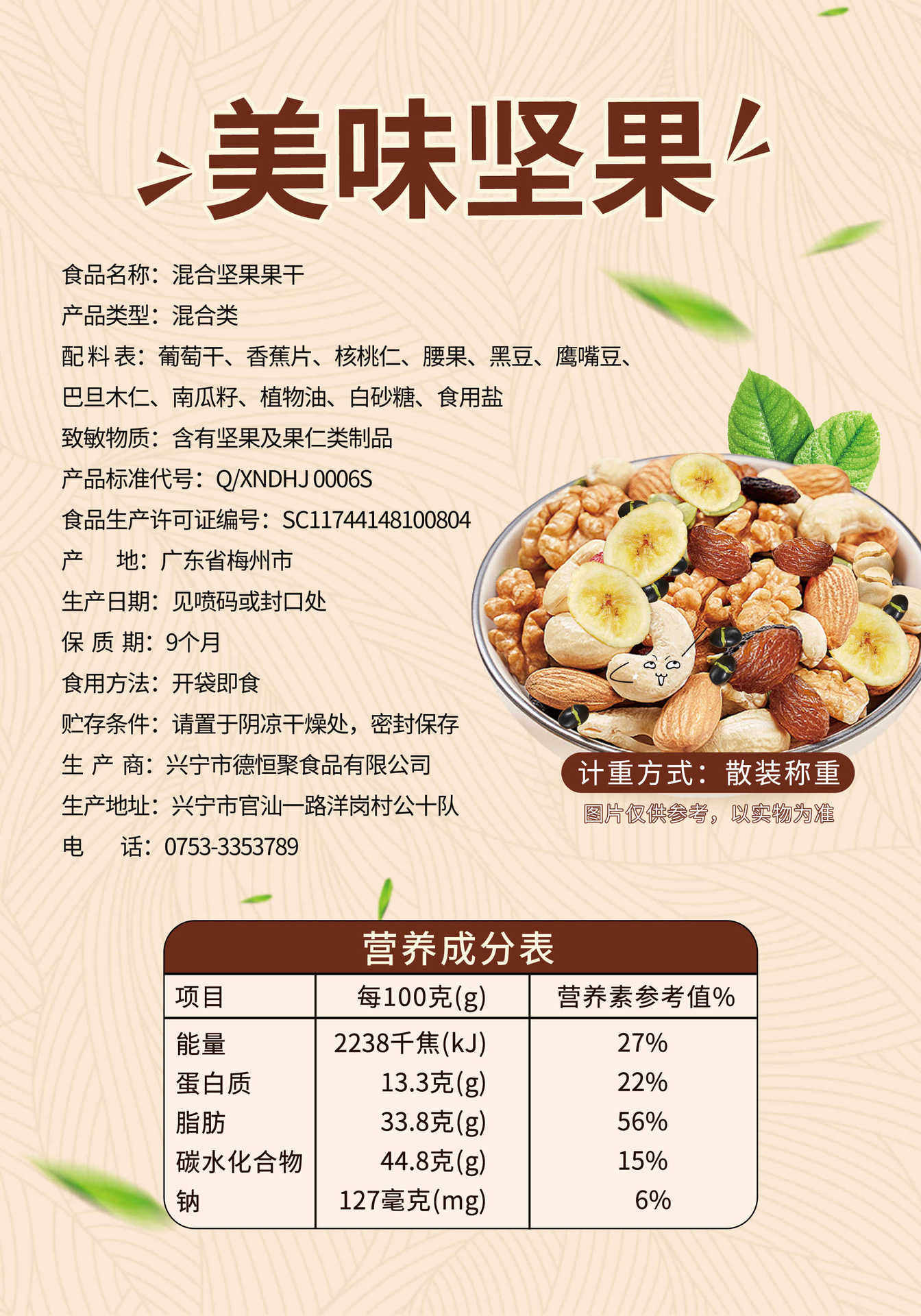 | Packaging specifications | 100g of nuts daily,Daily nuts 100g*2,Daily nuts 100g*3,Daily nuts 250g*1 can,Daily nuts 250g*2 cans,Daily nuts 250g*3 cans,Daily nuts 250g*4 cans,Daily nuts 500g*1 can,Daily nuts 500g*2 cans,Daily nuts 500g*3 cans,Daily nuts 500g*4 cans,5 small packets of nuts daily,10 small packets of nuts daily,20 small packets of nuts daily,30 small packets of nuts daily,40 small packets of nuts daily,50 small packets of nuts daily |
