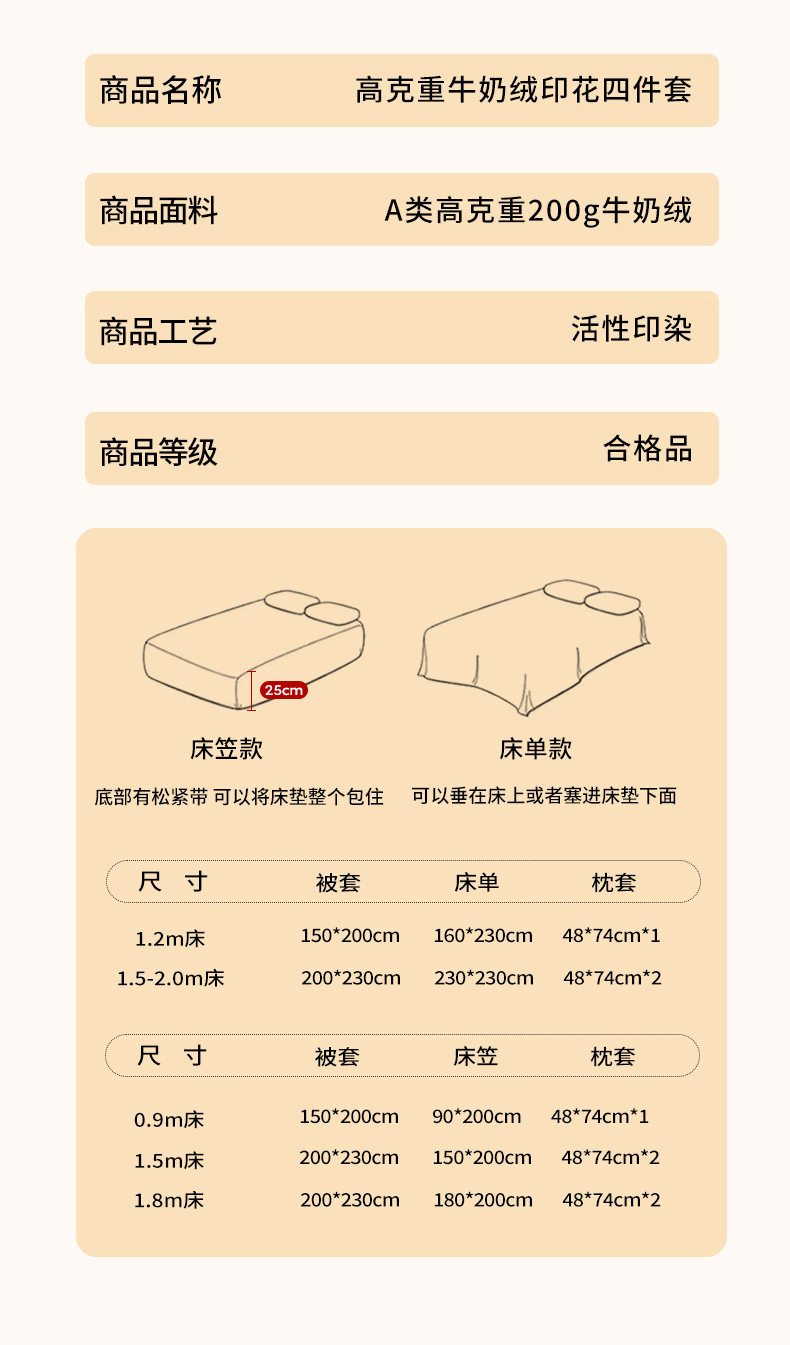 | Size specifications | 0.9m bed dormitory three-piece set: suitable for 150*200cm quilt core,1.2m bed sheet three-piece set: fits 150*200cm duvet inserts,1.5m bed sheet four-piece set: suitable for 200*230cm quilt core,1.8m bed sheet four-piece set: suitable for 200*230cm quilt core,2.0m bed sheet four-piece set: suitable for 200*230cm quilt core,0.9m [three-piece fitted sheet set]: suitable for 150*200cm quilt core,1.5m [four-piece fitted sheet set]: suitable for 200*230cm quilt core,1.8m [four-piece fitted sheet set]: suitable for 200*230cm quilt core |