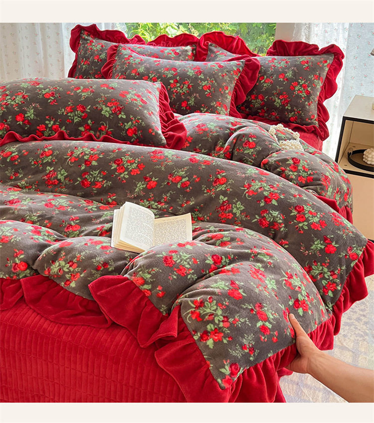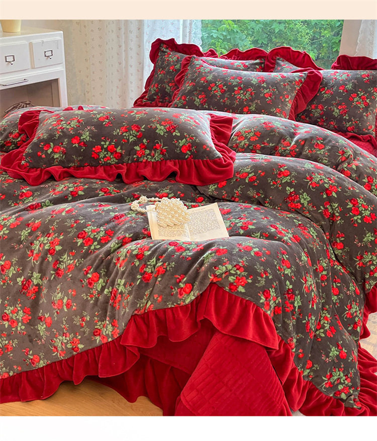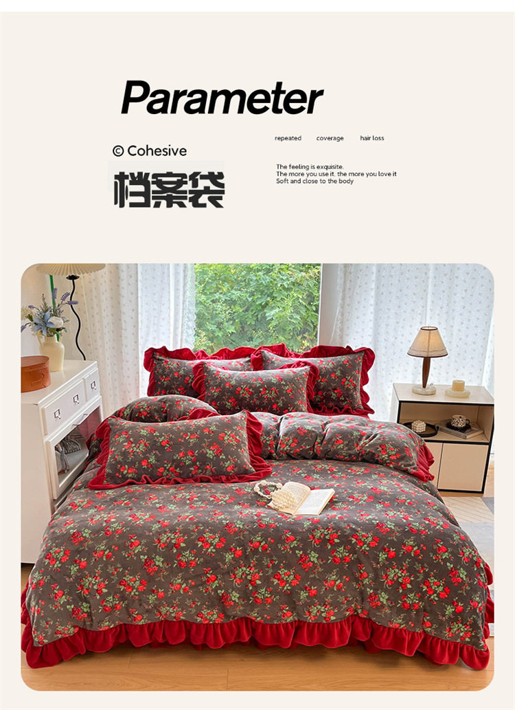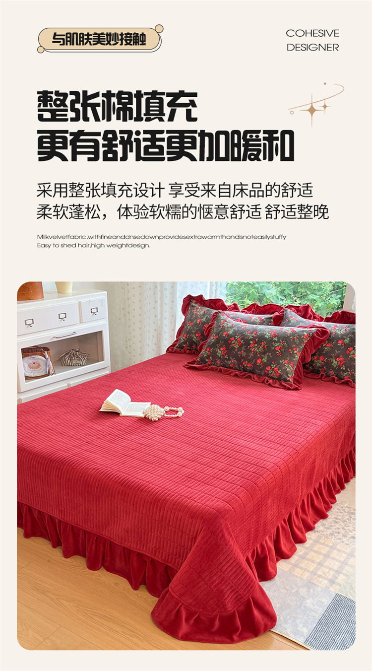 Autumn and Winter Thickened Milk Bed Cover Four-Piece Set with Vintage Lace, Quilted Non-Slip Bedspread, Double-Sided All-Season Coral Fleece