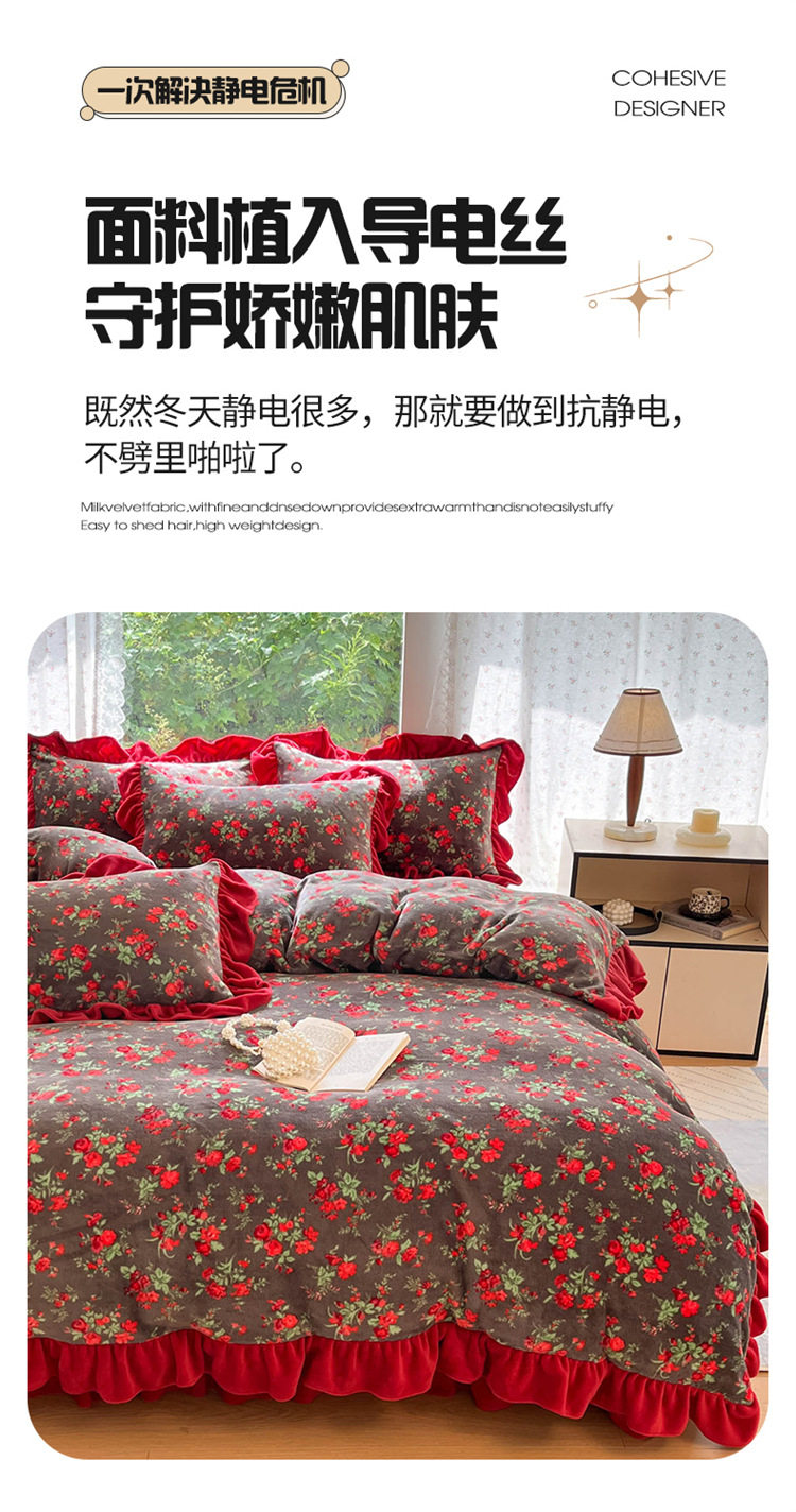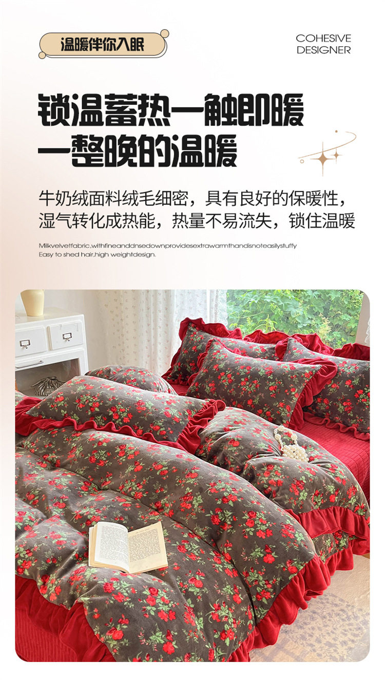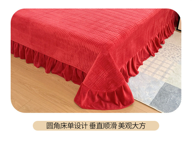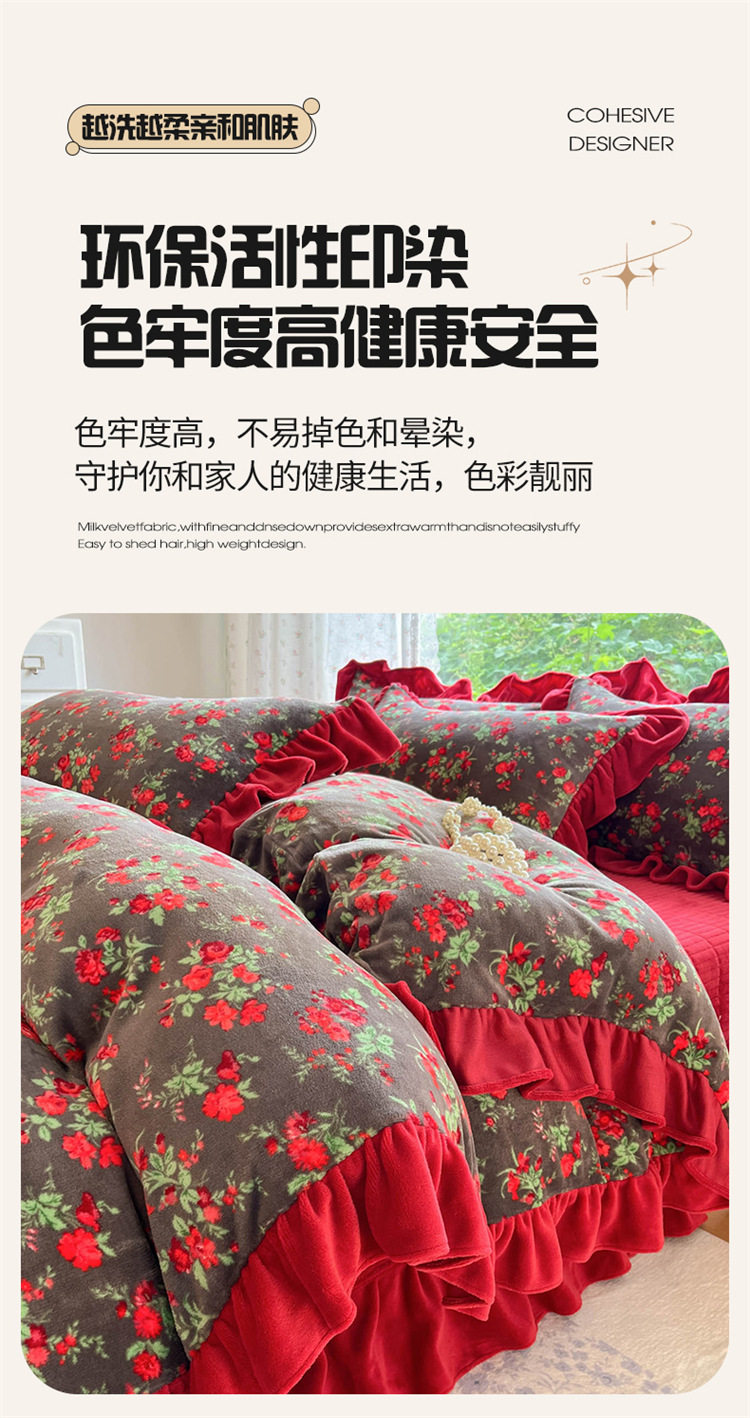 Autumn and Winter Thickened Milk Bed Cover Four-Piece Set with Vintage Lace, Quilted Non-Slip Bedspread, Double-Sided All-Season Coral Fleece