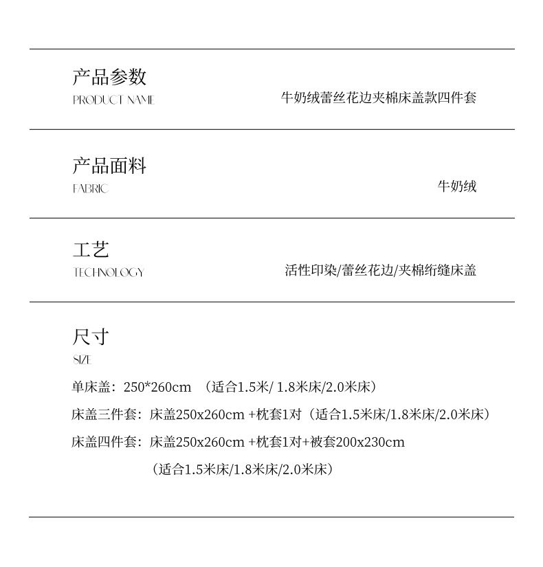 | Size specifications | 250x260cm single bed cover,260x270cm single bed cover,250x260cm bed cover + 2 pillowcases,260x270cm bed cover + 2 pillowcases,1.5 bed cover four-piece set-quilt cover 200*230,1.8 bed cover four-piece set-quilt cover 200*230,Extra large 2.0 bed cover four-piece set-quilt cover 2.2*2.4 |