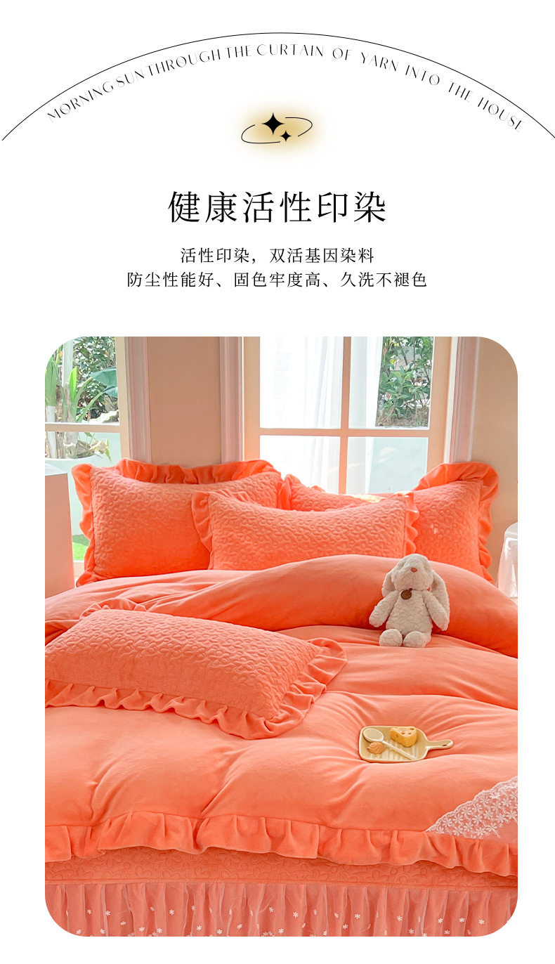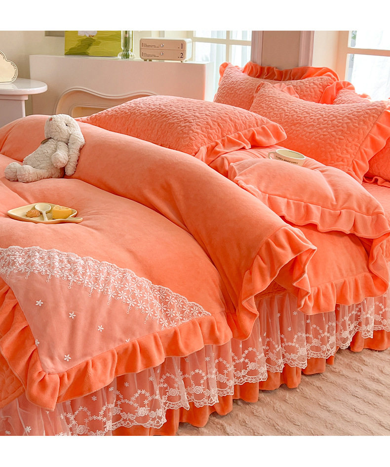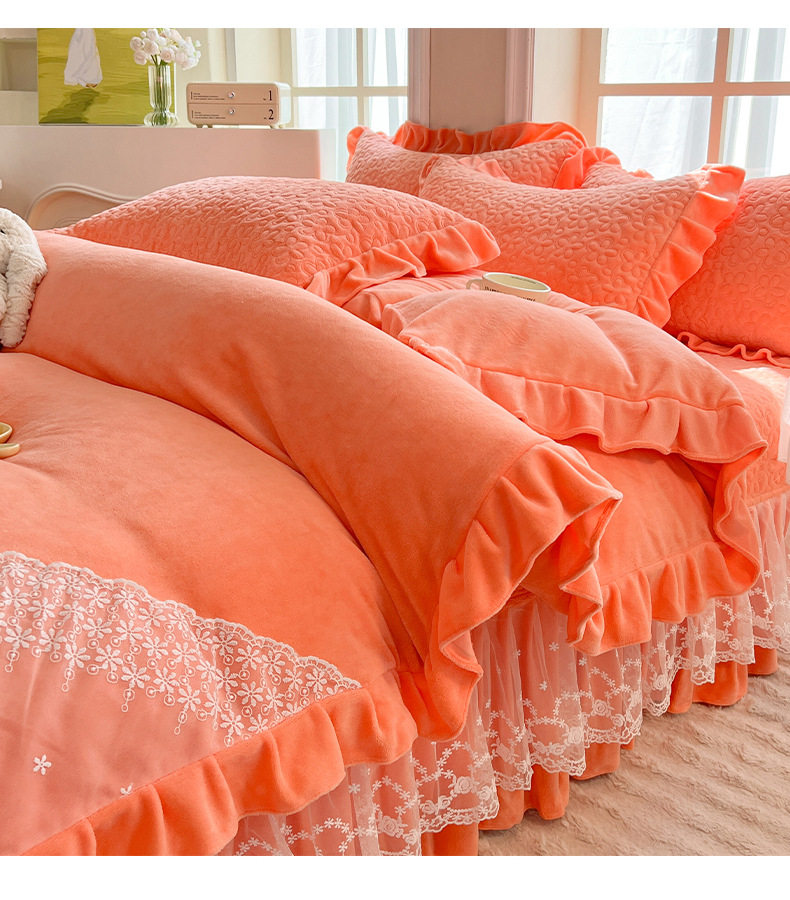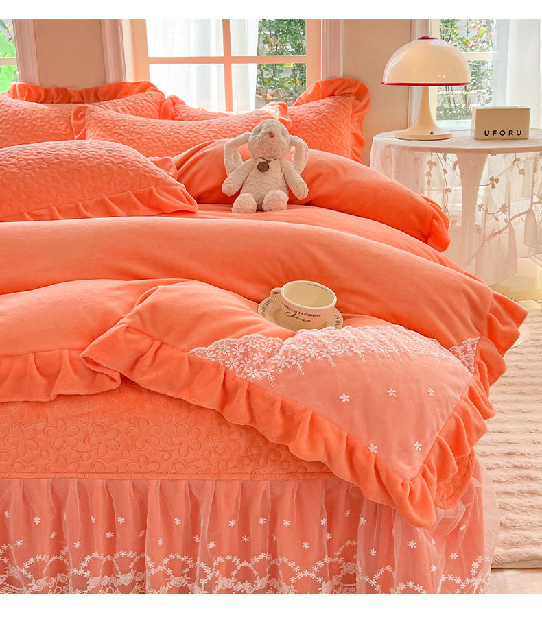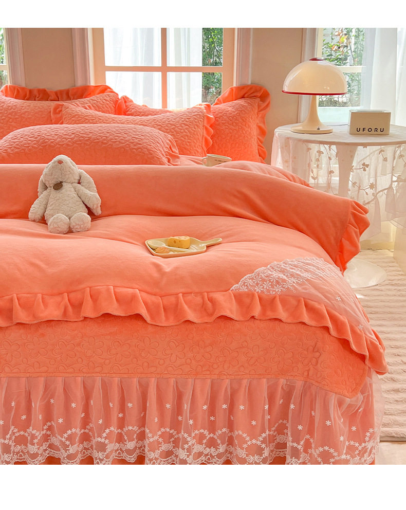 Double-Sided Milk Velvet Four-Piece Bed Set, New Single Bed Cover, Bed Skirt, Lace Winter Fleece-Lined Thickeneded Coral Velvet Quilt Cover