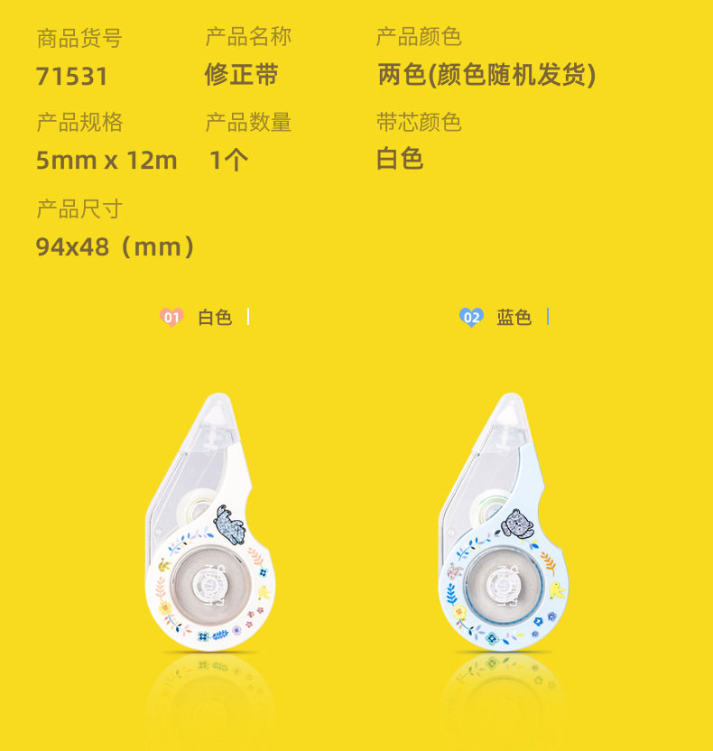 | Specifications | Deli 71531 correction tape_5mmx12m film tape (mixed) (card) |