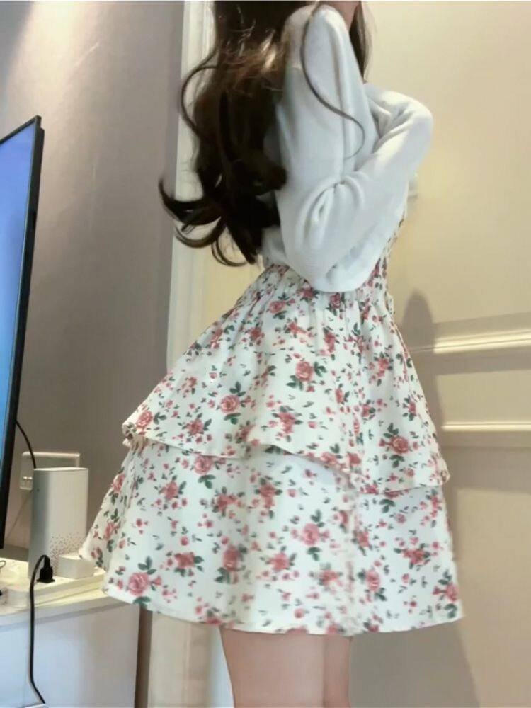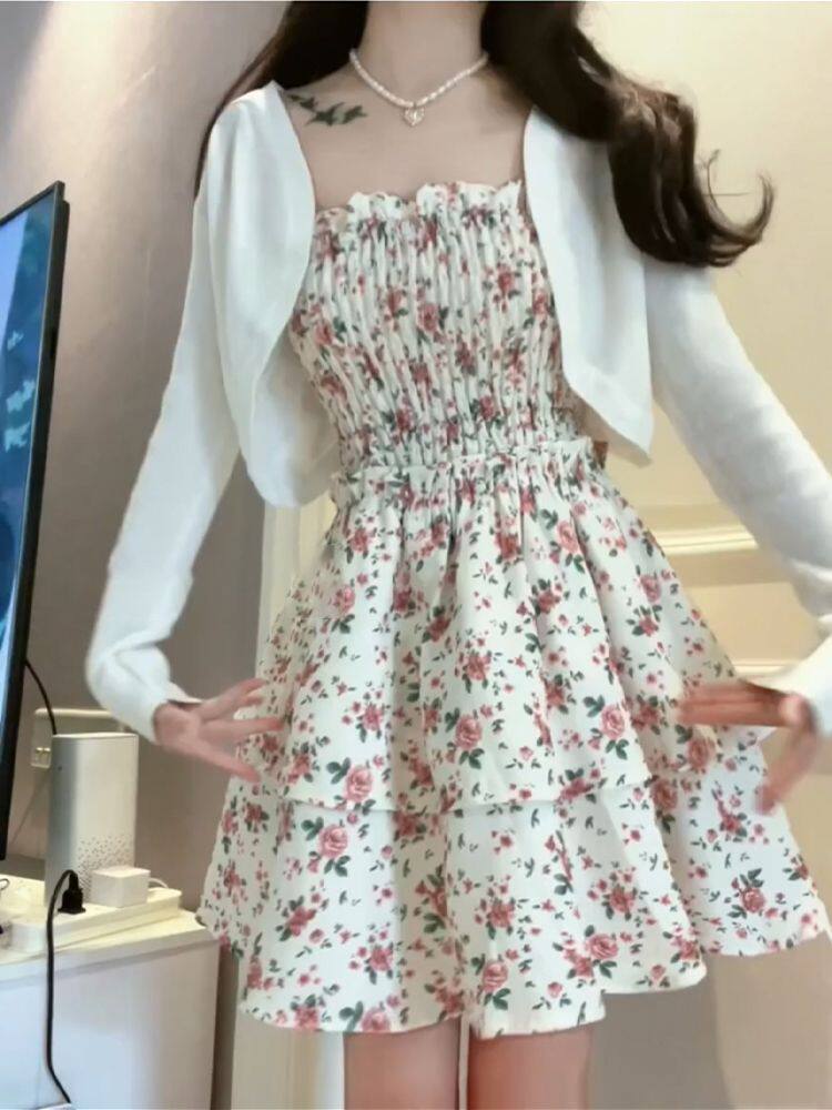 Suit for Women 2025 New Summer Style Sweet Waist Floral Suspender Dress A-Line Skirt Cardigan Top Two-Piece Set