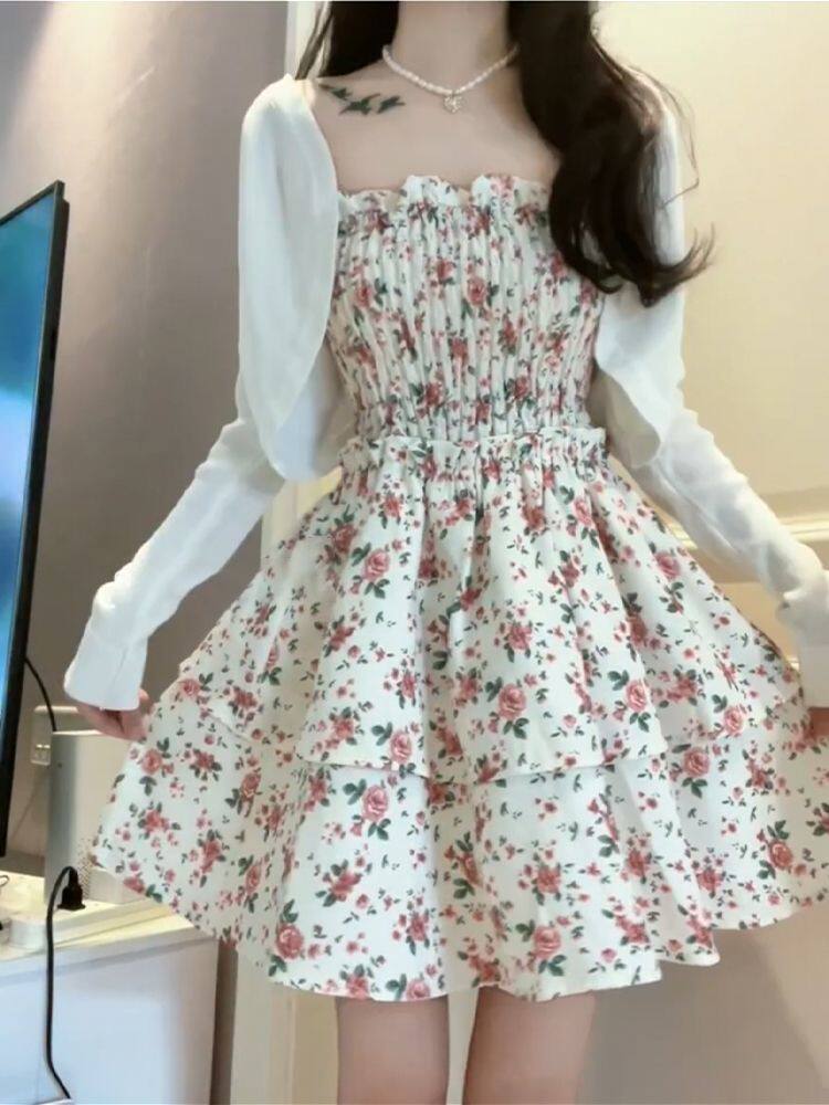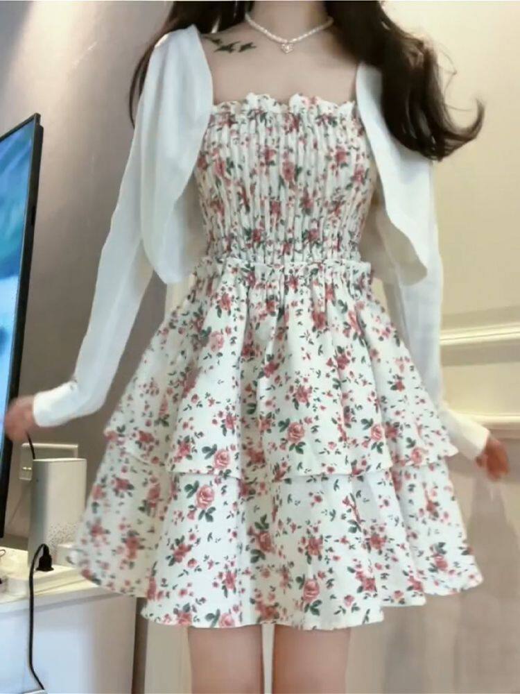 | Color | Floral suspender dress+outwear two-piece set,Floral suspender dress single piece,Jacket - single item |