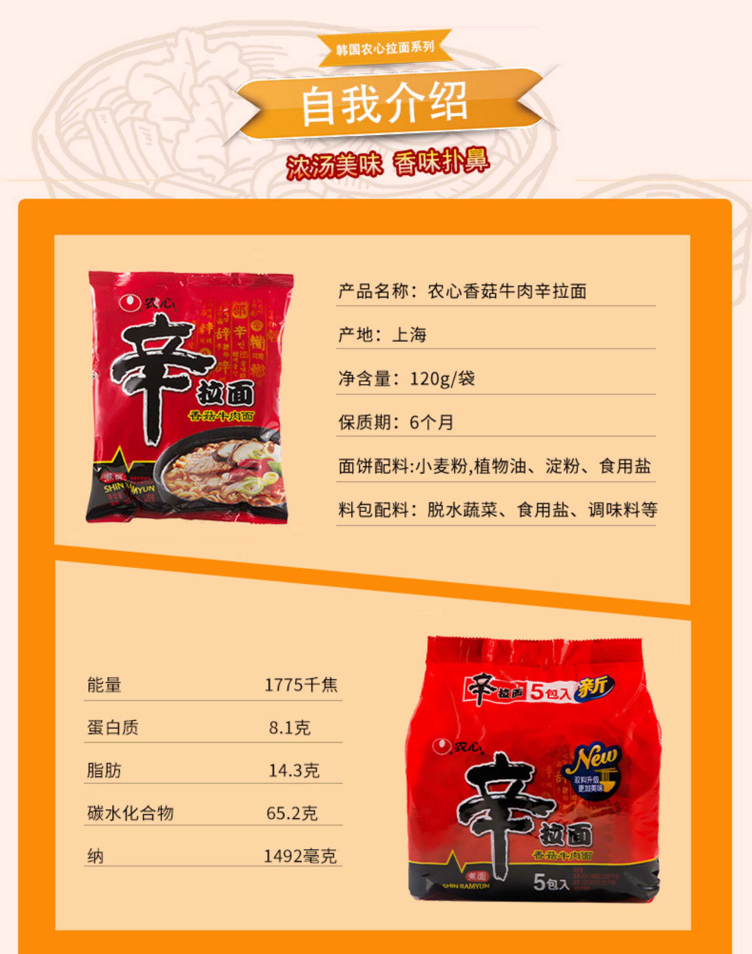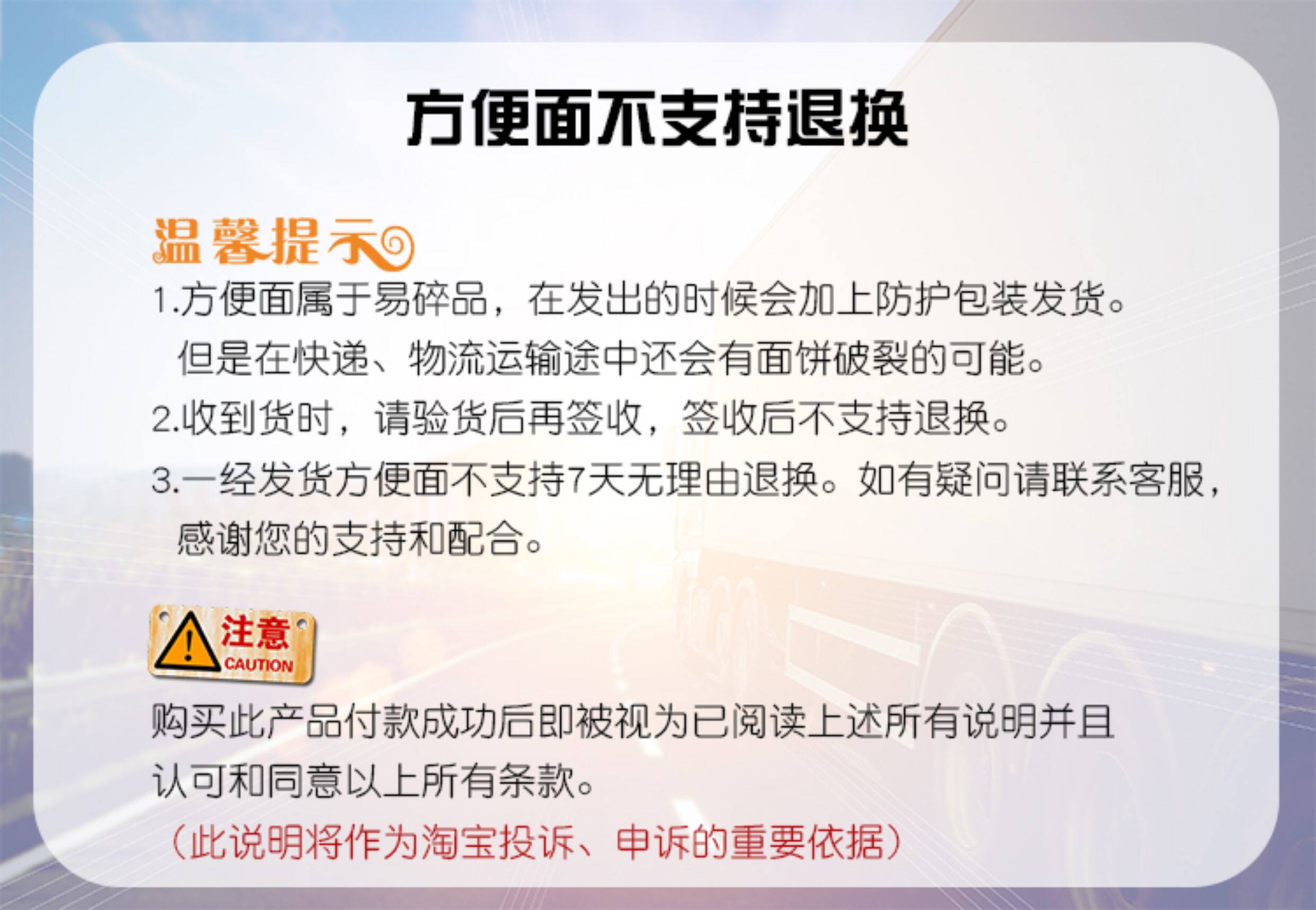 | Packaging specifications | Meiyuan 200g udon noodles*30 bags full box,[new date] mushroom beef flavor 120g*40 bags,Spicy cabbage noodle soup*40 bags,Army pot cheese flavor*32 bags,[june production] hot and sour ham flavor 118g*32 bags,Curry ramen 116g*40 bags,Spicy cabbage noodles 132g*40 bags,Spicy cabbage cheese flavor 120g*40 bags,Shanghai soup noodles seafood flavor 117.8g*40 bags,Shanghai soup noodles chicken flavor 114.5g*40 bags,Stone pot beef ramen 120g*40 bags,Potato and pork ribs ramen 120g*40 bags,Oolong noodles 120g*40 bags,Shrimp flavored spicy ramen 120g*40 bags,Nongshim ramen ramen 120g*40 bags,30 bags of mushroom noodles + 10 bags of young man’s spicy spicy noodles,Nongshim spicy cabbage noodles 30 bags + 10 bags of young man magic,Meiyuan 180g chezi noodles*30 bags full box,Young man's spicy turkey noodles 136g*40 bags,Young man mushroom beef noodles 119g*40 bags,Young man spicy cabbage ramen 122g*40 bags |