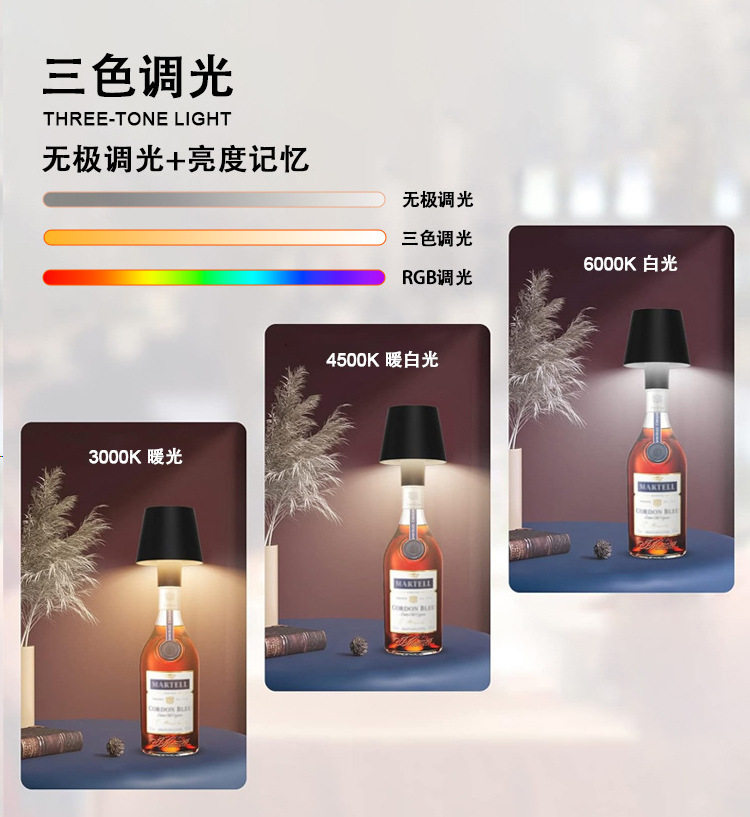 | Function | Three-color dimming rgb colored light stepless dimming touch touch charging lamp ornaments decoration bottle stopper wine head lamp metal iron art dimmable |