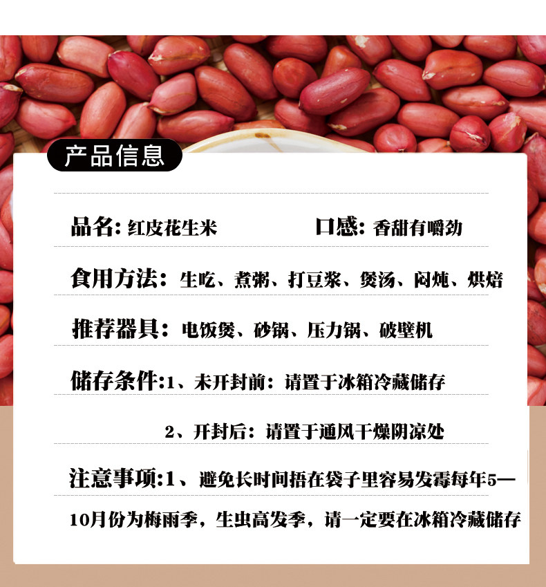 | Packaging specifications | Yunnan red-skinned peanuts 250g*1 bag (for tasting),Colorful navro red peanut rice 500g (regular),Colorful navro red peanut rice 1000g (affordable),Colorful navro red peanut rice 1500g (stock up),Colorful navro red peanut rice 2500g (wholesale),Colorful navro red peanut rice 500g*2 bags,Colorful navro red peanut rice 500g*3 bags,Colorful navro red peanut rice 500g*5 bags,Vacuum colorful navro red skin peanuts 500g*1 bag,(vacuum square brick) red skin peanuts 500g*2 bags,(vacuum square brick) red skin peanuts 500g*3 bags,(vacuum square brick) red skin peanuts 500g*5 bags |