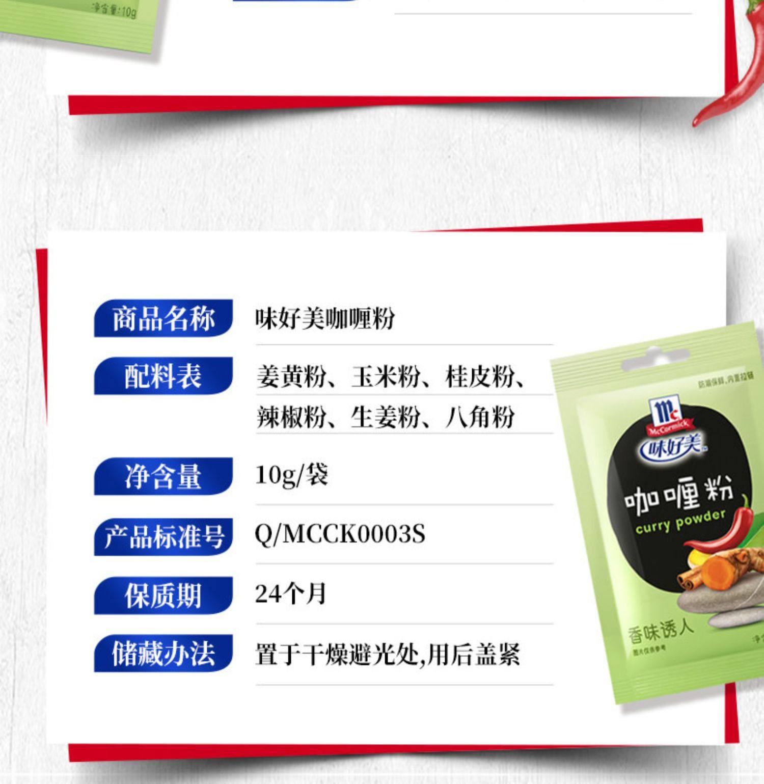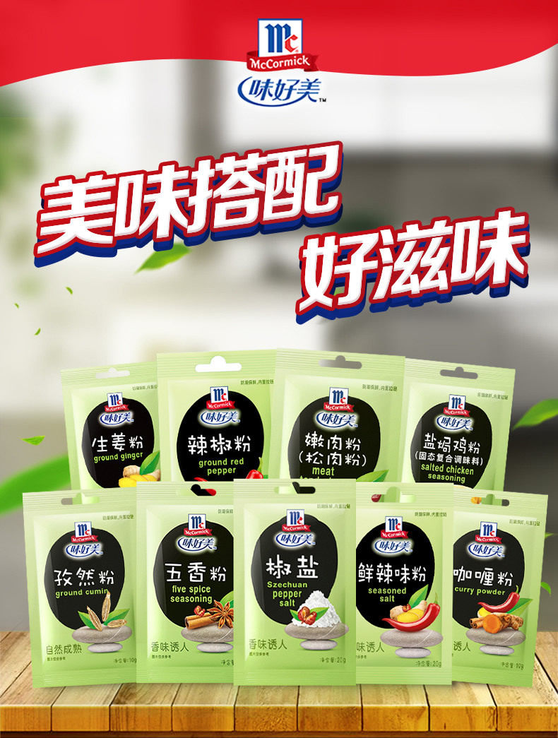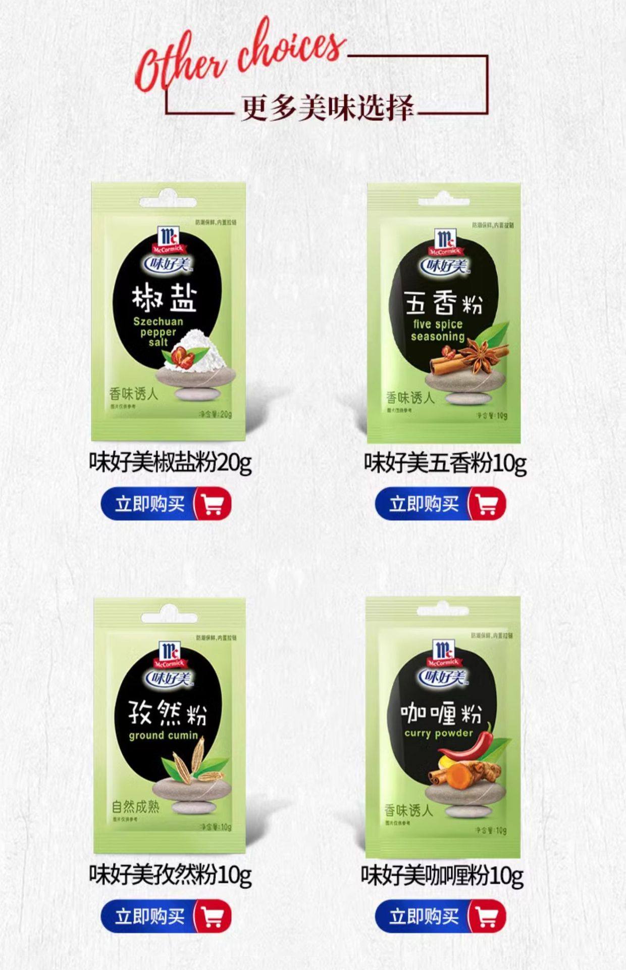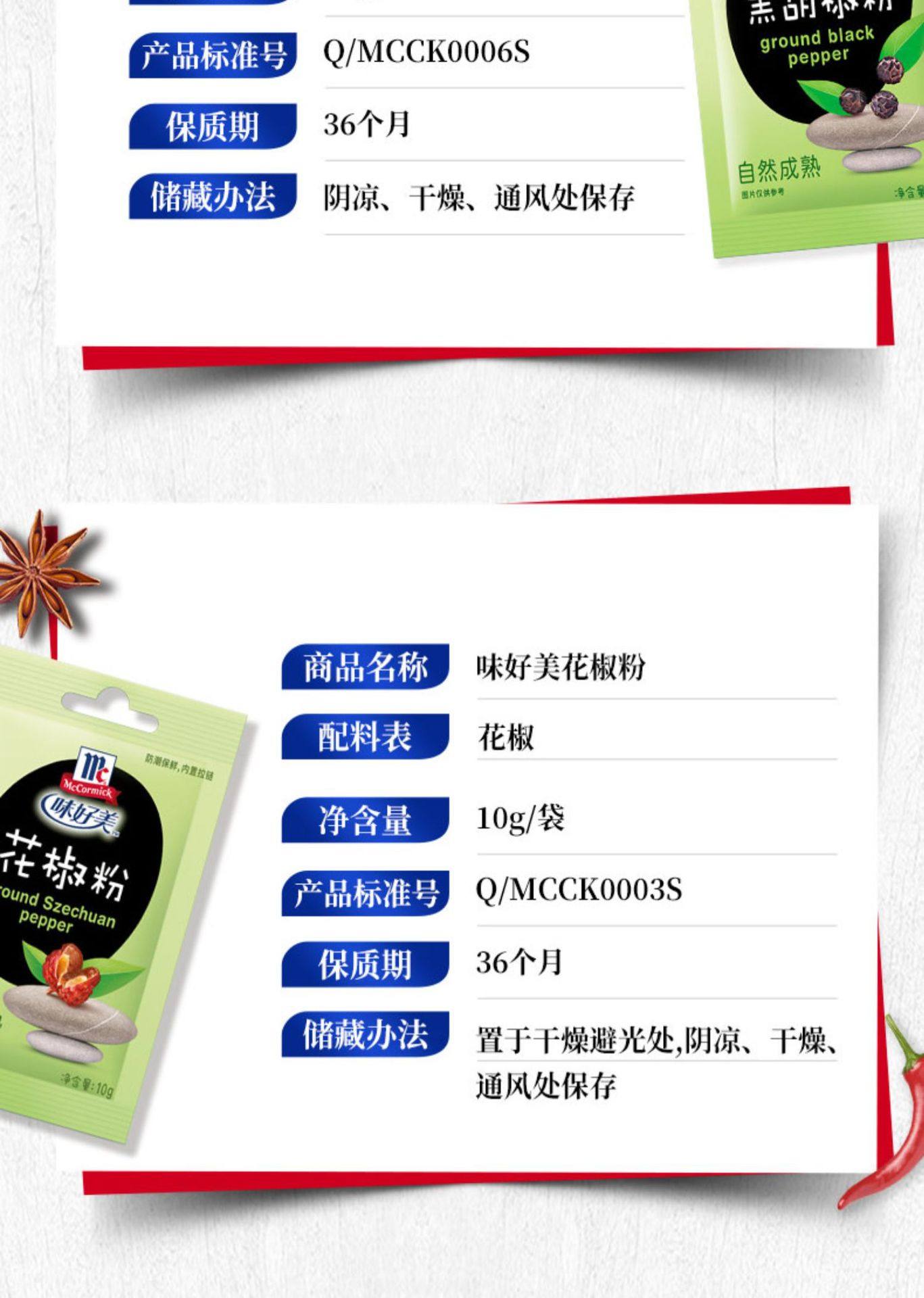Packaging specifications §chili powder 10g ⚑ ⚑,§white pepper powder 10g ⚑ ⚑,§black pepper powder 10g ⚑ ⚑,§zanthoxylum bungeanum powder 10g ⚑ ⚑,§five-spice powder 10g ⚑ ⚑,§ginger powder 10g ⚑ ⚑,§cumin powder 10g ⚑ ⚑,§curry powder 10g ⚑ ⚑,§fresh spicy powder 10g ⚑ ⚑,§tender meat powder 20g ⚑ ⚑,§salt and pepper powder 20g ⚑ ⚑,§salt-baked chicken powder 20g ⚑ ⚑