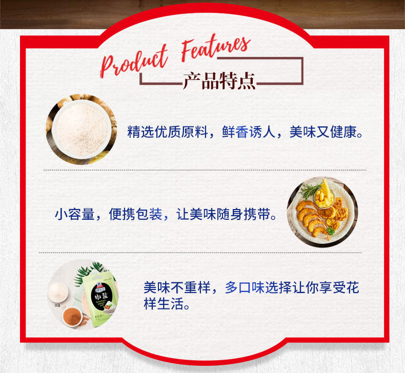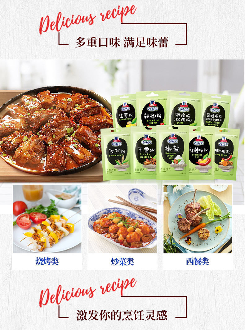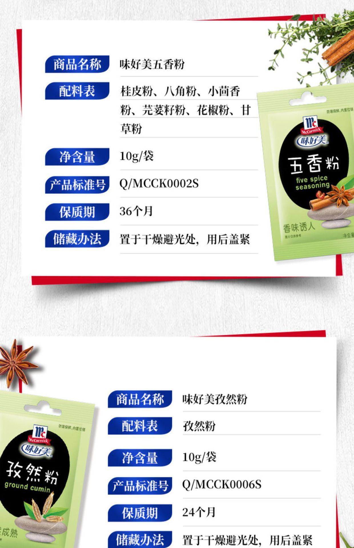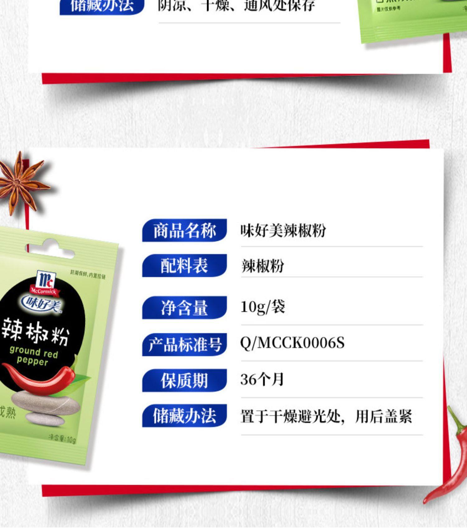 Packaging specifications §chili powder 10g ⚑ ⚑,§white pepper powder 10g ⚑ ⚑,§black pepper powder 10g ⚑ ⚑,§zanthoxylum bungeanum powder 10g ⚑ ⚑,§five-spice powder 10g ⚑ ⚑,§ginger powder 10g ⚑ ⚑,§cumin powder 10g ⚑ ⚑,§curry powder 10g ⚑ ⚑,§fresh spicy powder 10g ⚑ ⚑,§tender meat powder 20g ⚑ ⚑,§salt and pepper powder 20g ⚑ ⚑,§salt-baked chicken powder 20g ⚑ ⚑