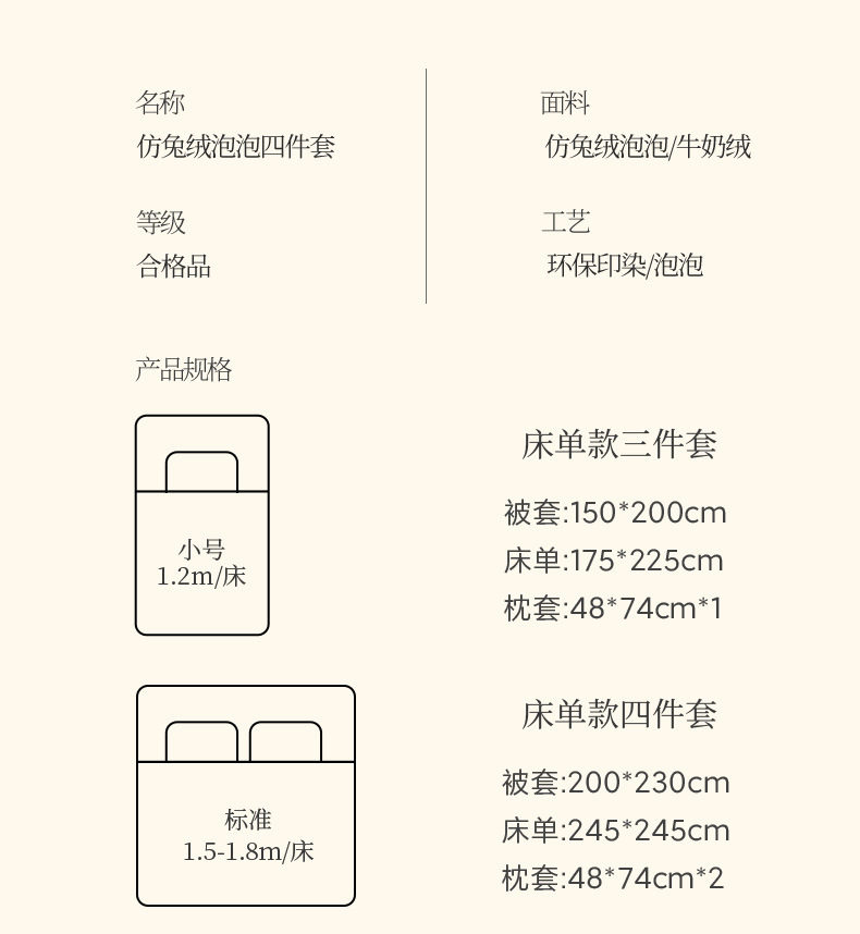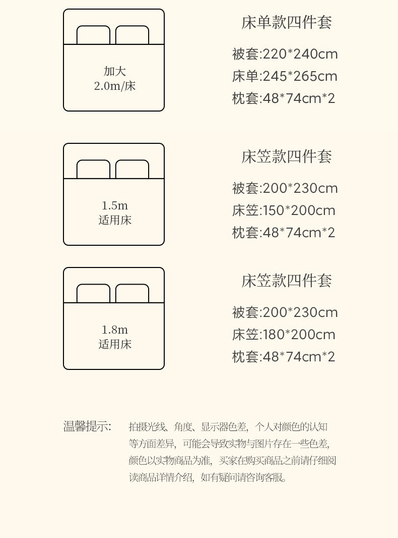 | Size specifications | 1.2m bed sheet three-piece set,1.5m bed sheet four-piece set,1.8m bed sheet four-piece set,2.0m bed sheet four-piece set,1.5m fitted sheet set of four,1.8m fitted sheet set of four |