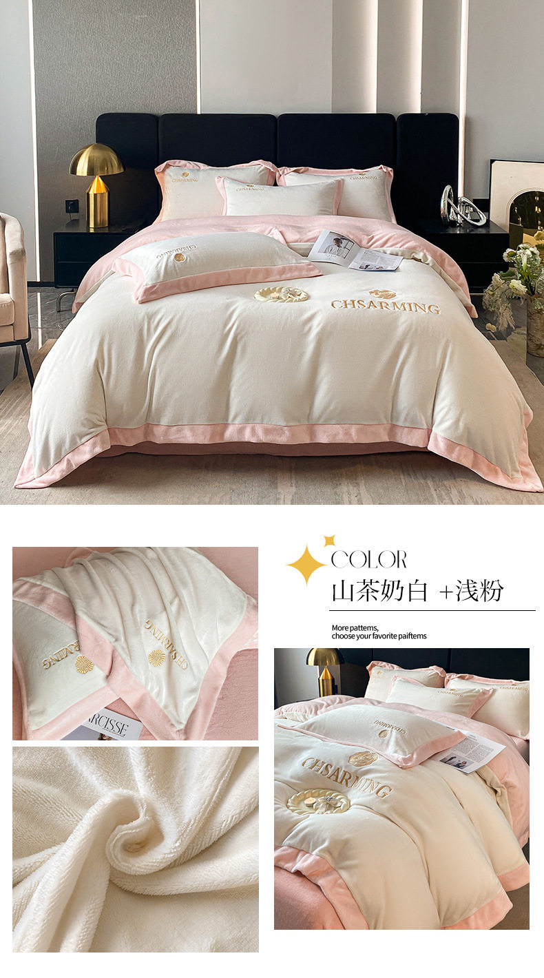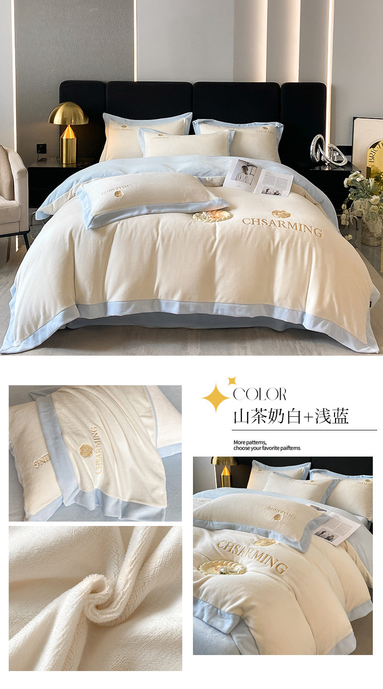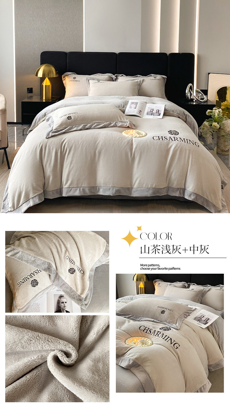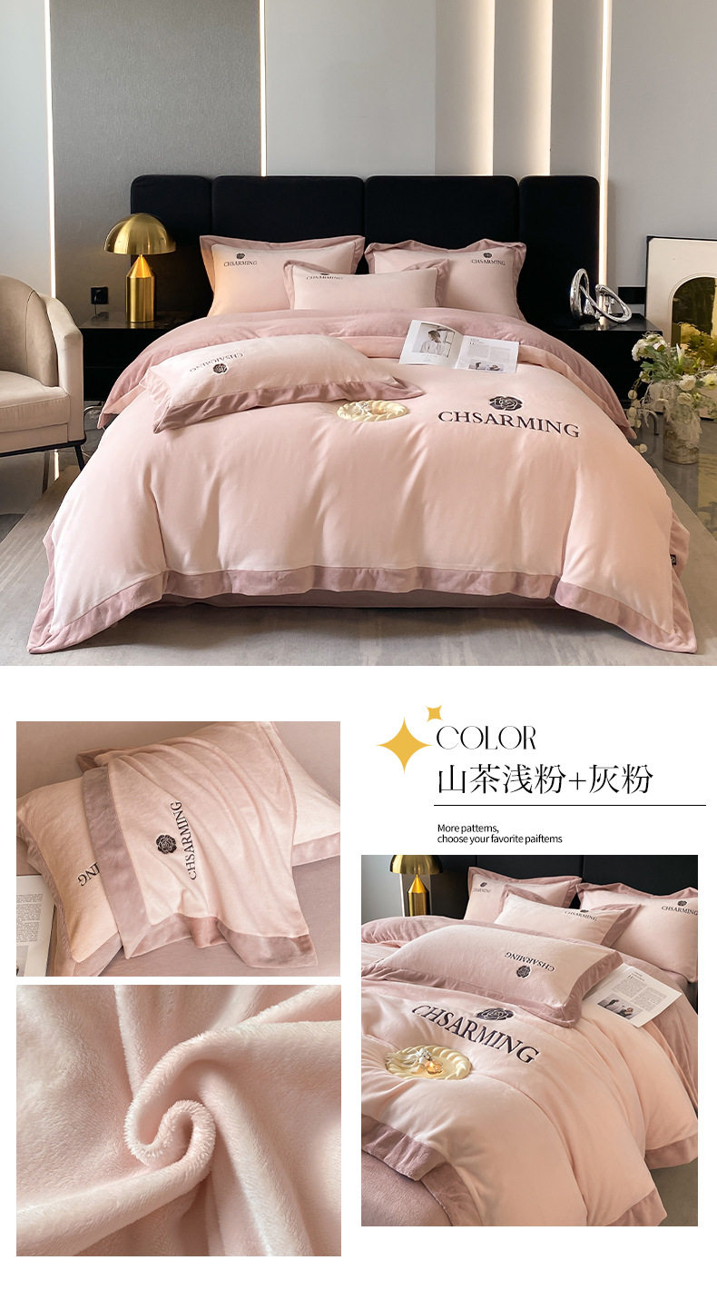 Advanced Version of High-Density Matte Wide-Brimmed Pure Color Milk Velvet Four-Piece Set with Double Embroidery Skin-Friendly and Warm Bedding Set