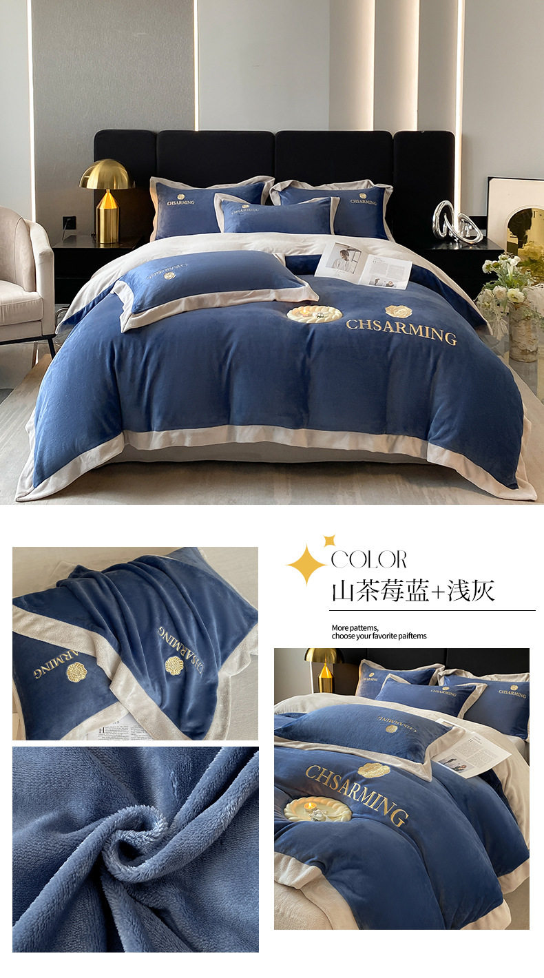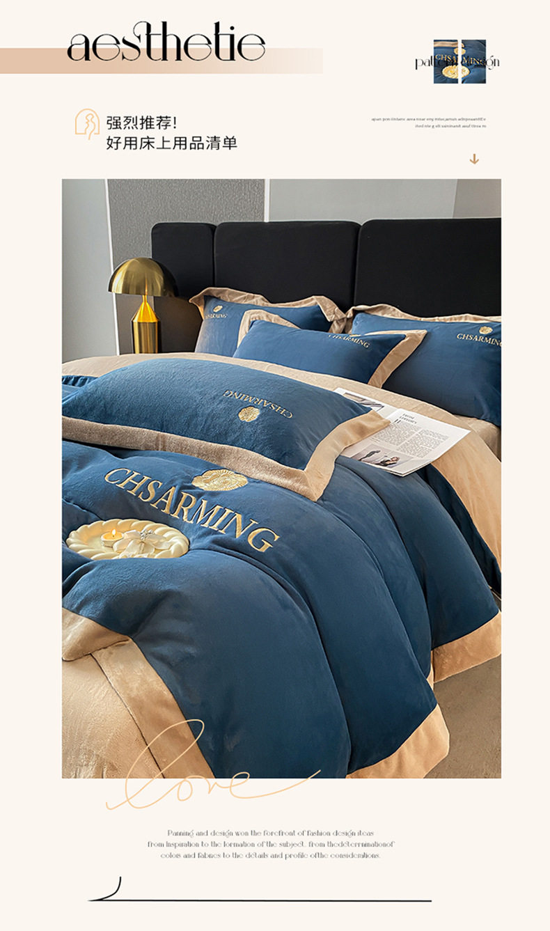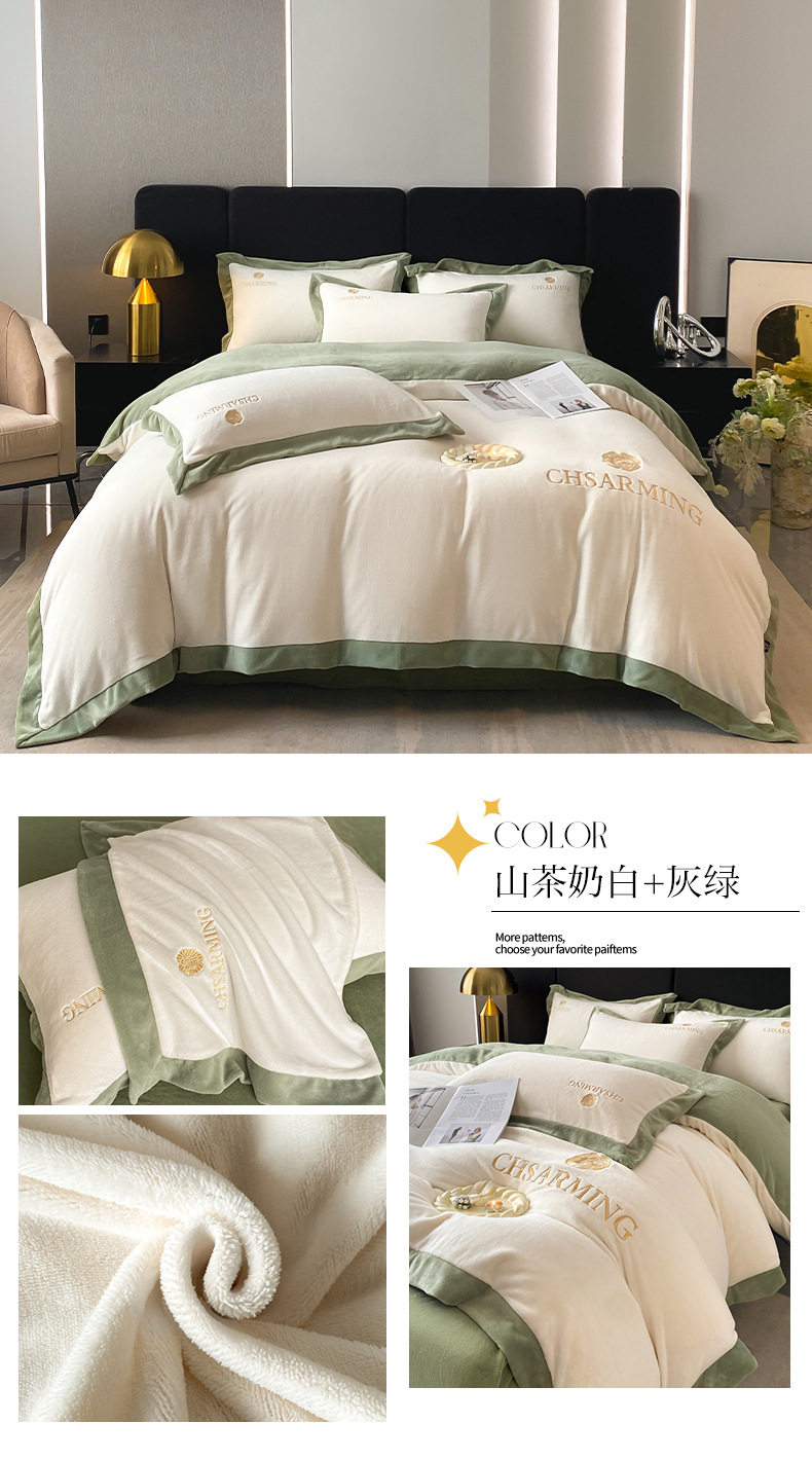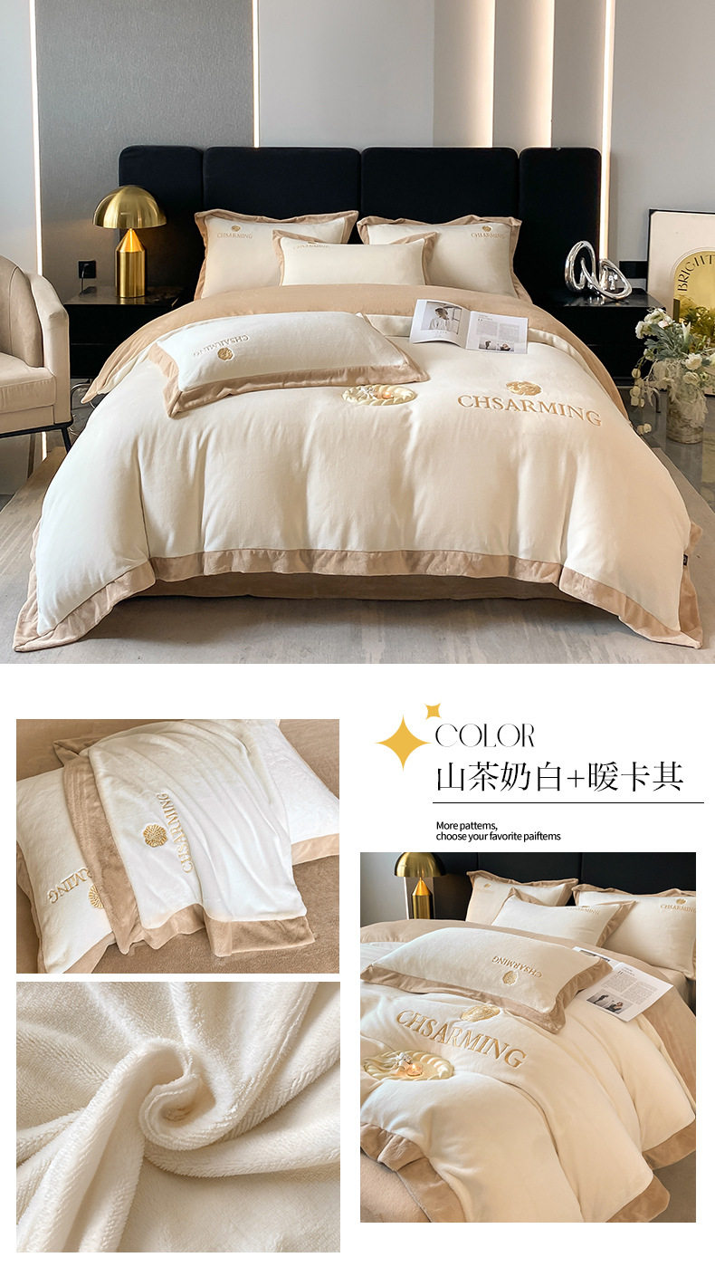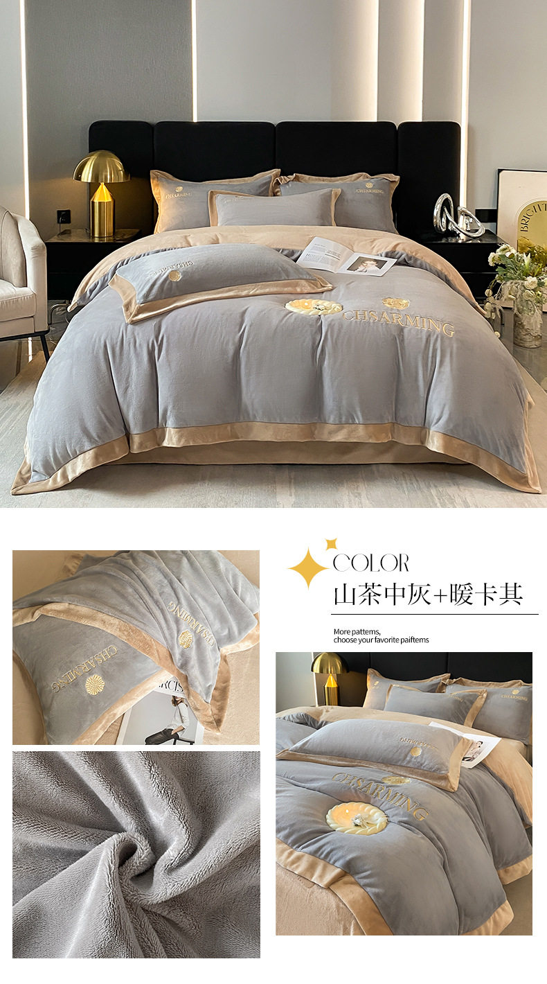 Advanced Version of High-Density Matte Wide-Brimmed Pure Color Milk Velvet Four-Piece Set with Double Embroidery Skin-Friendly and Warm Bedding Set