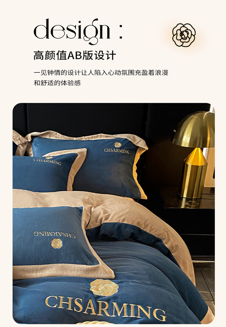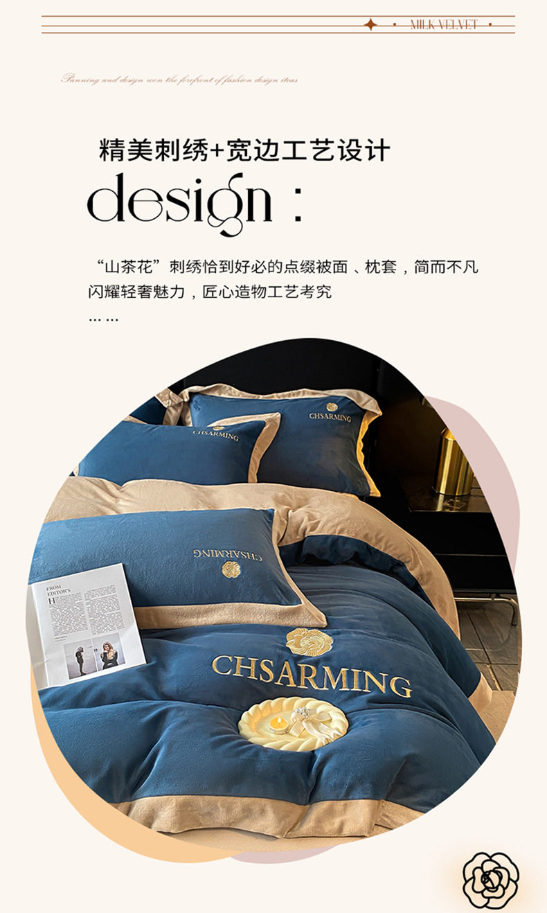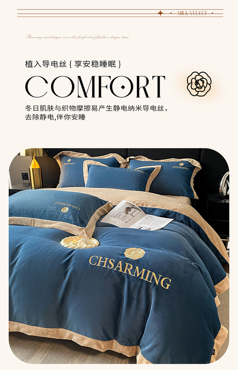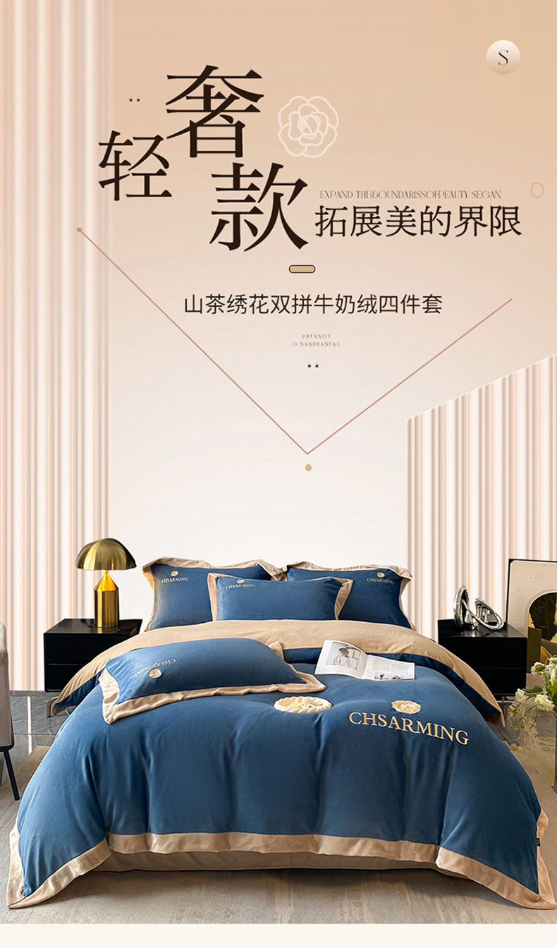 Advanced Version of High-Density Matte Wide-Brimmed Pure Color Milk Velvet Four-Piece Set with Double Embroidery Skin-Friendly and Warm Bedding Set
