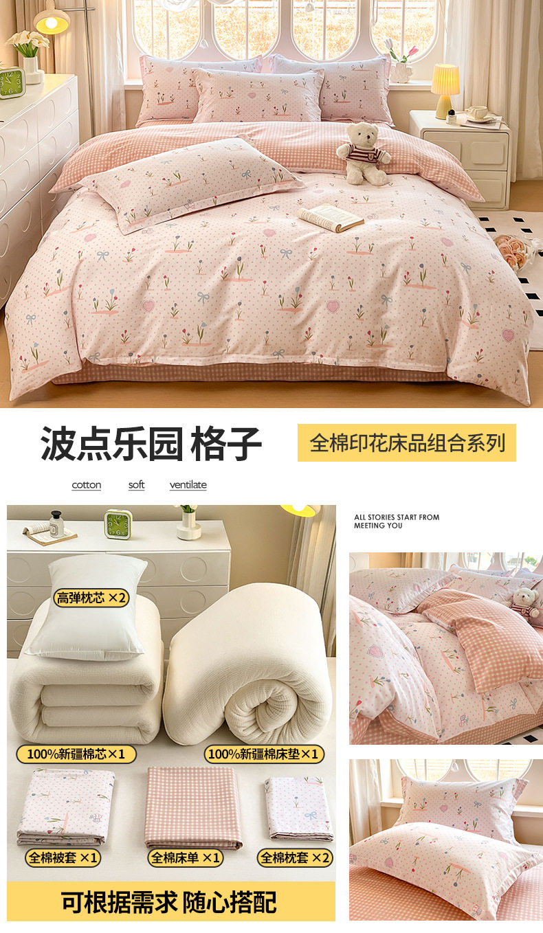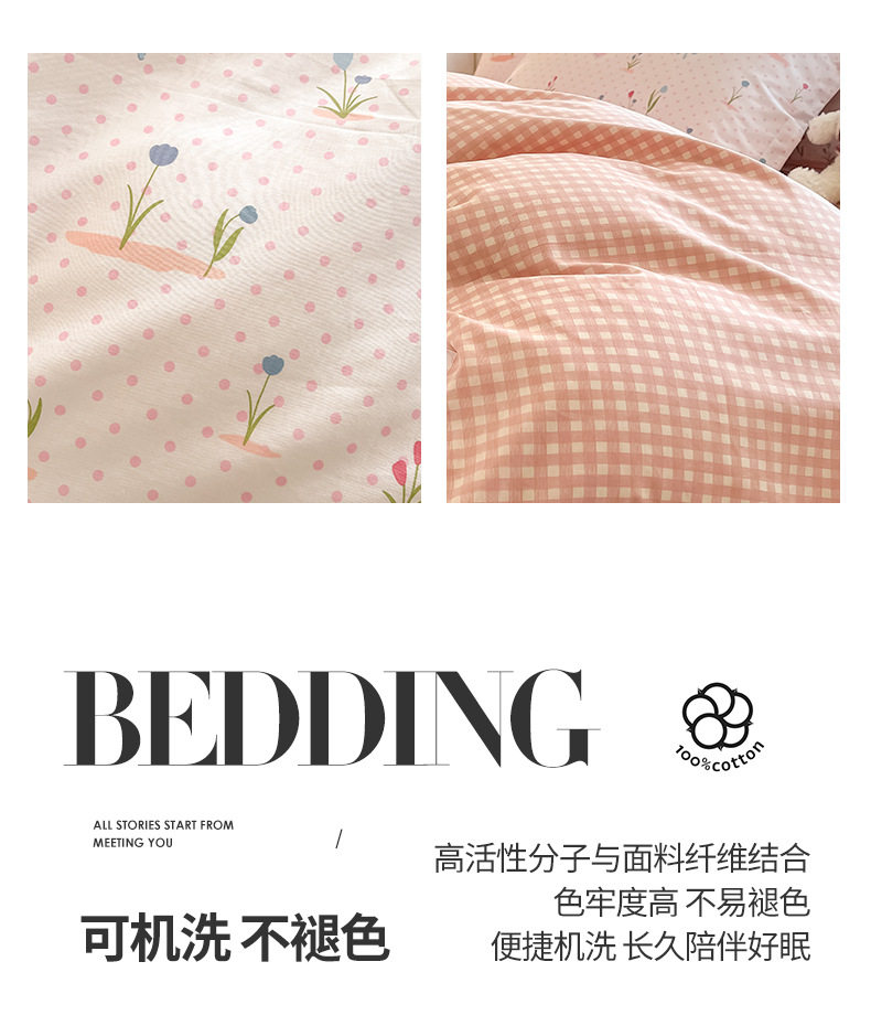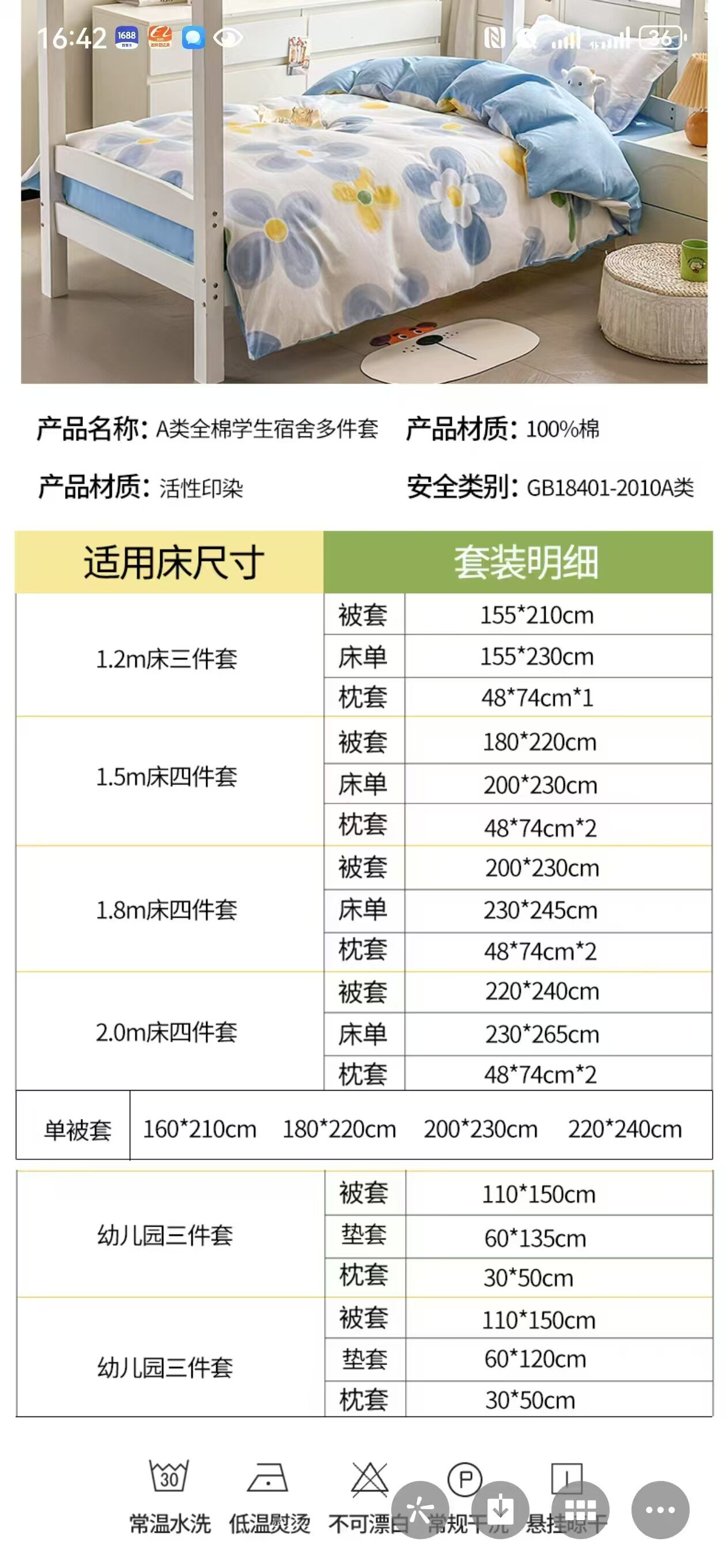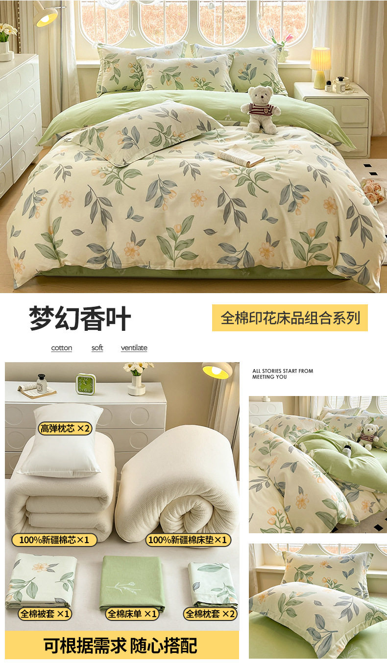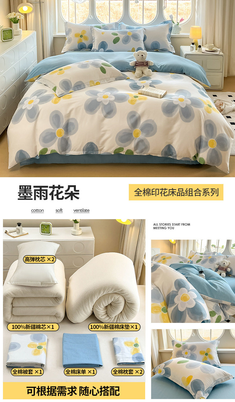 | Size specifications | 0.9m bed sheet student three-piece set,1.2m bed sheet student three-piece set,1.5m bed sheet double four-piece set,1.8m bed sheet double four-piece set,2.0m bed sheet double four-piece set |