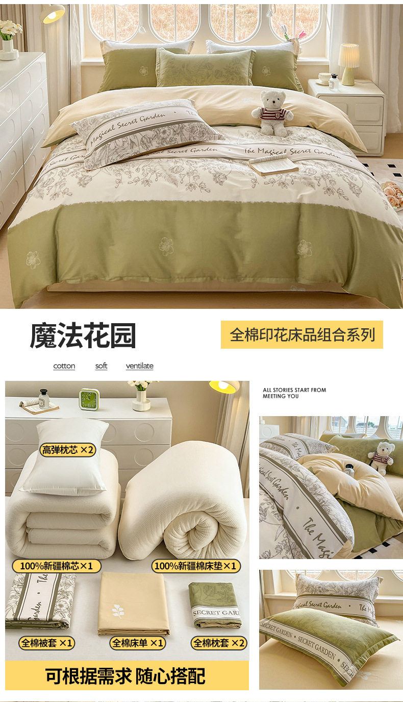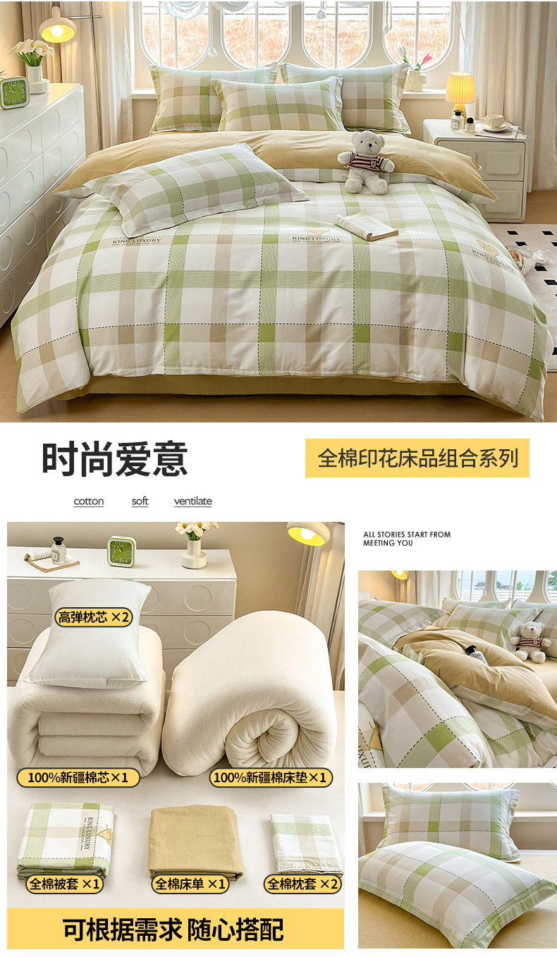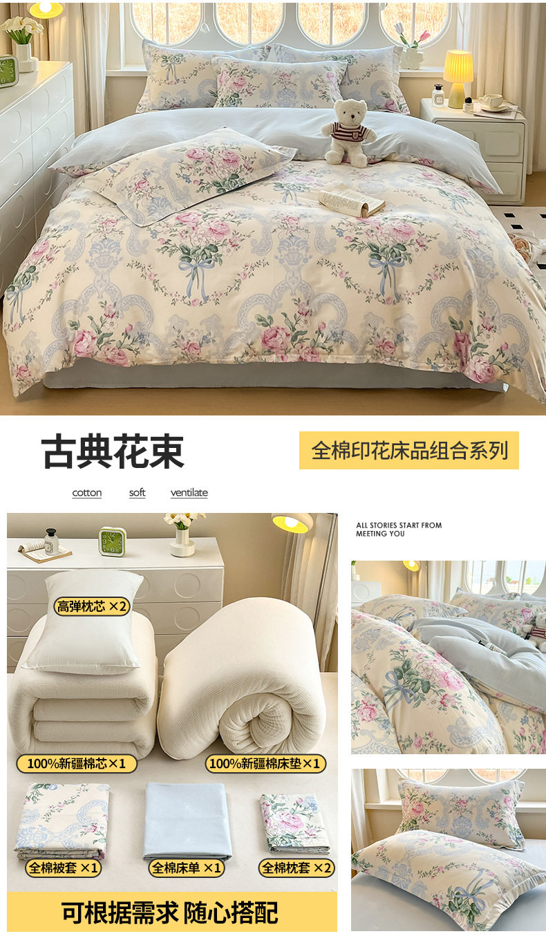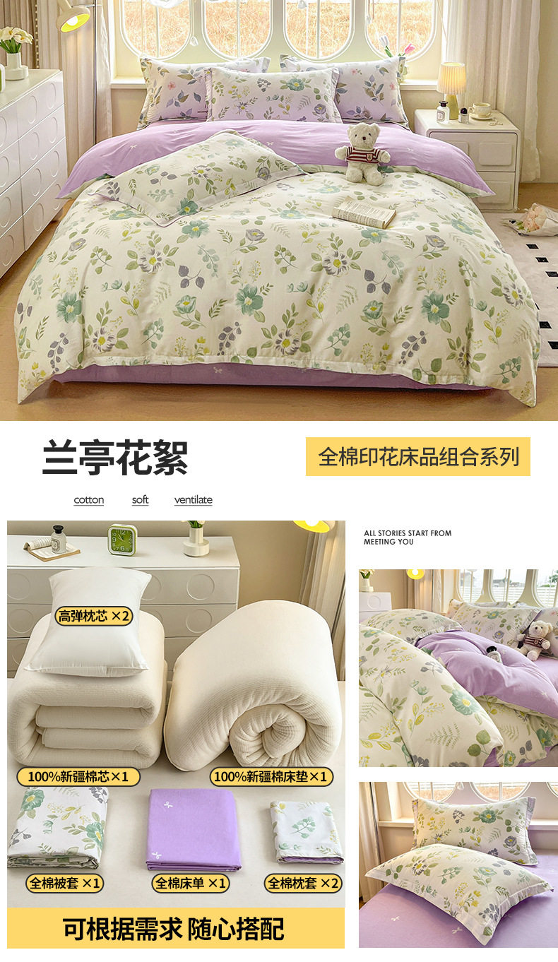 | Size specifications | 0.9m bed sheet student three-piece set,1.2m bed sheet student three-piece set,1.5m bed sheet double four-piece set,1.8m bed sheet double four-piece set,2.0m bed sheet double four-piece set |