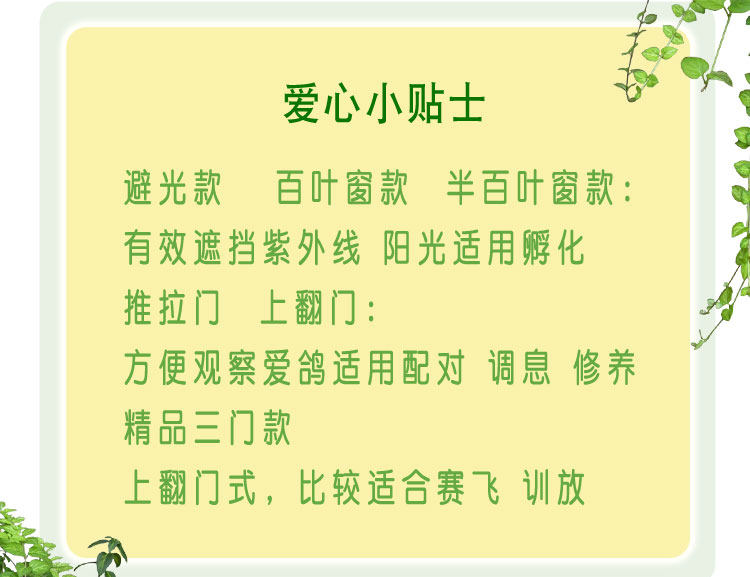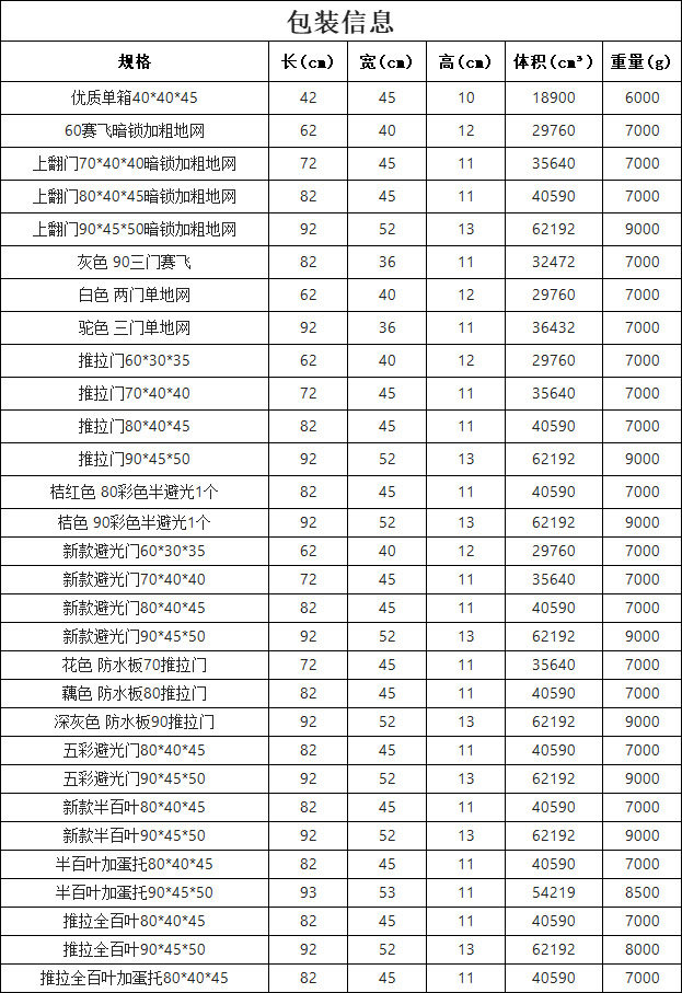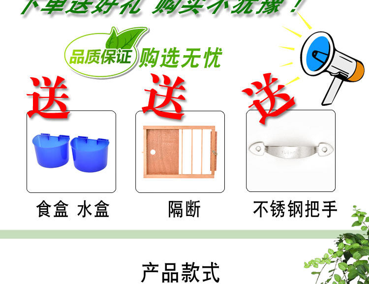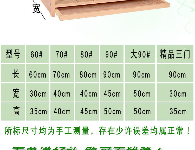 | Specifications | High quality single box 40*40*45,60 saifei concealed lock thickened ground net,Flip-up door 70*40*40 concealed lock thickened ground net,Flip-up door 80*40*45 concealed lock thickened ground net,Flip-up door 90*45*50 concealed lock thickened ground net,Gray 90 three-door racing,White two-door single floor network,Camel three-door single floor network,Sliding door 60*30*35,Sliding door 70*40*40,Sliding door 80*40*45,Sliding door 90*45*50,Orange 80 color semi-shading 1 piece,Orange 90 color semi-shading 1 piece,New light-proof door 60*30*35,New light-proof door 70*40*40,New light-proof door 80*40*45,New light-proof door 90*45*50,Color waterproof board 70 sliding door,Lotus color waterproof board 80 sliding door,Dark gray waterproof panel 90 sliding door,Colorful light-proof door 80*40*45,Colorful light-proof door 90*45*50,New half louver 80*40*45,New half louver 90*45*50,Half louver plus egg tray 80*40*45,Half louver plus egg tray 90*45*50,Push-pull full louver 80*40*45,Push-pull full louver 90*45*50,Push-pull full louver plus egg tray 80*40*45,Push-pull full louver plus egg tray 90*45*50,Chocolate color 90*50*50 fully waterproof board,New fully waterproof with egg tray and pedals |