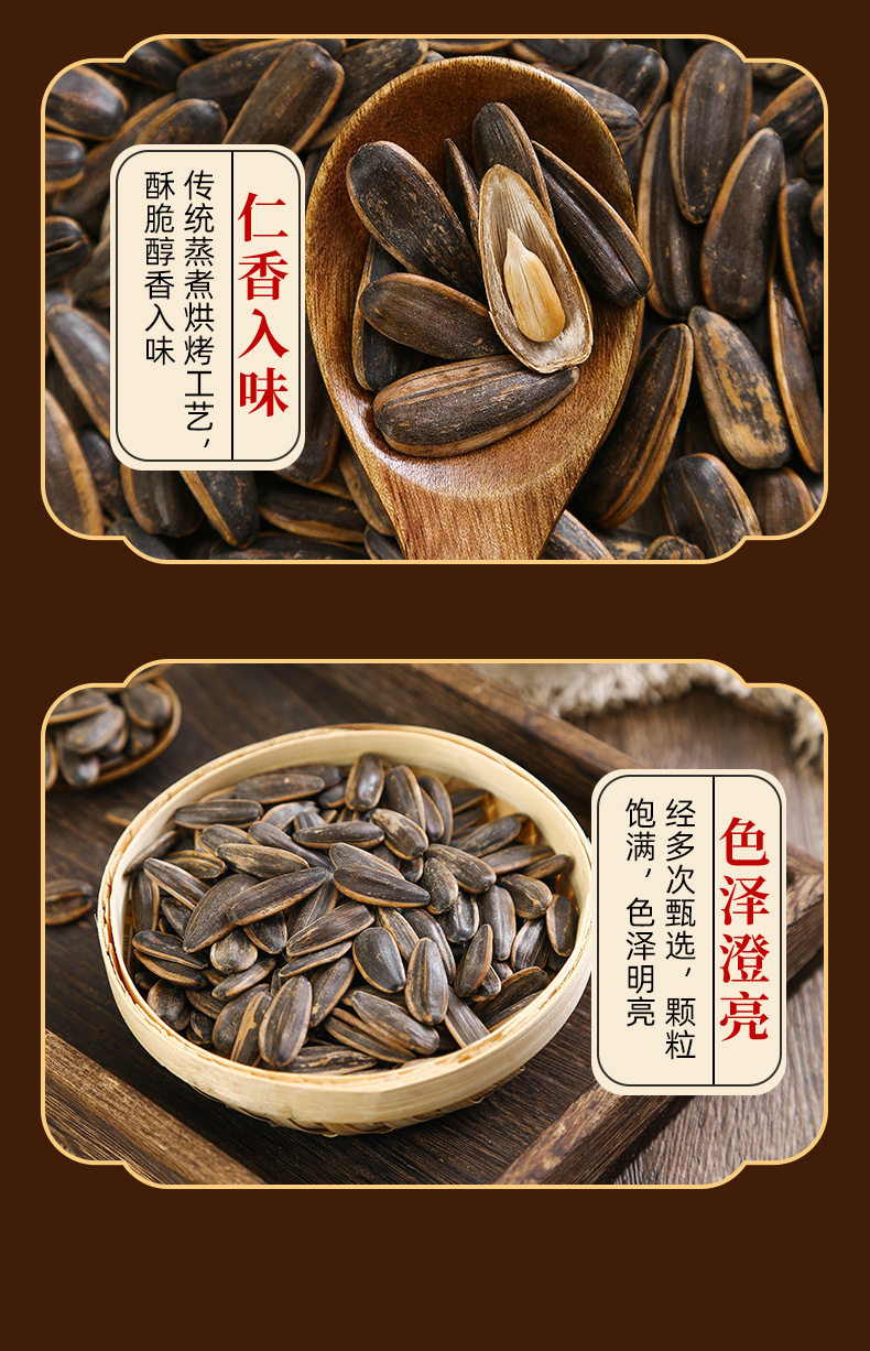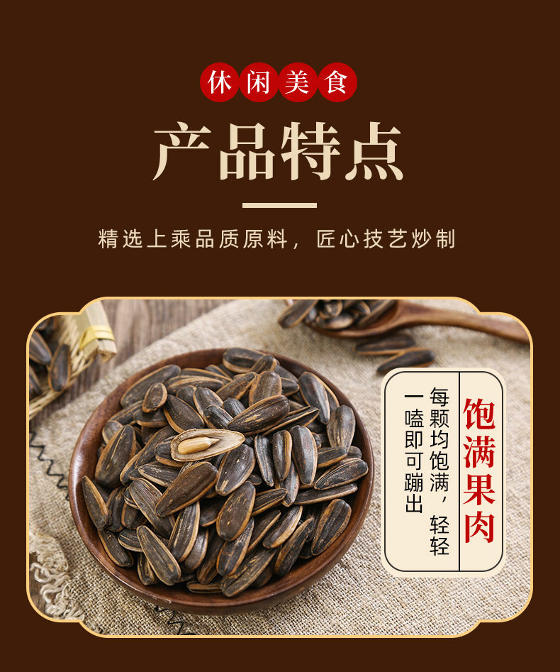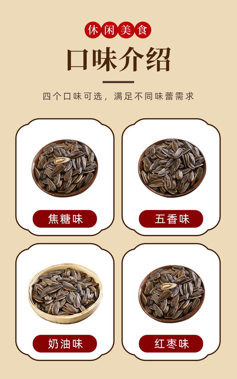 | Packaging specifications | Original melon seeds bagged net weight 250g,Caramel flavored melon seeds bagged net weight 250g,Walnut flavored melon seeds bagged net weight 250g,Red date flavored melon seeds bagged net weight 250g,Five-flavor bag, net weight 250g,Creamy bag, net weight 250g,Original melon seeds box 5kg,Caramel flavored melon seeds box 5kg,Walnut flavored melon seeds box 5kg,Red date flavored melon seeds box 5kg,Five-flavored melon seeds box 5kg,Creamy melon seeds box 5kg,Creamy peanuts bag net weight 250g,Garlic peanuts bag net weight 250g,Walnut flavored peanuts bagged net weight 250g,Creamy peanuts box 5kg,Garlicky peanuts box 5kg,Walnut flavored peanuts box 5kg,Macadamia nuts bagged net weight 250g,Purple cashew nuts bag net weight 250g,Almond bagged net weight 250g,Pistachios bagged net weight 250g,Pecans in bags, net weight 250g,Northeastern pine nuts bagged net weight 250g,Daily nuts bag net weight 250g,Paper-skinned walnuts in bag, net weight 250g,Amber walnut kernels bagged net weight 250g,Almond kernels bagged net weight 250g,Hanging melon seeds in bag, net weight 250g,Chickpeas bagged net weight 250g,Black beans bagged net weight 250g,Golden beans bagged net weight 250g,Crab roe flavored orchid beans bag net weight 250g,Beef flavored orchid beans bagged net weight 250g,Rattan pepper flavored orchid beans bagged net weight 250g,Spicy orchid beans bag net weight 250g,Roasted peanuts in bag, net weight 250g,Drunkard peanuts bag net weight 250g,Mustard flavored macadamia nuts bagged net weight 250g,Charcoal roasted cashew nuts in bag, net weight 250g,Pumpkin seeds bagged net weight 250g,Beauty melon seeds bag net weight 250g,Watermelon seeds bagged net weight 250g,Brazilian pine nuts bagged net weight 250g,Pumpkin seeds bagged net weight 250g,Walnut kernels bagged net weight 250g,Cashew nuts in bags, net weight 250g,Pecan nuts bagged net weight 250g,Torreya bagged net weight 250g,Xiaobai apricot bag net weight 250g,Hazelnuts bagged net weight 250g,Abalone fruit bagged net weight 250g,Hazelnut kernels bagged net weight 250g,Pistachio nuts bagged net weight 250g,Macadamia nuts bagged net weight 250g,Garlic sprouts and green beans in bag, net weight 250g,Crab melon and melon seeds bagged net weight 250g,Crispy rice crispy rice bagged net weight 250g,Small twist seaweed flavor bag net weight 250g,Thai fried rice bagged net weight 250g,Salad french fries bagged net weight 250g,Multi-flavor peanuts bagged net weight 250g,Red date rings bag net weight 250g,Red dates bagged net weight 250g,Dates bagged net weight 500g,Dried mango bagged net weight 500g,Banana chips bagged net weight 500g,Dried sweet potatoes in bags, net weight 500g,Dried strawberries bagged net weight 500g,Dried yellow peaches in bags, net weight 500g,Dried apricots in bags, net weight 500g,Dried apples in bags, net weight 500g,Dried pineapple bagged net weight 500g,Dried cranberries bagged net weight 500g,Dried kiwi fruit bagged net weight 500g,Prunes in bags, net weight 500g,Hawthorn strips bagged net weight 500g,Raisins bagged net weight 500g,Four-color raisins in bags, net weight 500g,Hawthorn rings bagged net weight 500g,Hua mei bagged net weight 500g,Licorice kumquat bagged net weight 500g,Dried figs bagged net weight 500g,Plum strips in bag, net weight 500g,Fruit and vegetable crisps bagged net weight 200g,Freeze-dried strawberries in bags, net weight 150g,Dried jackfruit bagged net weight 150g |