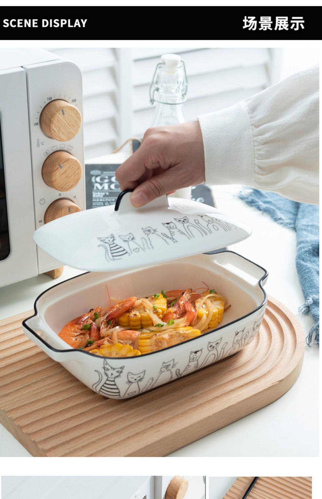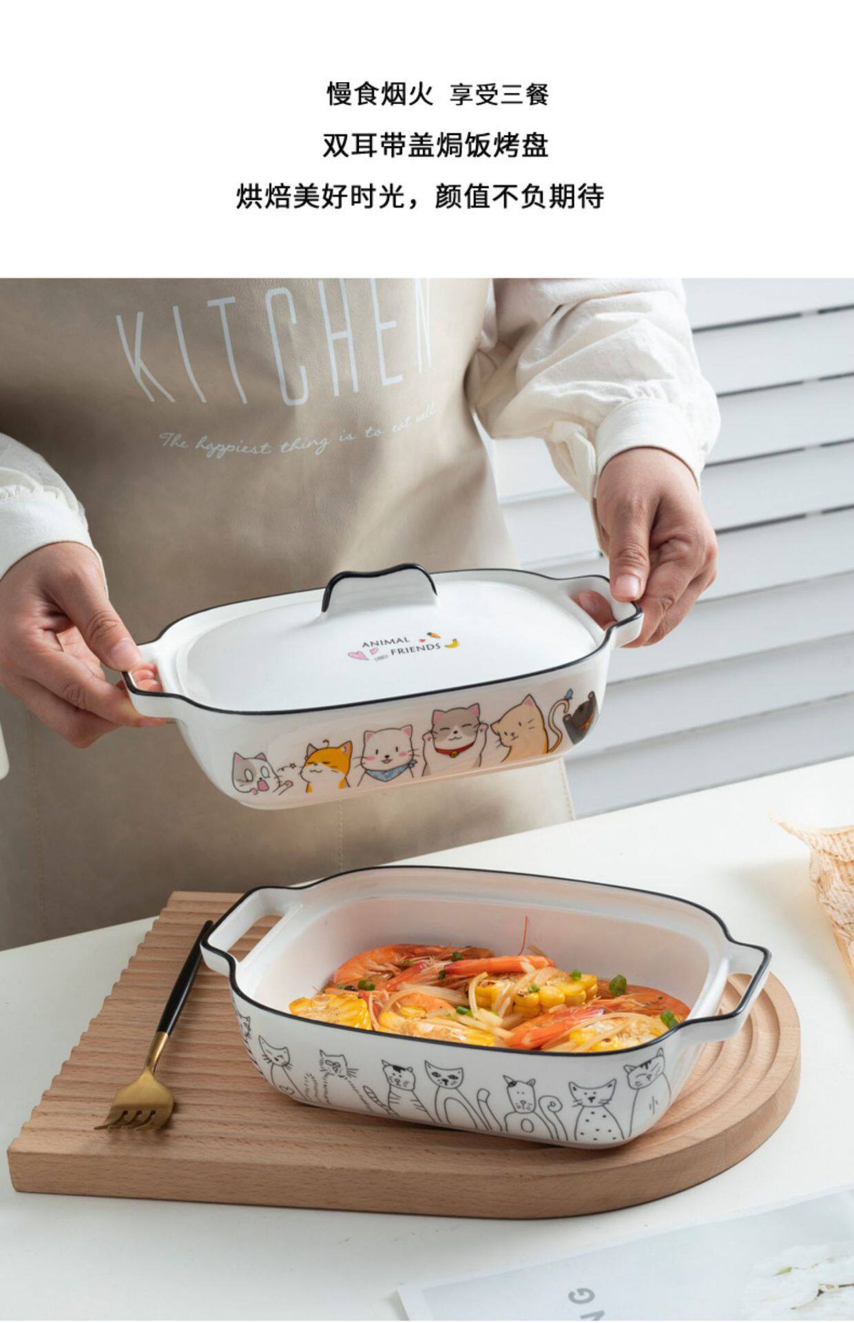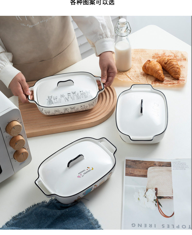 Baking Pan with Lid Cheese Baked Rice Bowl Ceramic Double-Eared Baking Bowl Microwave Oven Plate Rectangular Household Dish Plate