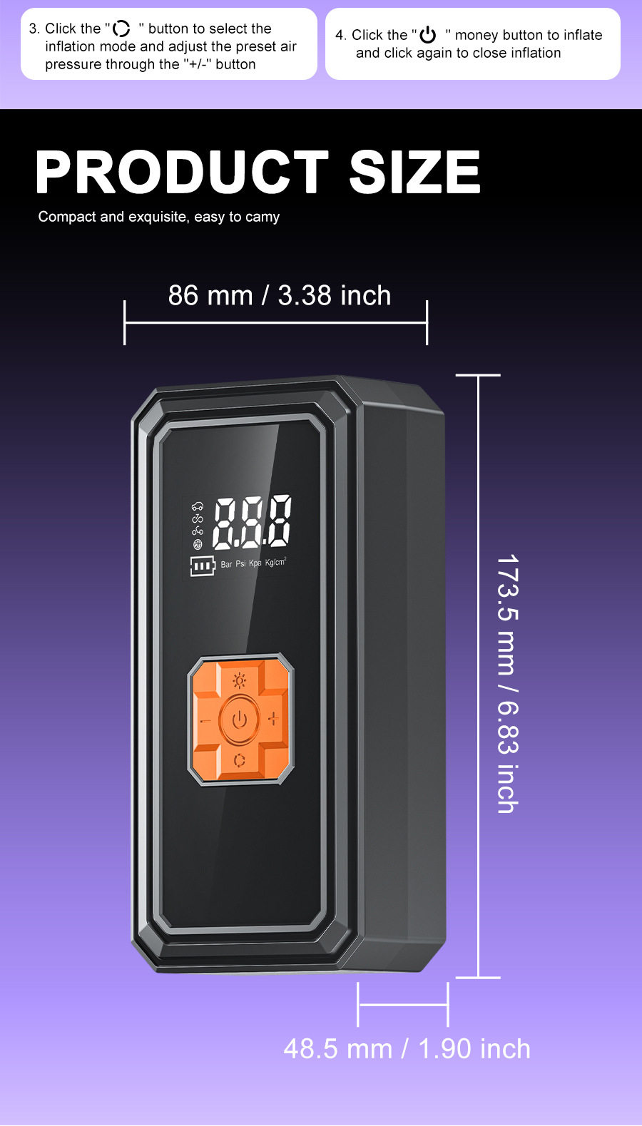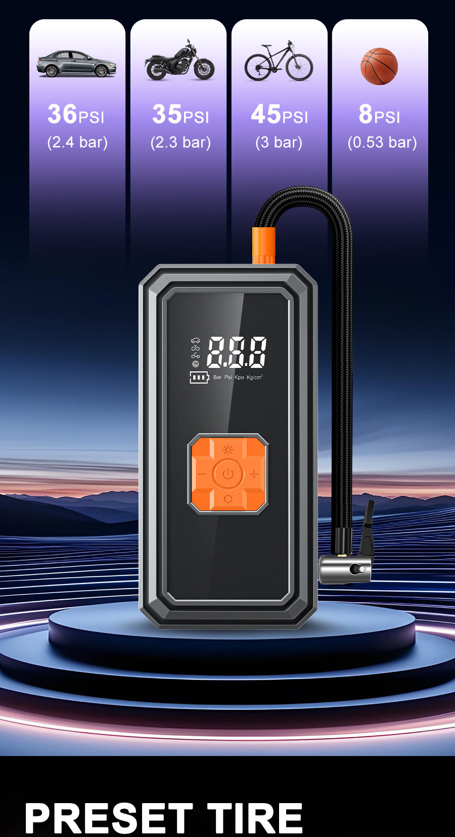 | Specifications | Black orange wireless air pump-digital display model,Classic black wireless air pump-digital display model |