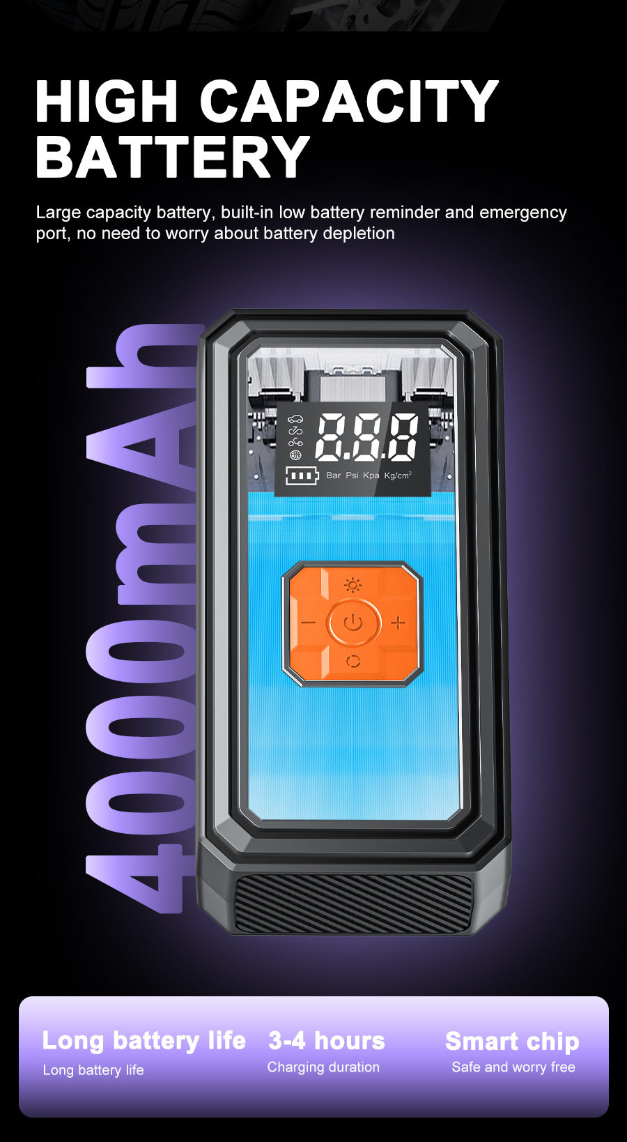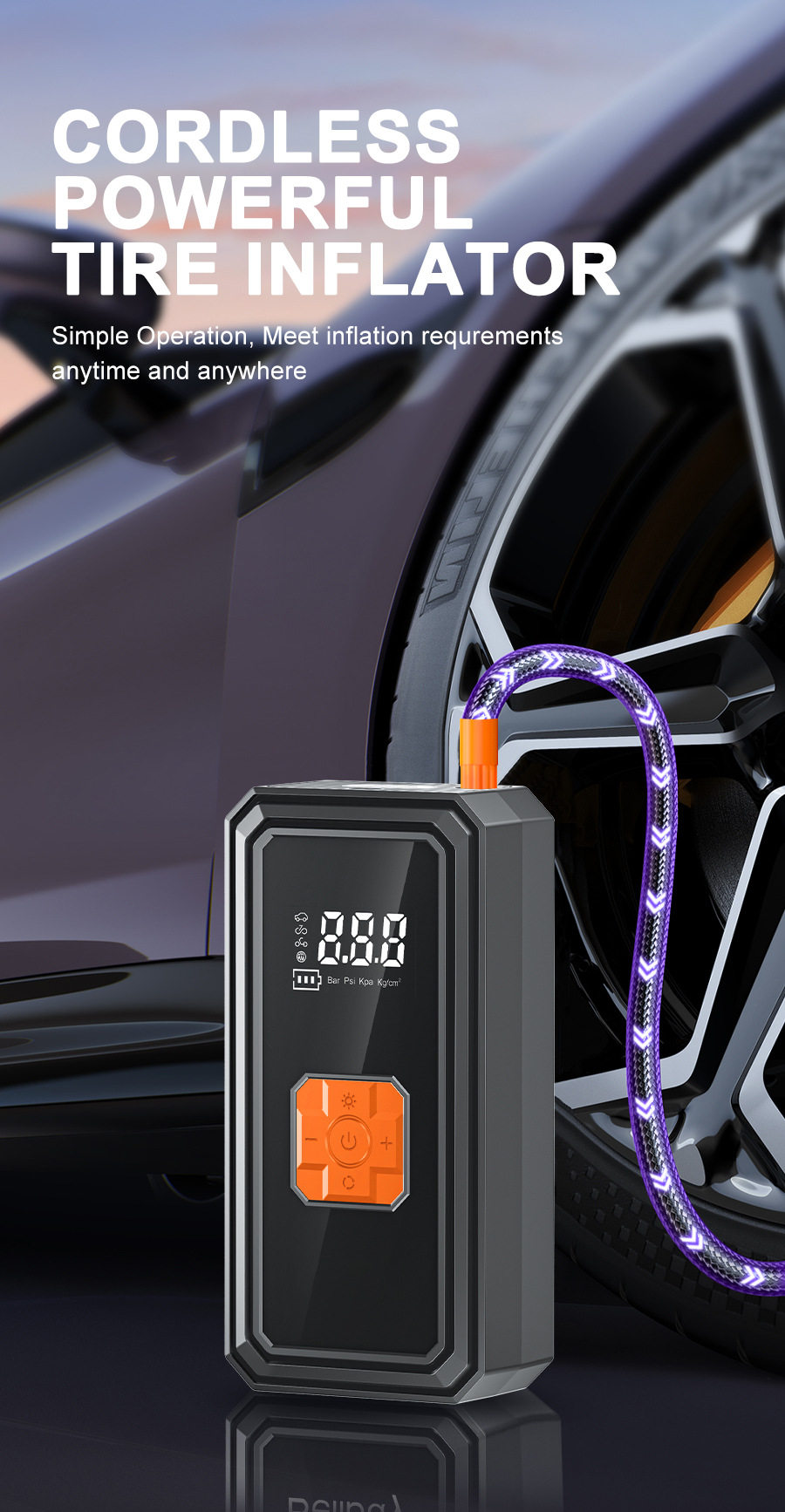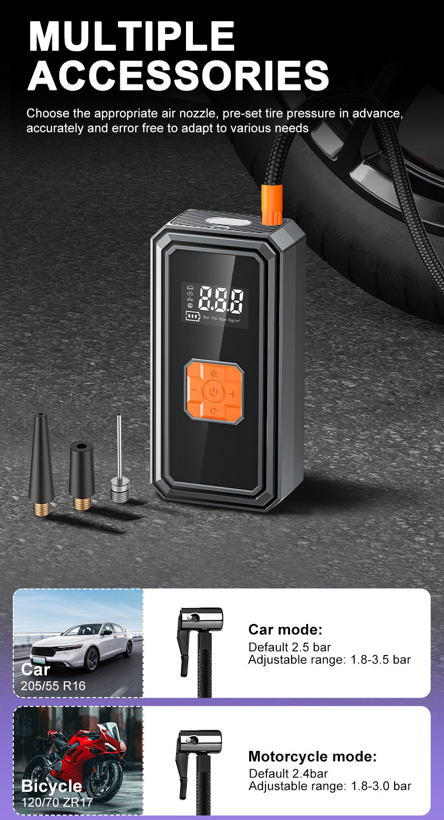 | Additional features | Tire pressure gauge,Warning light,Usb charging,Automatic charging stop |
