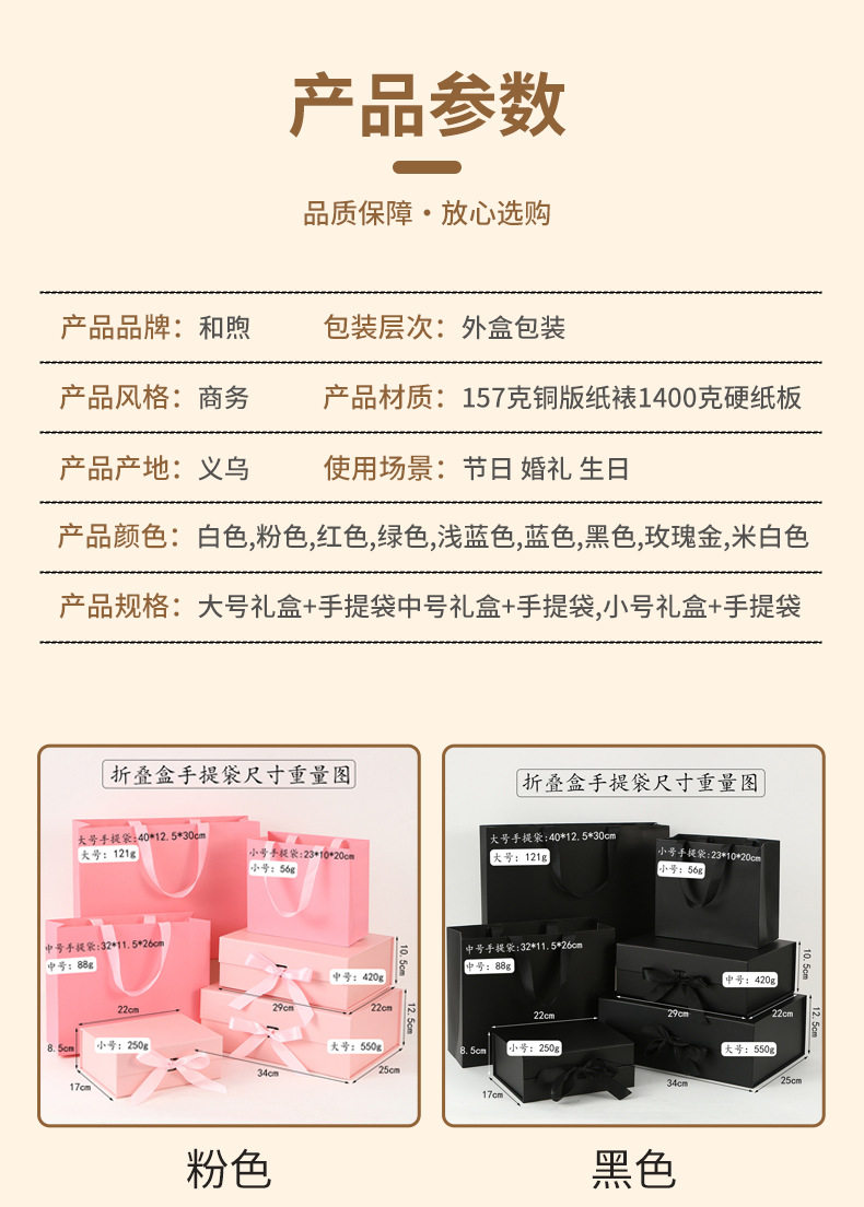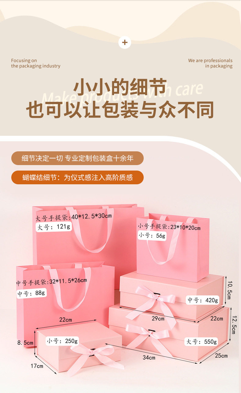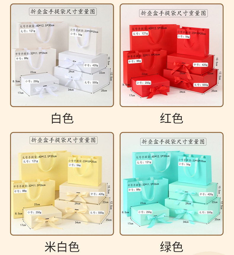 | Specifications and models | Pink; small folding box 22*17*8.5cm,Pink; medium folding box 29*22*10.5cm,Pink; large folding box 34*25*12.5cm,Pink; small handbag 23*10*20cm,Pink; medium tote bag 32*11.5*26cm,Pink; large tote bag 40*12.5*30cm,Pink; small gift box + handbag,Pink; medium gift box + handbag,Pink; large gift box + handbag,Black; small folding box 22*17*8.5cm,Black; medium folding box 29*22*10.5cm,Black; large folding box 34*25*12.5cm,Black; small handbag 23*10*20cm,Black; medium tote bag 32*11.5*26cm,Black; large tote bag 40*12.5*30cm,Black; small gift box + handbag,Black; medium gift box + handbag,Black; large gift box + handbag,White; small folding box 22*17*8.5cm,White; medium folding box 29*22*10.5cm,White; large folding box 34*25*12.5cm,White; small tote bag 23*10*20cm,White; medium tote bag 32*11.5*26cm,White; large tote bag 40*12.5*30cm,White; small gift box + handbag,White; medium gift box + handbag,White; large gift box + handbag,Red; small folding box 22*17*8.5cm,Red; medium folding box 29*22*10.5cm,Red; large folding box 34*25*12.5cm,Red; small handbag 23*10*20cm,Red; medium tote bag 32*11.5*26cm,Red; large tote bag 40*12.5*30cm,Red; small gift box + handbag,Red; medium gift box + handbag,Red; large gift box + handbag,Off-white; small folding box 22*17*8.5cm,Off-white; medium folding box 29*22*10.5cm,Off-white; large folding box 34*25*12.5cm,Off-white; small handbag 23*10*20cm,Off-white; medium tote bag 32*11.5*26cm,Off-white; large tote bag 40*12.5*30cm,Off-white; small gift box + handbag,Off-white; medium gift box + handbag,Off-white; large gift box + handbag,Green; small folding box 22*17*8.5cm,Green; medium folding box 29*22*10.5cm,Green; large folding box 34*25*12.5cm,Green; small tote bag 23*10*20cm,Green; medium tote bag 32*11.5*26cm,Green; large tote bag 40*12.5*30cm,Green; small gift box + handbag,Green; medium gift box + handbag,Green; large gift box + handbag,Rose gold; small folding box 22*17*8.5cm,Rose gold; medium folding box 29*22*10.5cm,Rose gold; large folding box 34*25*12.5cm,Rose gold; small tote bag 23*10*20cm,Rose gold; medium tote bag 32*11.5*26cm,Rose gold; large tote bag 40*12.5*30cm,Rose gold; small gift box + handbag,Rose gold; medium gift box + handbag,Rose gold; large gift box + handbag,Blue; small folding box 22*17*8.5cm,Blue; medium folding box 29*22*10.5cm,Blue; large folding box 34*25*12.5cm,Light blue; small folding box 22*17*8.5cm,Light blue; medium folding box 29*22*10.5cm,Light blue; large folding box 34*25*12.5cm |