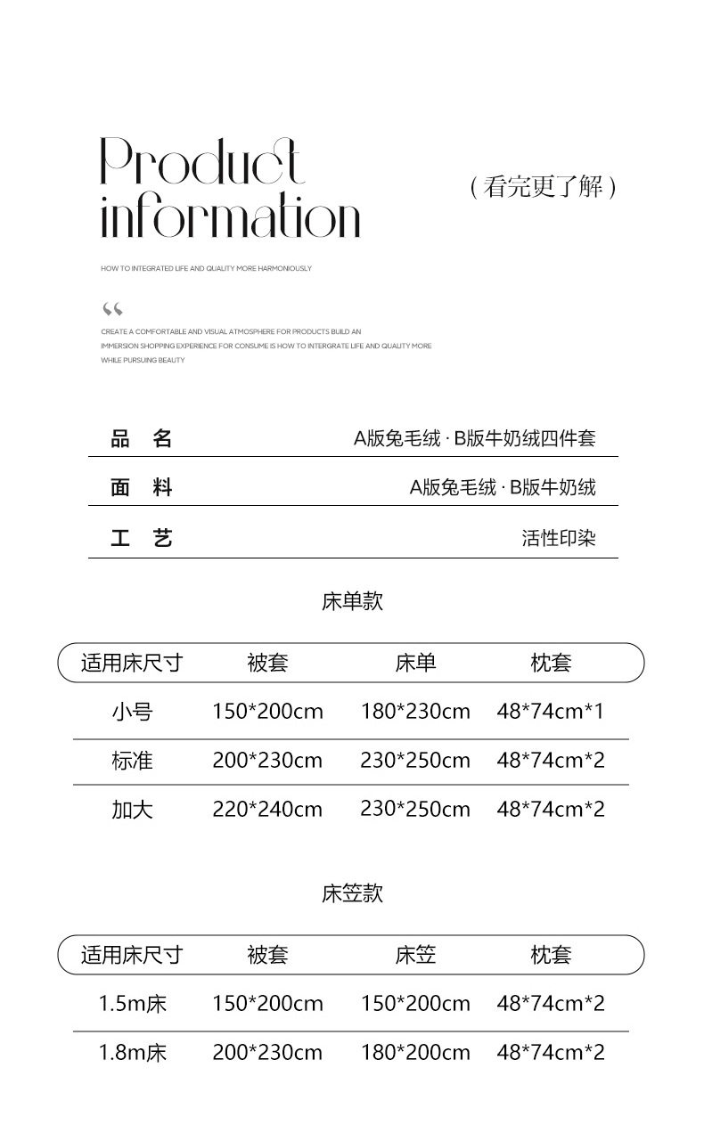 | Size specifications | 1.2m bed sheet three-piece set [suitable for 150x200 quilt core],1.5m bed sheet four-piece set [suitable for 200x230 quilt core],1.8m bed sheet four-piece set [suitable for 200x230 quilt core],2.0m bed sheet four-piece set [suitable for 220x240 quilt core],1.5m fitted sheet set of four [suitable for 200x230 quilt core],1.8m fitted sheet set of four [suitable for 200x230 quilt core] |