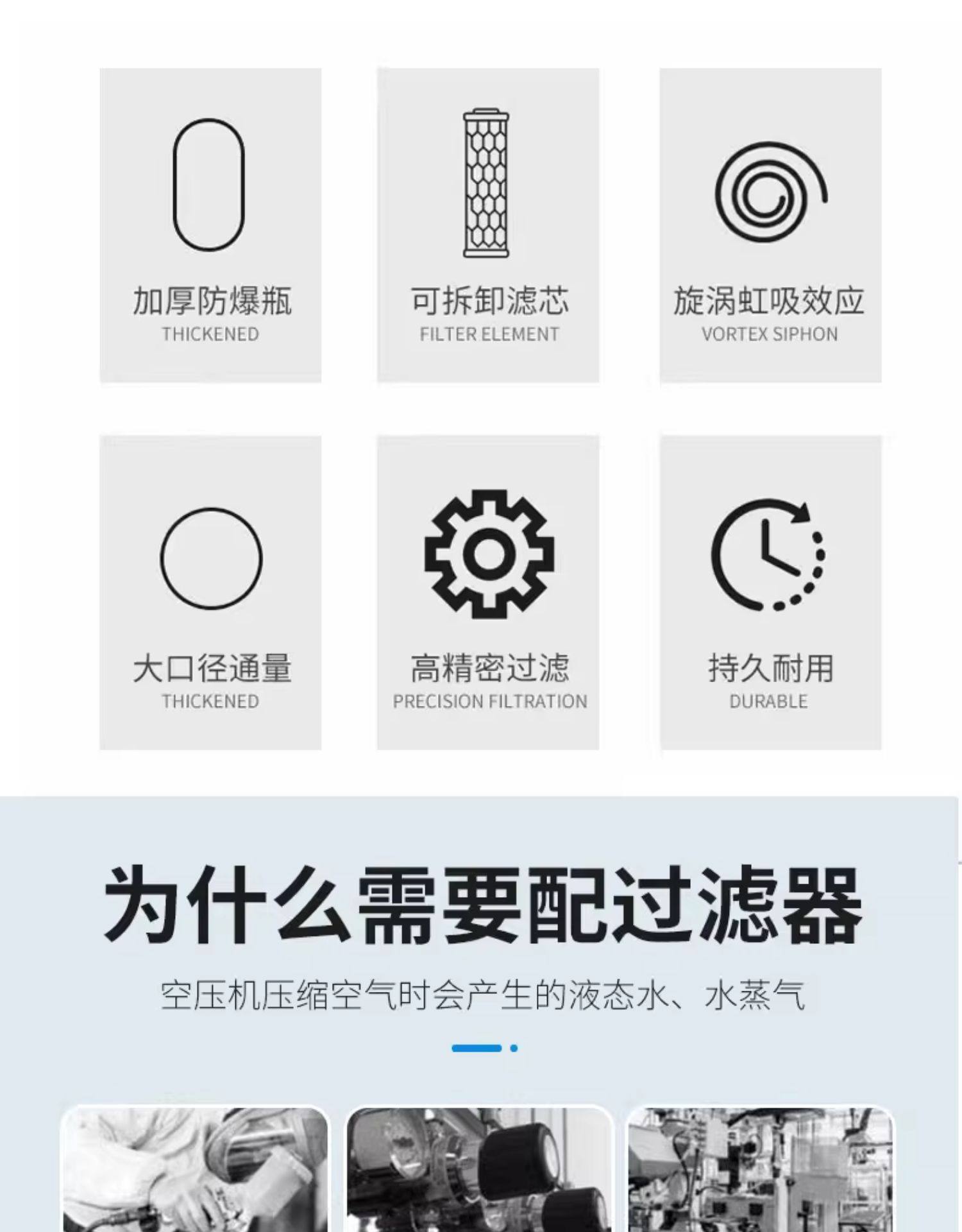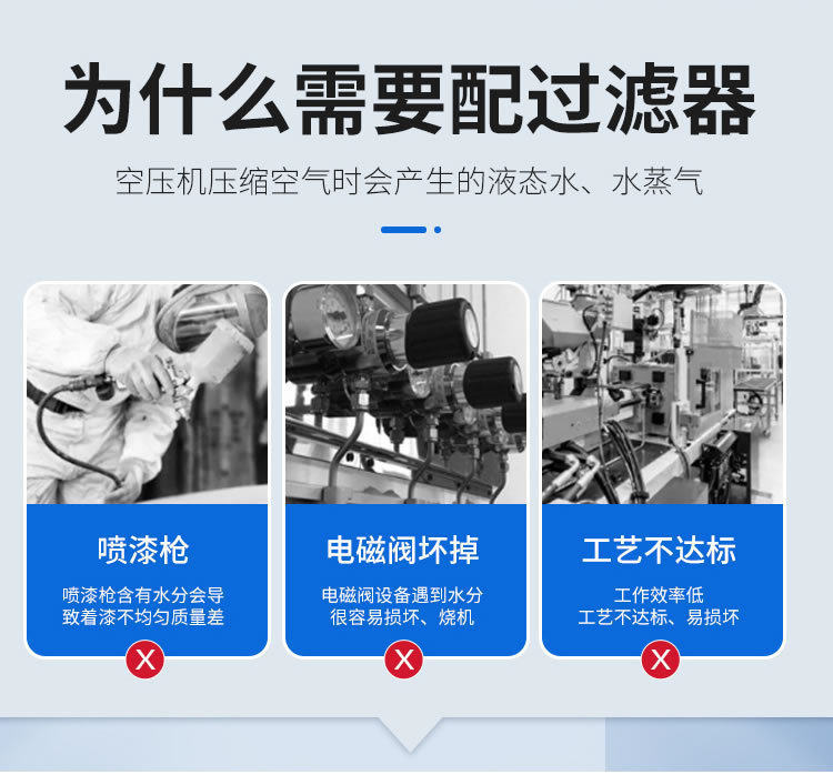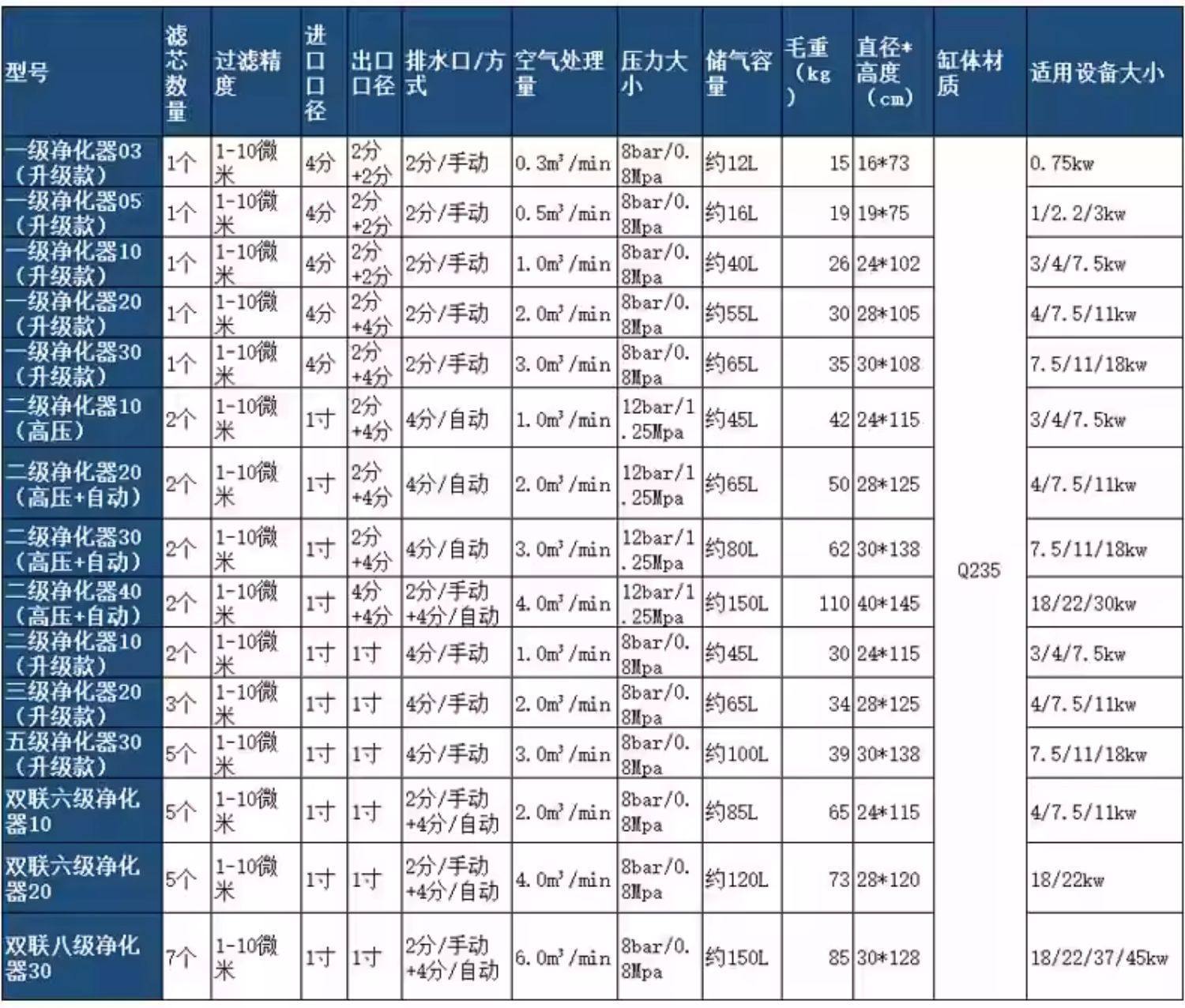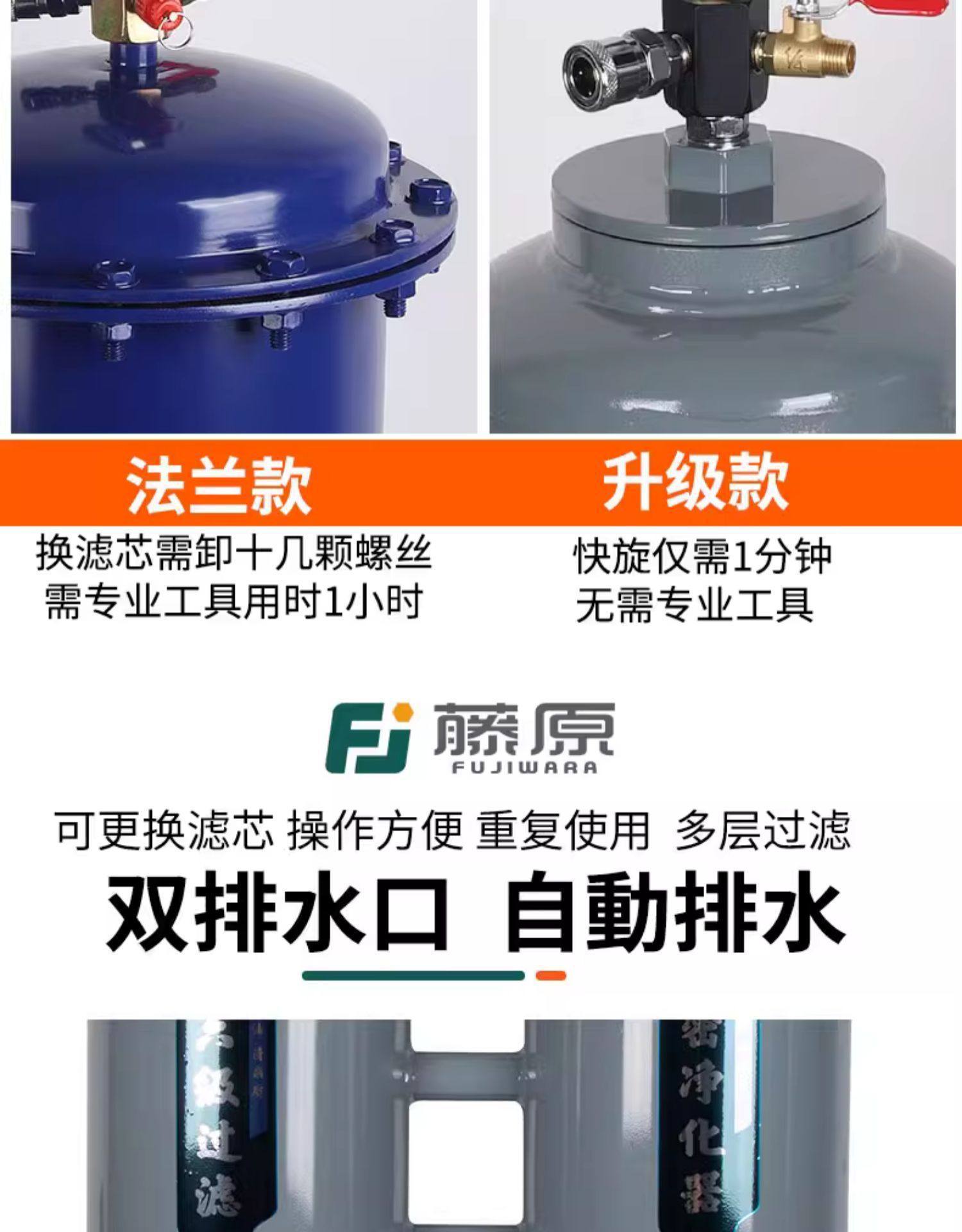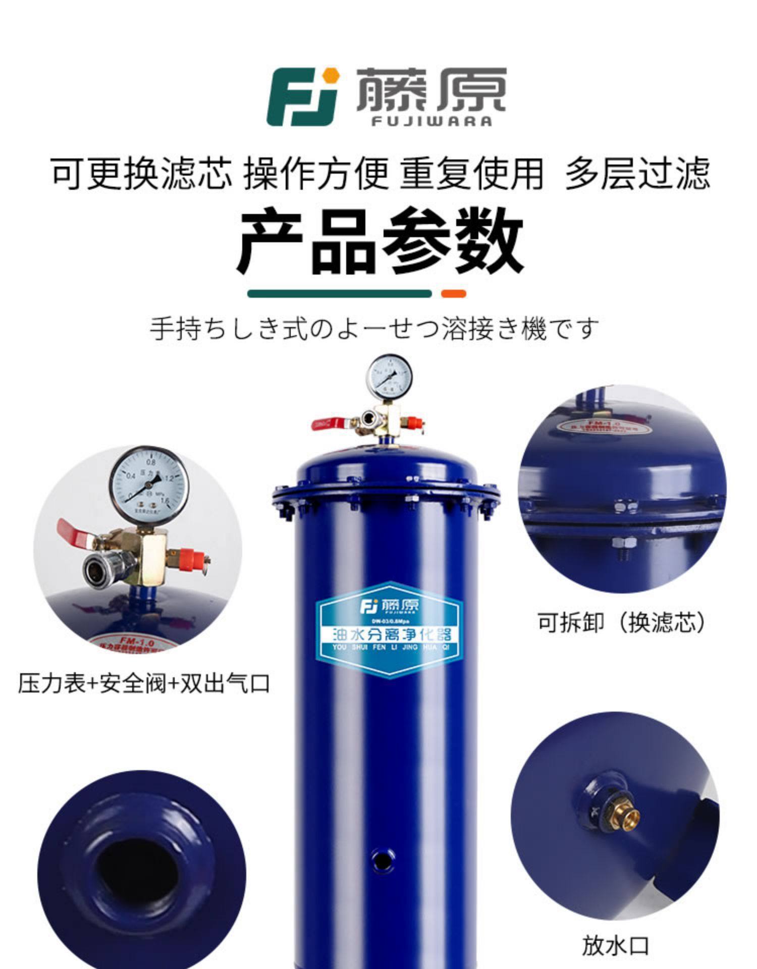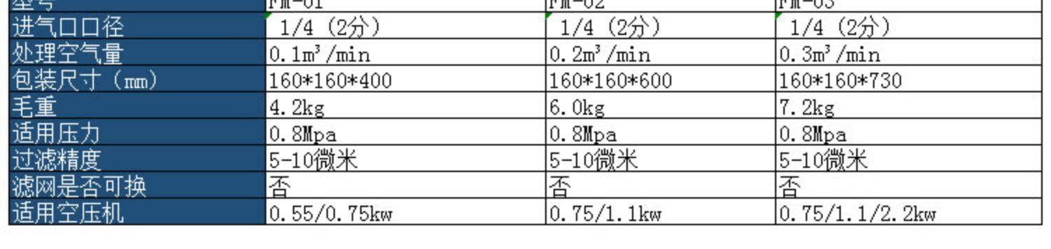 | Product specifications | Closed filter fm-01 air intake quick plug connector,Closed filter fm-02 air intake quick plug connector,Closed filter fm-03 air intake quick plug connector,Oil and water filter fm-03 (flange type) air intake quick plug connector,Oil and water filter fm-05 (flange type) air intake quick plug connector,Oil and water filter fm-10 (flange type) air intake quick plug connector,Oil and water filter fm-20 (flange type) air intake quick connector,Oil and water filter fm-30 (flange type) without quick plug, it is recommended to plug it directly,Oil and water filter fm-10 (high pressure) air intake quick plug connector,Oil and water filter fm-20 (high pressure) air intake quick plug connector,Oil and water filter fm-30 (high pressure) without quick plug, it is recommended to plug it directly,First-class oil-water separation purifier 03 (upgraded model) 2023 new model,First-class oil-water separation purifier 05 (upgraded model) 2023 new model,First-class oil-water separation purifier 10 (upgraded model) 2023 new model,First-class oil-water separation purifier 20 (upgraded model) 2023 new model,First-class oil-water separation purifier 30 (upgraded model) 2023 new model,Secondary oil-water separation purifier 10 (high pressure flange + automatic drainage) 2023 brand new,Secondary oil-water separation purifier 20 (high pressure flange + automatic drainage) 2023 brand new,Secondary oil-water separation purifier 30 (high pressure flange + automatic drainage) 2023 brand new,Secondary oil-water separation purifier 40 (high pressure flange + automatic drainage) 2023 brand new,Secondary oil-water separation purifier 10 (upgraded model) 2023 new model,Three-stage oil-water separation purifier 20 (upgraded model) 2023 new arrival,Level 5 oil-water separation purifier 30 (upgraded model) 2023 new arrival,Double six-stage oil-water separation purifier 10 (automatic double drainage) 2023 new arrival,Double six-stage oil-water separation purifier 20 (automatic double drainage) 2023 new arrival,Double eight-stage oil-water separation purifier 30 (automatic double drainage) 2023 new arrival |