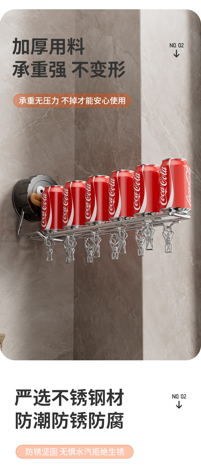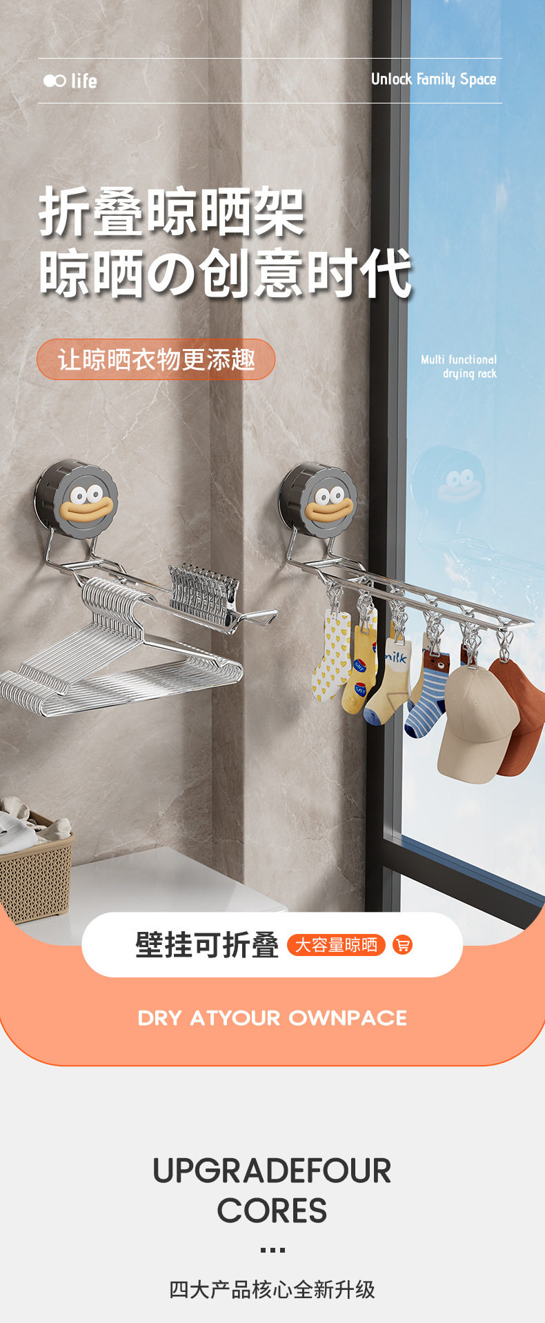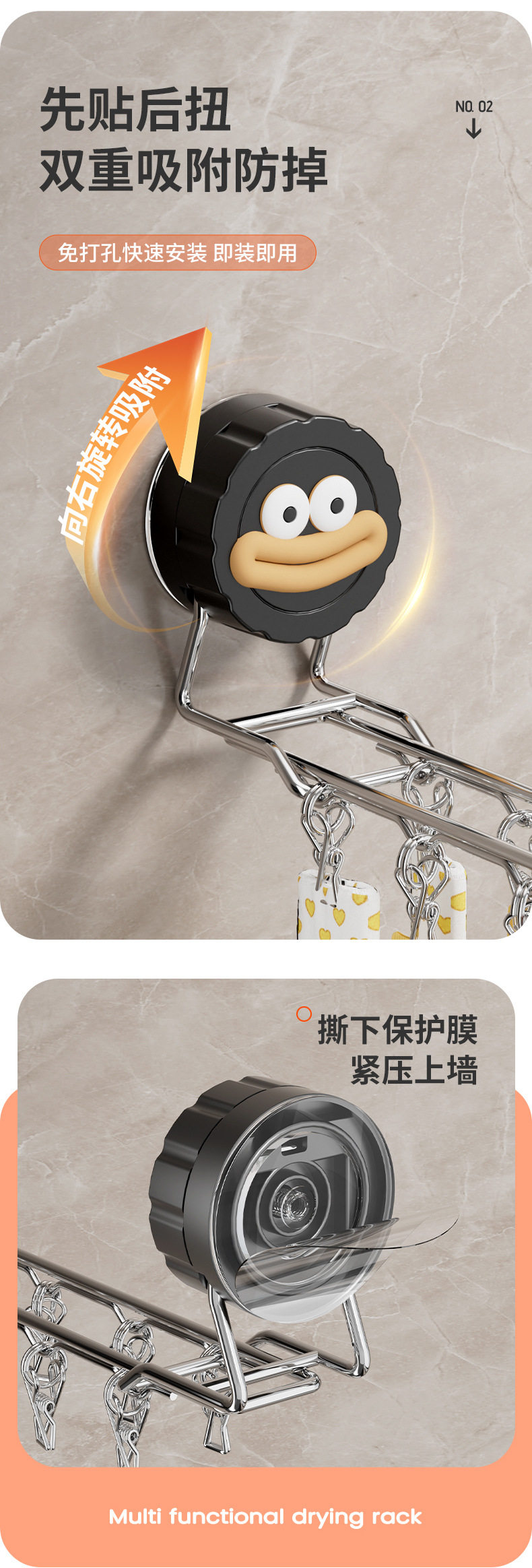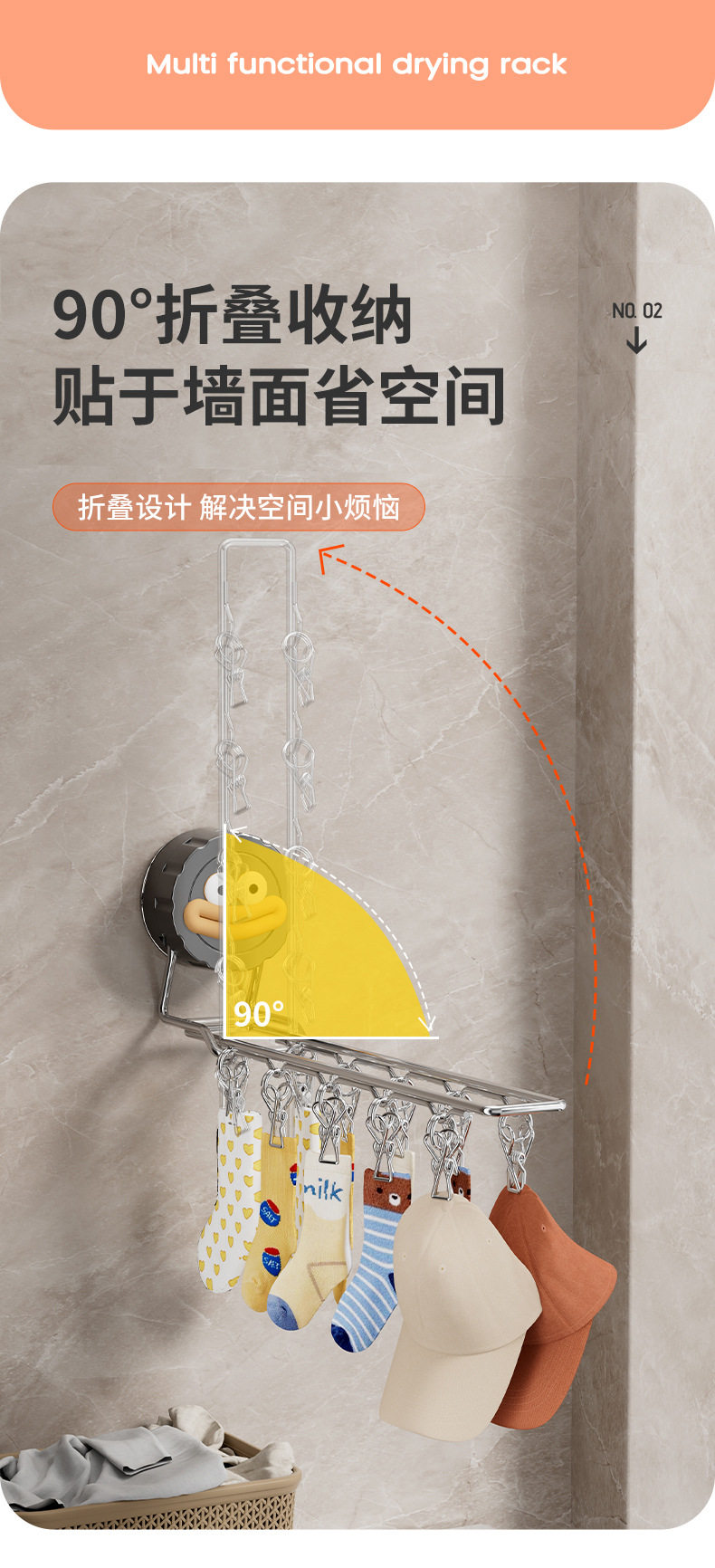No-Drill Suction Cup Drying Rack for Balcony, Stainless Steel Sock Clips, Multi-Clip Clothes Hanger Storage Rack, Foldable Clothesline Hanger