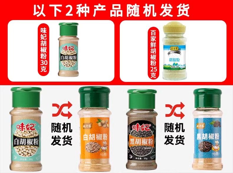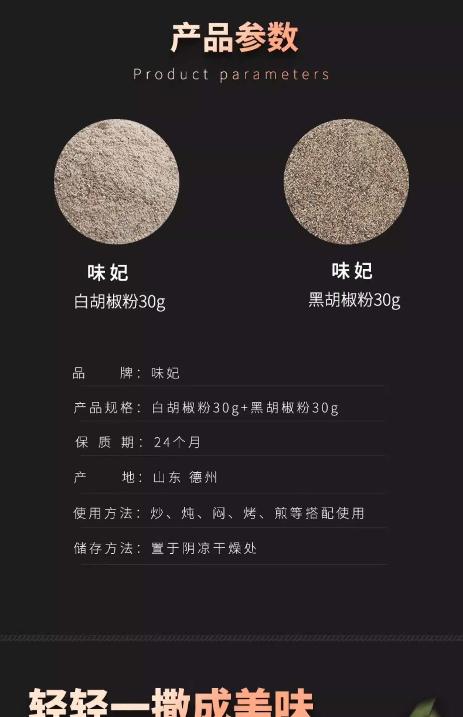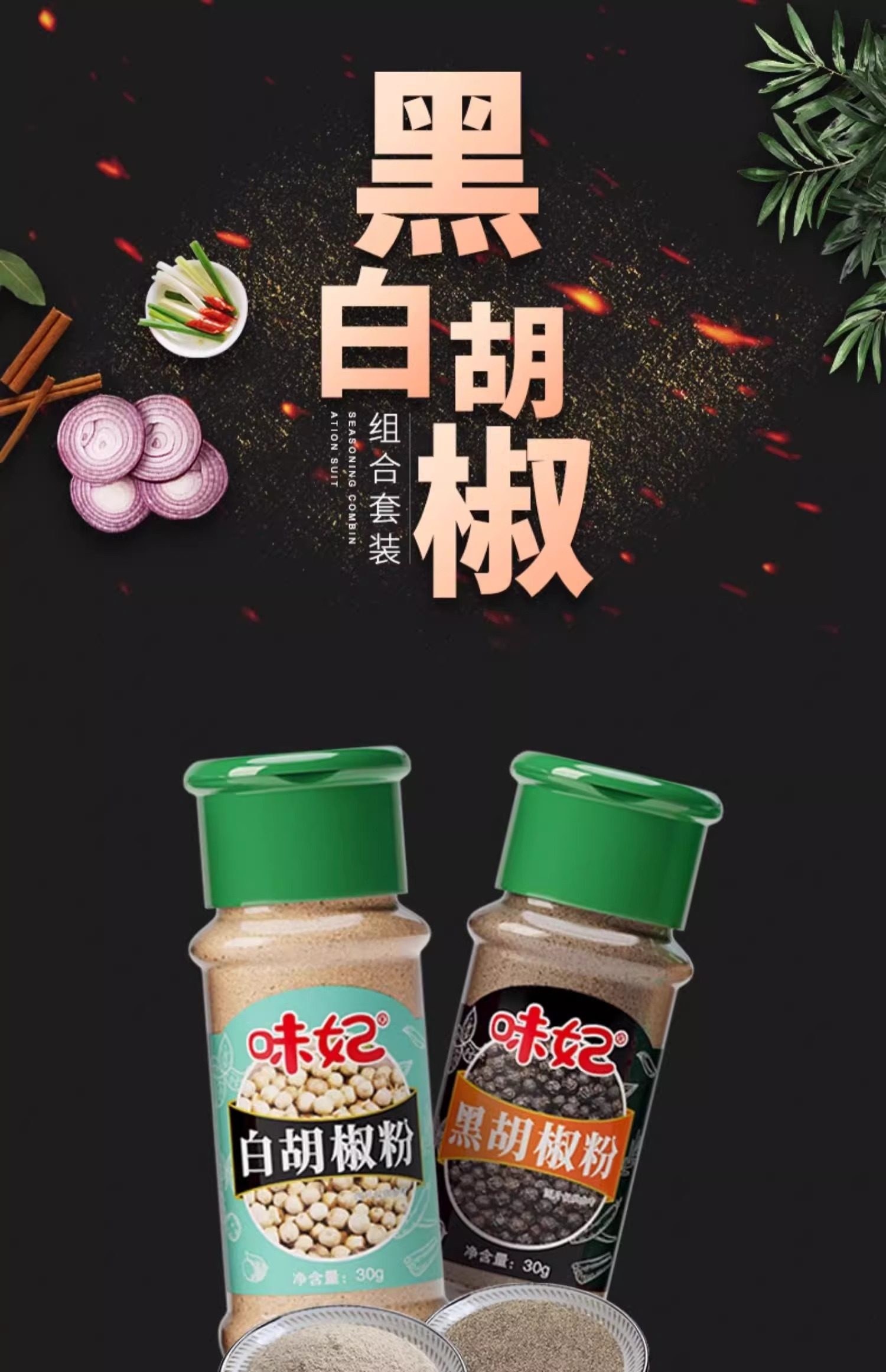 | Packaging specifications | [combination] 30g white pepper powder + 30g black pepper powder,[combination] white pepper powder 50g + black pepper powder 50g,[combination] 5 seasoning combinations,White pepper powder 30g [suitable for chinese soup and cooking],Black pepper powder 30g [suitable for western steak pasta],Sichuan pepper powder 30g,Chili powder 30g,Cumin powder 30g,White pepper powder 50g,Black pepper powder 50g,[baijiaxian] cumin powder 30g,[baijiaxian] bbq powder 30g,[baijiaxian] pepper powder 25g,Special brush oil for barbecue 220ml,[zui guo li] sea salt parsley garlic powder 110g,【jin million】sea salt and black pepper mixed grinding pack 160g,[golden million] sea salt garlic lemon mixed grind pack 140g,【jin million】black pepper mixed grinding pack 138g,[combination] black pepper mixed seasoning (one bottle of each of 3 types) |