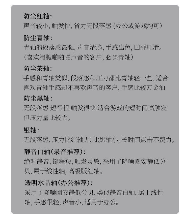 | Color | White (solid color keycaps) remarks: the keys are set and shipped - official standard configuration - dust-proof red shaft (recommended by the store),White (solid color keycaps) remarks: the keys are set and shipped - official standard - dustproof tea shaft,White (solid color keycaps) remarks: the buttons are set and shipped - official standard configuration - dust-proof green axis,White (solid color keycaps) remarks: the keys are set and shipped - official standard configuration - dust-proof black shaft,White (solid color keycaps) remarks: the buttons are set and shipped - official standard configuration - silver shaft,White (solid color keycaps) remarks: the keys are set and shipped - official standard - transparent crystal shaft (recommended for office use),White (solid color keycaps) remarks: the keys are set and shipped - official standard configuration - silent white axis (recommended for recording),White (digital keycaps) remarks: the buttons are set and shipped - official standard configuration - dust-proof red shaft (recommended by the store),White (digital keycaps) remarks: the buttons are set and shipped - official standard - dust-proof tea shaft,White (digital keycaps) remarks: the buttons are set and shipped - official standard configuration - dust-proof blue axis,White (digital keycaps) remarks: the buttons are set and shipped - official standard - dust-proof black shaft,White (digital keycaps) remarks: the buttons are set and shipped - official standard configuration - silver shaft,White (digital keycaps) remarks: the buttons are set and shipped - official standard - transparent crystal shaft (recommended for office use),White (digital keycaps) remarks: the buttons are set and shipped - official standard configuration - silent white axis (recommended for recording),White (transparent keycaps) remarks: the buttons are set and shipped - official standard - dust-proof red shaft (recommended by the store),White (transparent keycaps) remarks: the buttons are set and shipped - official standard configuration - dust-proof tea shaft,White (transparent keycap) remarks: the buttons are set and shipped - official standard configuration - dust-proof green axis,White (transparent keycaps) remarks: the buttons are set and shipped - official standard - dustproof black shaft,White (transparent keycap) remarks: the button settings are shipped - official standard - silver shaft,White (transparent keycaps) remarks: the buttons are set and shipped - official standard configuration - transparent crystal shaft (recommended for office use),White (transparent keycaps) remarks: the buttons are set and shipped - official standard configuration - silent white axis (recommended for recording),Black (solid color keycaps) remarks: the buttons are set and shipped - official standard configuration - dust-proof red shaft (recommended by the store),Black (solid color keycaps) remarks: the buttons are set and shipped - official standard configuration - dust-proof tea shaft,Black (solid color keycaps) remarks: the buttons are set and shipped - official standard configuration - dust-proof green axis,Black (solid color keycaps) remarks: the buttons are set and shipped - official standard configuration - dust-proof black shaft,Black (solid color keycaps) remarks: the buttons are set and shipped - official standard configuration - silver shaft,Black (solid color keycaps) remarks: the buttons are set and shipped - official standard configuration - transparent crystal shaft (recommended for office use),Black (solid color keycaps) remarks: the buttons are set and shipped - official standard configuration - silent white axis (recommended for recording),Black (digital keycaps) remarks: the buttons are set and shipped - official standard - dust-proof red shaft (recommended by the store),Black (digital keycaps) remarks: the buttons are set and shipped - official standard - dustproof tea shaft,Black (numeric keycaps) remarks: the buttons are set and shipped - official standard configuration - dust-proof green axis,Black (digital keycaps) remarks: the buttons are set and shipped - official standard - dust-proof black shaft,Black (digital keycaps) remarks: the buttons are set and shipped - official standard - silver shaft,Black (digital keycaps) remarks: the buttons are set and shipped - official standard - transparent crystal shaft (recommended for office use),Black (digital keycaps) remarks: the buttons are set and shipped - official standard configuration - silent white axis (recommended for recording),Black (transparent keycaps) remarks: the buttons are set and shipped - official standard configuration - dust-proof red shaft (recommended by the store),Black (transparent keycaps) remarks: the buttons are set and shipped - official standard - dust-proof tea shaft,Black (transparent keycaps) remarks: the buttons are set and shipped - official standard configuration - dust-proof green axis,Black (transparent keycaps) remarks: the buttons are set and shipped - official standard configuration - dust-proof black shaft,Black (transparent keycaps) remarks: the buttons are set and shipped - official standard configuration - silver shaft,Black (transparent keycaps) remarks: the buttons are set and shipped - official standard configuration - transparent crystal shaft (recommended for office use),Black (transparent keycaps) remarks: the buttons are set and shipped - official standard configuration - silent white axis (recommended for recording) |