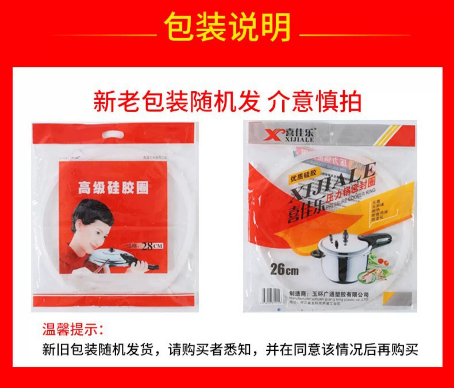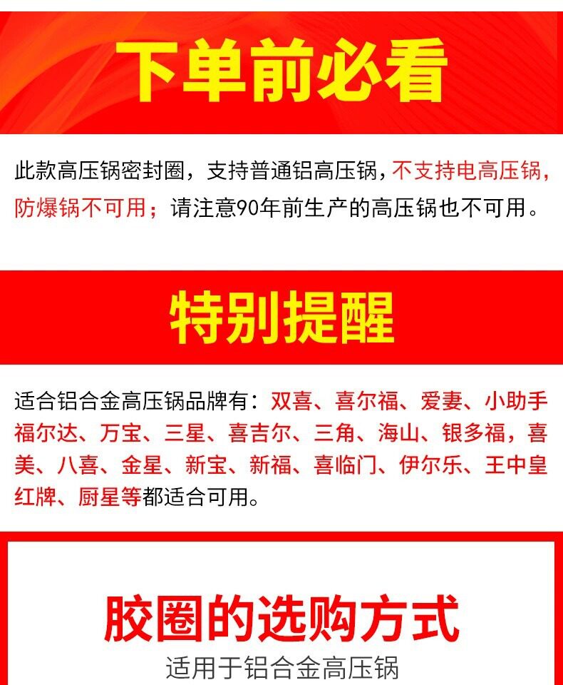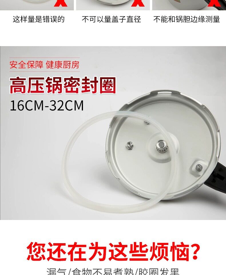 | Specifications | 16cm inner diameter rubber ring,18cm inner diameter rubber ring,20cm inner diameter rubber ring,24cm inner diameter rubber ring,26cm inner diameter rubber ring,28cm inner diameter rubber ring,30cm inner diameter rubber ring,32cm inner diameter rubber ring,20cm inner diameter thickened version,22cm inner diameter thickened version,24cm inner diameter thickened version,Pressure cooker sealing ring -22cm,Beef tendon type-20cm (4.5mm),Beef tendon type -22cm(4.5mm),Beef tendon type -24cm (4.5mm),Beef tendon type -26cm(4.5mm),Beef tendon type -28cm(5mm),Beef tendon type -32cm(5mm),26cm inner diameter thickened version |