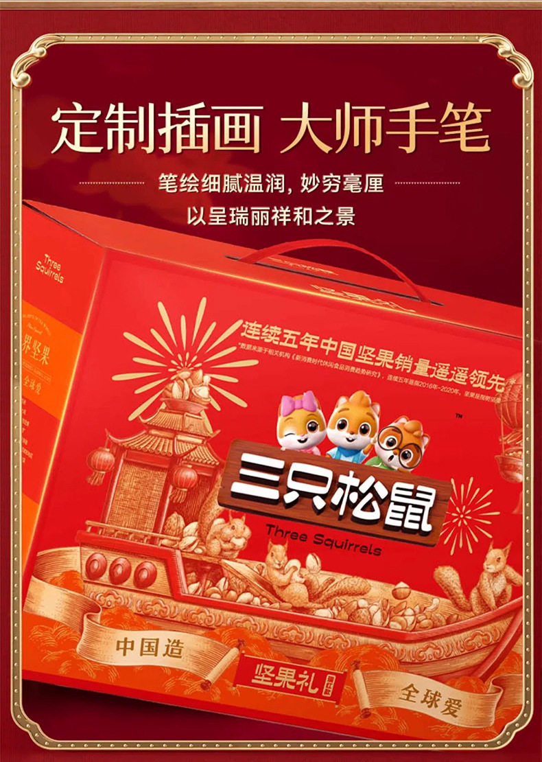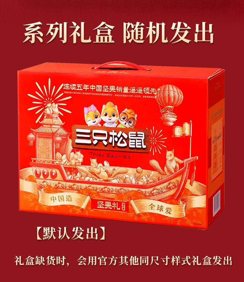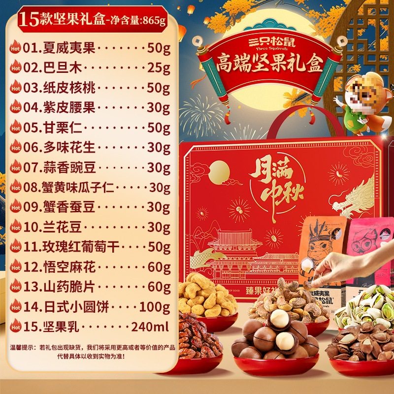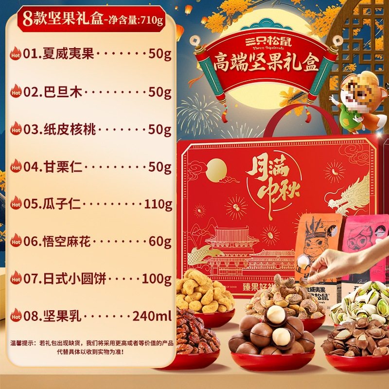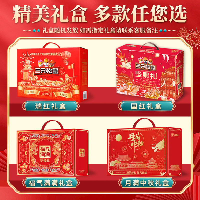 | Packaging specifications | [full moon mid-autumn festival gift box] 8 types of nuts 710g (new style),[full moon mid-autumn festival gift box] 10 types of nuts 820g (new style),[full moon mid-autumn festival gift box] 15 types of nuts 865g (new style),[full moon mid-autumn festival gift box] 16 types of nuts 915g (new style),[full moon mid-autumn festival gift box] 18 types of nuts 1170g (new style),[blessing gift box] 8 types of nuts 710g (luxury version),[blessing gift box] 10 types of nuts 820g (luxury version),[blessing gift box] 15 types of nuts 865g (luxury version),[blessing gift box] 16 types of nuts 915g (luxury version),[blessing gift box] 18 types of nuts 1170g (luxury version),[big head pack] 8 types of nuts 963g (three squirrels gift box),[big head pack] 9 types of nuts 1083g (three squirrels gift box),[big head pack] 10 types of nuts 1158g (three squirrels gift box),[big head pack] 11 types of nuts 1378g (three squirrels gift box),[big head pack] 12 types of nuts 1501g (three squirrels gift box),[big head pack] 13 types of nuts 1598g (three squirrels gift box),[big head pack] 14 types of nuts 1698g (three squirrels gift box),[big head pack] 15 types of nuts 2038g (three squirrels gift box),[big head pack] 16 types of nuts 1963g (three squirrels gift box),[big head pack] 17 types of nuts 2345g (three squirrels gift box),[send two boxes] buy one box and get one free, a total of 16 styles 1420g (full moon mid-autumn festival gift box),[send two boxes] buy one box and get one free, a total of 16 styles 1420g (full of blessings gift box),[send two boxes] buy one box and get one free, a total of 16 styles 1926g (three squirrels gift box),[send two boxes] buy one box and get one free, a total of 18 styles 2166g (three squirrels gift box),[send two boxes] buy one box and get one free, a total of 20 styles 2316g (three squirrels gift box),[send two boxes] buy one box and get one free, a total of 22 styles 2756g (three squirrels gift box),[send two boxes] buy one box and get one free, a total of 24 styles 3002g (three squirrels gift box),[send two boxes] buy one box and get one free, a total of 26 styles 3196g (three squirrels gift box),[send two boxes] buy one box and get one free, a total of 28 styles 3396g (three squirrels gift box),[send two boxes] buy one box and get one free, a total of 30 styles 4076g (three squirrels gift box),[send two boxes] buy one box and get one free, a total of 32 styles 3926g (three squirrels gift box),[send two boxes] buy one box and get one free, a total of 34 styles 4690g (three squirrels gift box) |