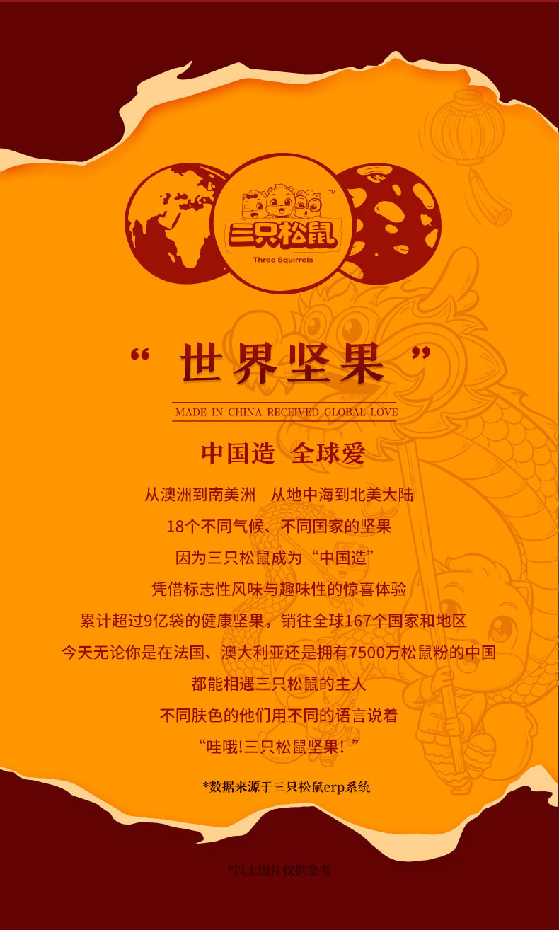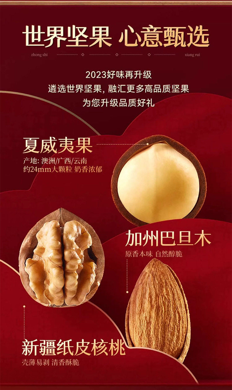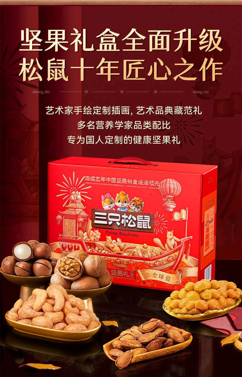| Packaging specifications | [full moon mid-autumn festival gift box] 8 types of nuts 710g (new style),[full moon mid-autumn festival gift box] 10 types of nuts 820g (new style),[full moon mid-autumn festival gift box] 15 types of nuts 865g (new style),[full moon mid-autumn festival gift box] 16 types of nuts 915g (new style),[full moon mid-autumn festival gift box] 18 types of nuts 1170g (new style),[blessing gift box] 8 types of nuts 710g (luxury version),[blessing gift box] 10 types of nuts 820g (luxury version),[blessing gift box] 15 types of nuts 865g (luxury version),[blessing gift box] 16 types of nuts 915g (luxury version),[blessing gift box] 18 types of nuts 1170g (luxury version),[big head pack] 8 types of nuts 963g (three squirrels gift box),[big head pack] 9 types of nuts 1083g (three squirrels gift box),[big head pack] 10 types of nuts 1158g (three squirrels gift box),[big head pack] 11 types of nuts 1378g (three squirrels gift box),[big head pack] 12 types of nuts 1501g (three squirrels gift box),[big head pack] 13 types of nuts 1598g (three squirrels gift box),[big head pack] 14 types of nuts 1698g (three squirrels gift box),[big head pack] 15 types of nuts 2038g (three squirrels gift box),[big head pack] 16 types of nuts 1963g (three squirrels gift box),[big head pack] 17 types of nuts 2345g (three squirrels gift box),[send two boxes] buy one box and get one free, a total of 16 styles 1420g (full moon mid-autumn festival gift box),[send two boxes] buy one box and get one free, a total of 16 styles 1420g (full of blessings gift box),[send two boxes] buy one box and get one free, a total of 16 styles 1926g (three squirrels gift box),[send two boxes] buy one box and get one free, a total of 18 styles 2166g (three squirrels gift box),[send two boxes] buy one box and get one free, a total of 20 styles 2316g (three squirrels gift box),[send two boxes] buy one box and get one free, a total of 22 styles 2756g (three squirrels gift box),[send two boxes] buy one box and get one free, a total of 24 styles 3002g (three squirrels gift box),[send two boxes] buy one box and get one free, a total of 26 styles 3196g (three squirrels gift box),[send two boxes] buy one box and get one free, a total of 28 styles 3396g (three squirrels gift box),[send two boxes] buy one box and get one free, a total of 30 styles 4076g (three squirrels gift box),[send two boxes] buy one box and get one free, a total of 32 styles 3926g (three squirrels gift box),[send two boxes] buy one box and get one free, a total of 34 styles 4690g (three squirrels gift box) |