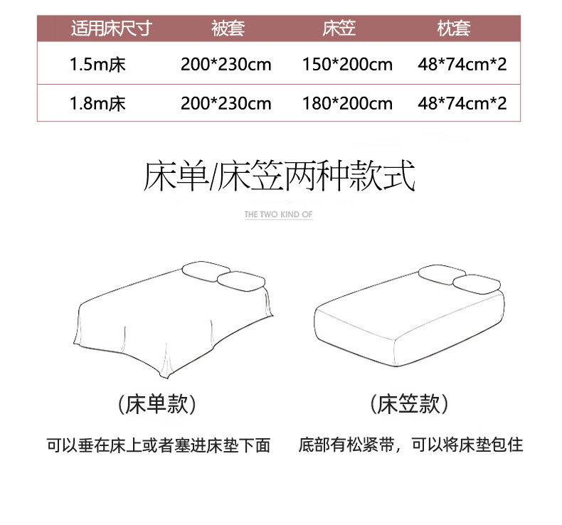 | Size specifications | 1.2m bed sheet three-piece set (applicable to 150*200 quilt core),1.5m bed sheet four-piece set (applicable to 200*230 quilt core),1.8m bed sheet four-piece set (applicable to 200*230 quilt core),1.5m fitted sheet set of four (applicable to 200*230 quilt core),1.8m fitted sheet set of four (applicable to 200*230 quilt core) |
