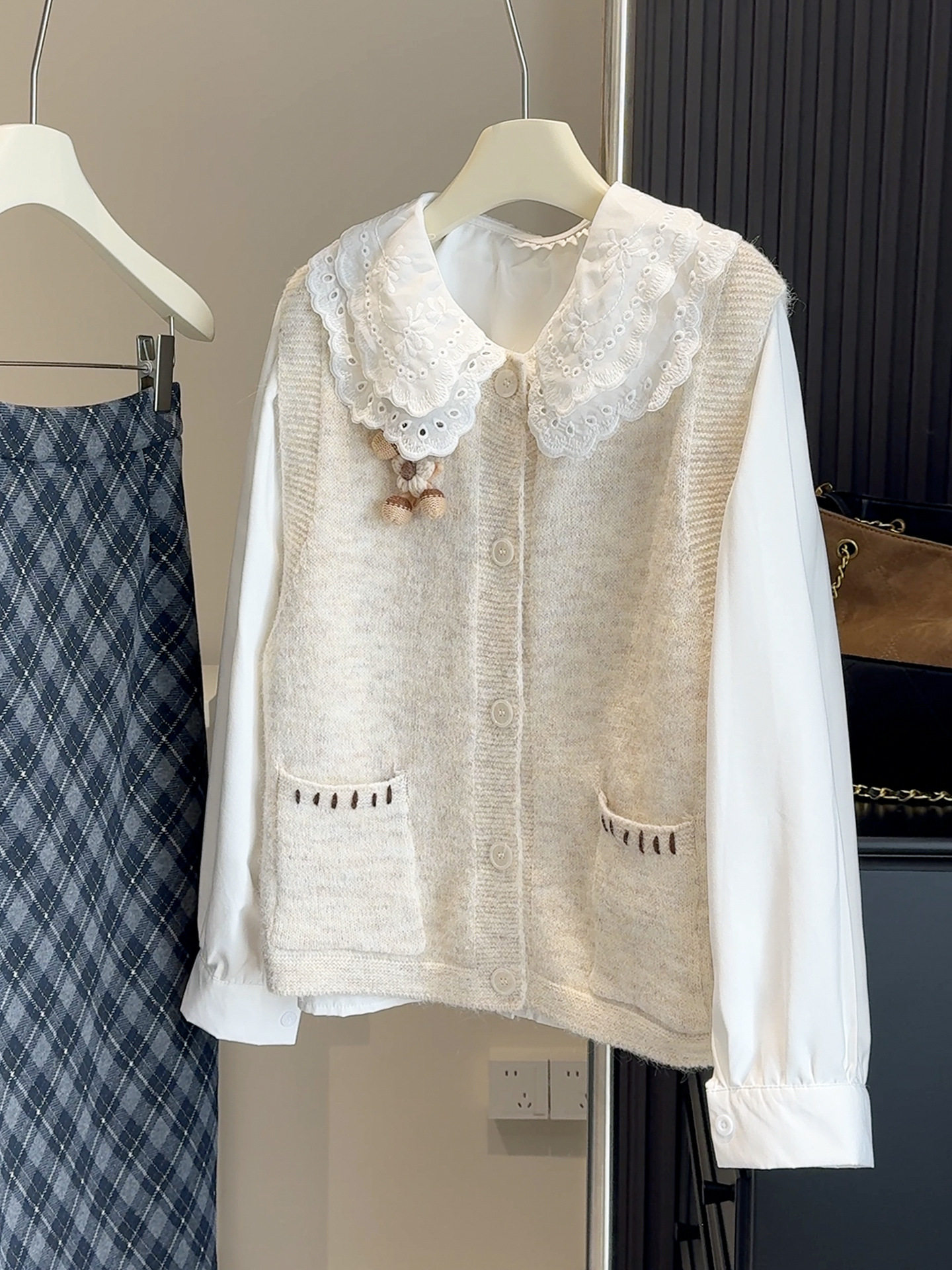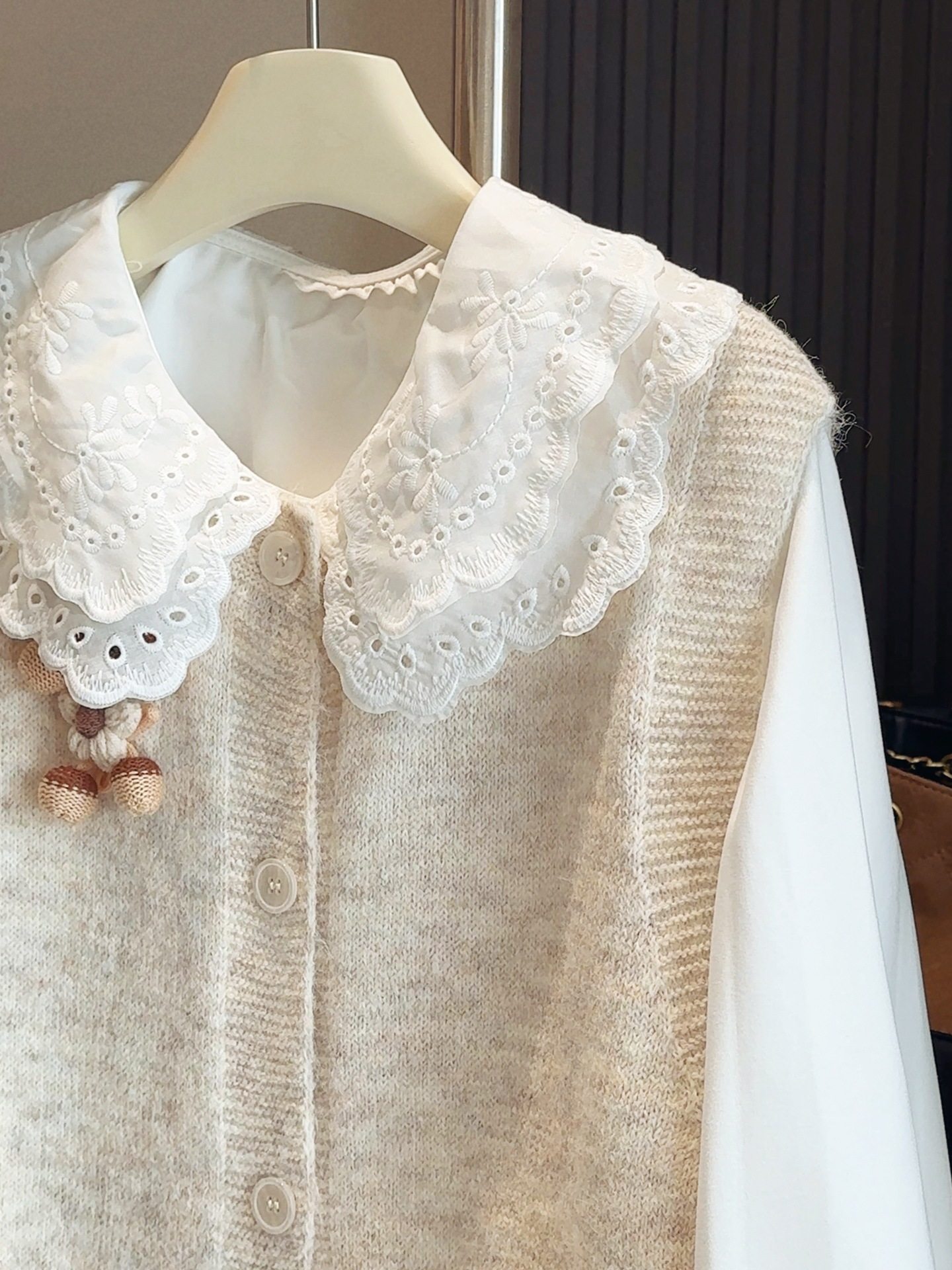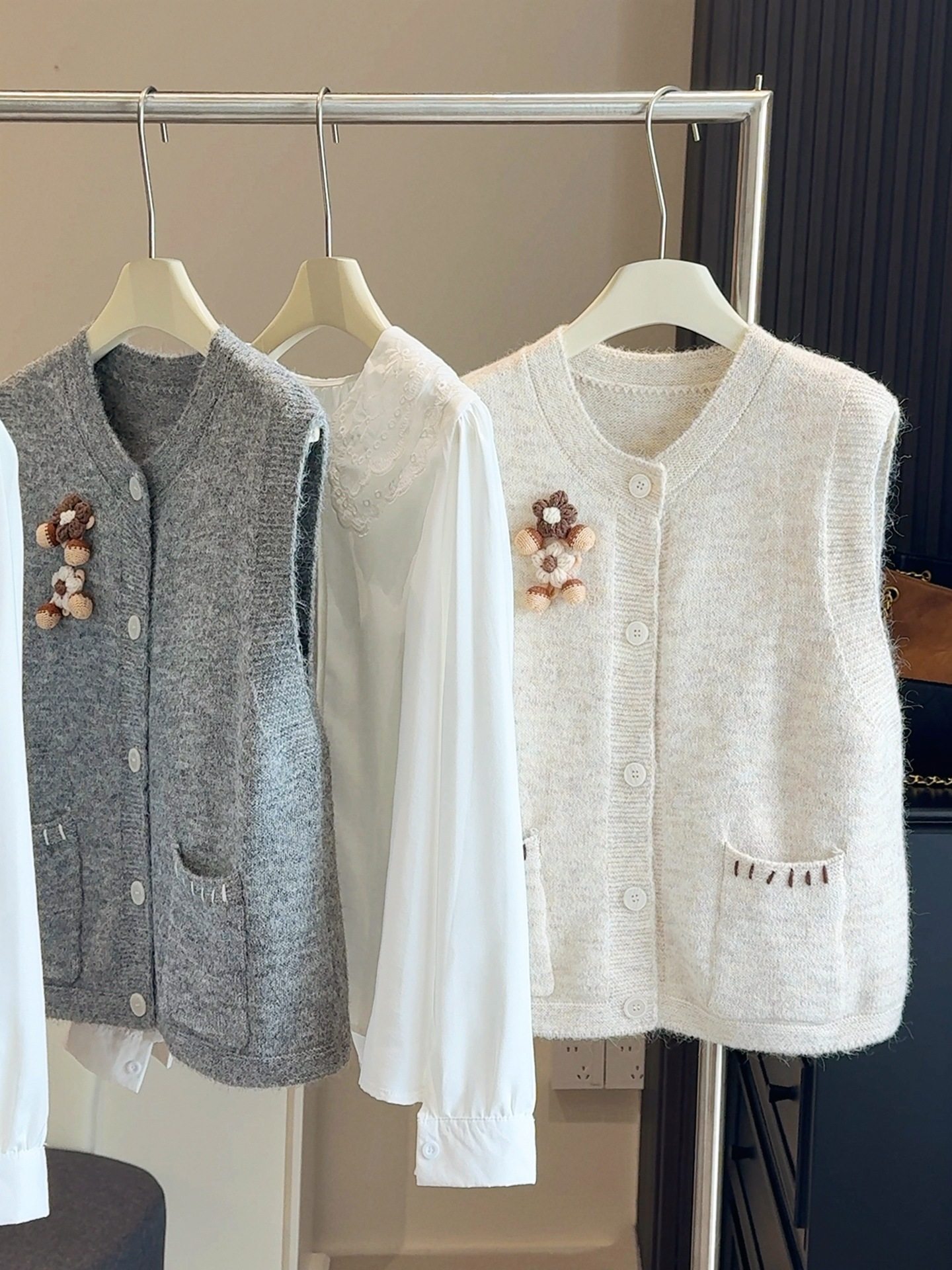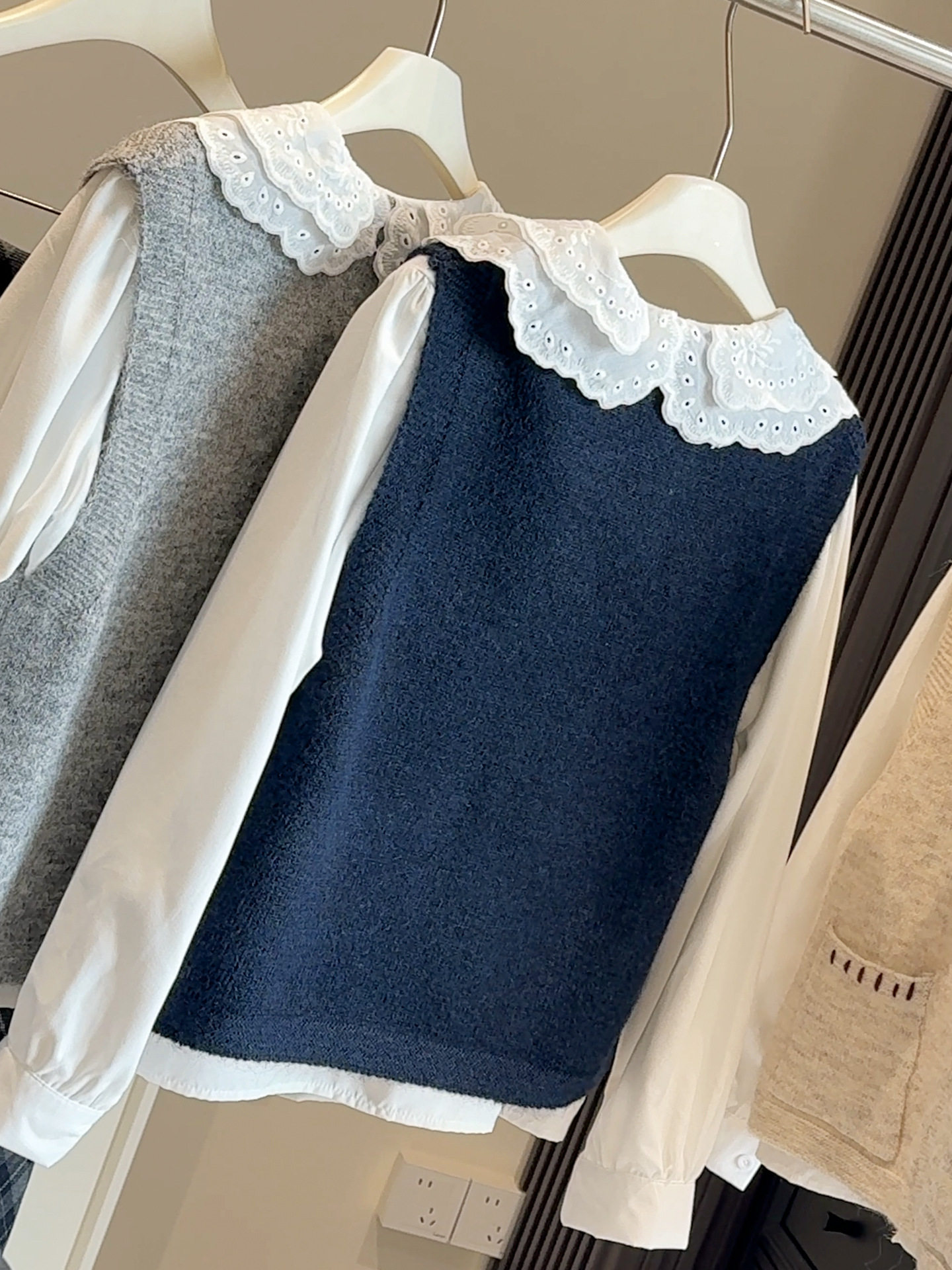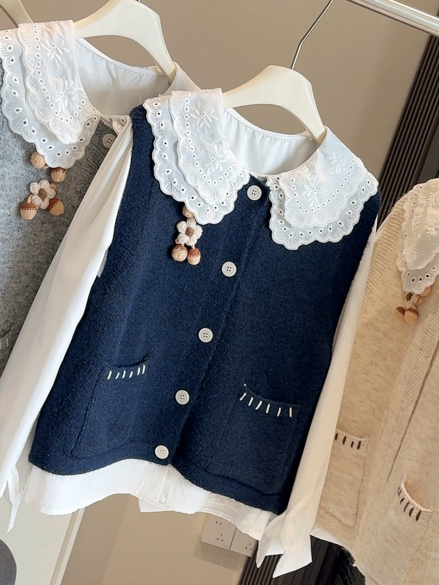 Three-Dimensional Flower Design, Age-Reducing, Slimming, Versatile Layering Knit Vest + Peter Pan Collar Shirt for Women, Autumn and Winter Fashion Set