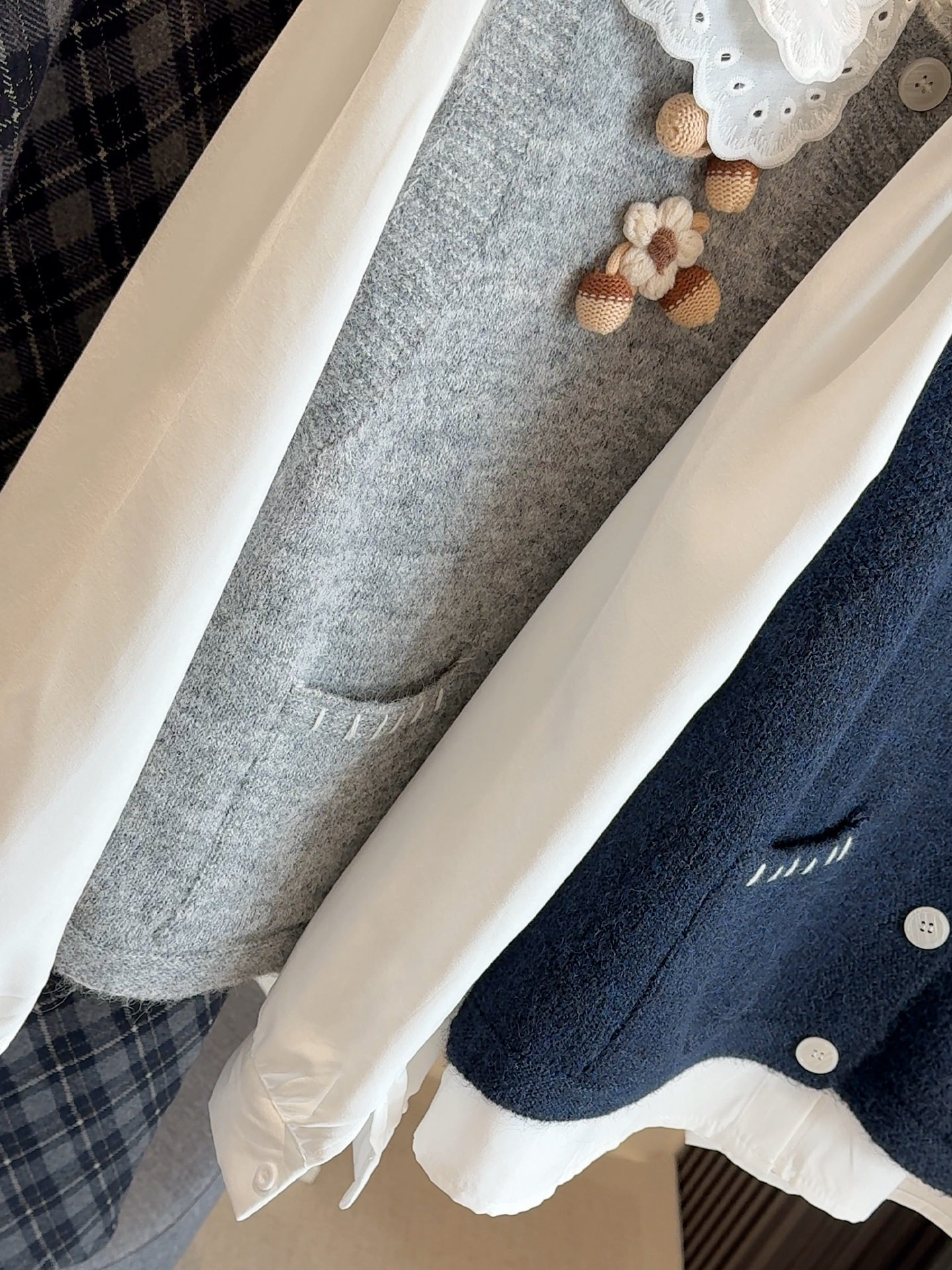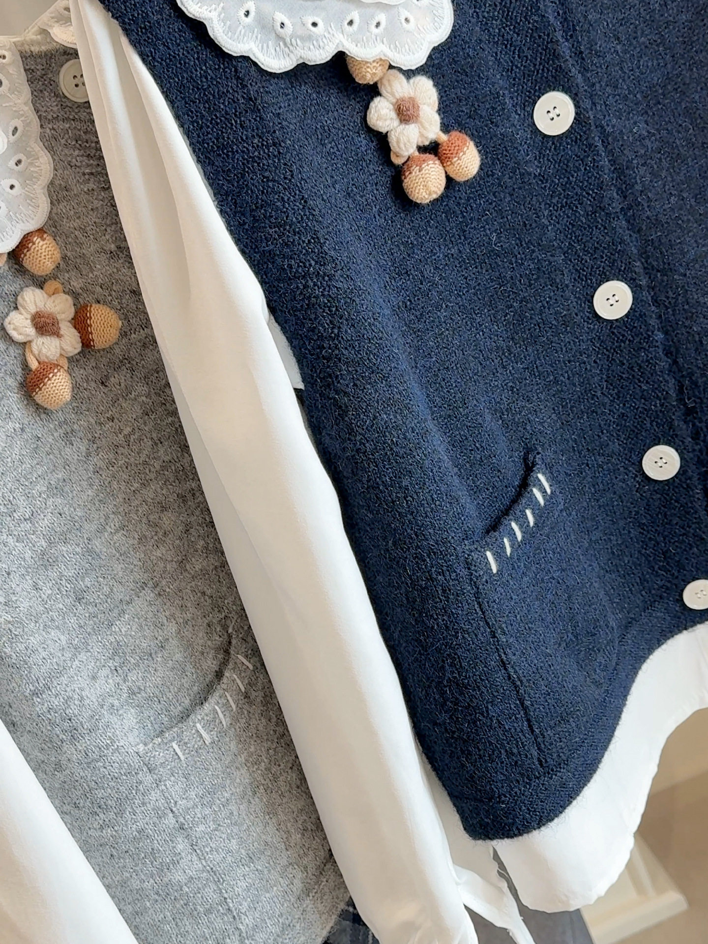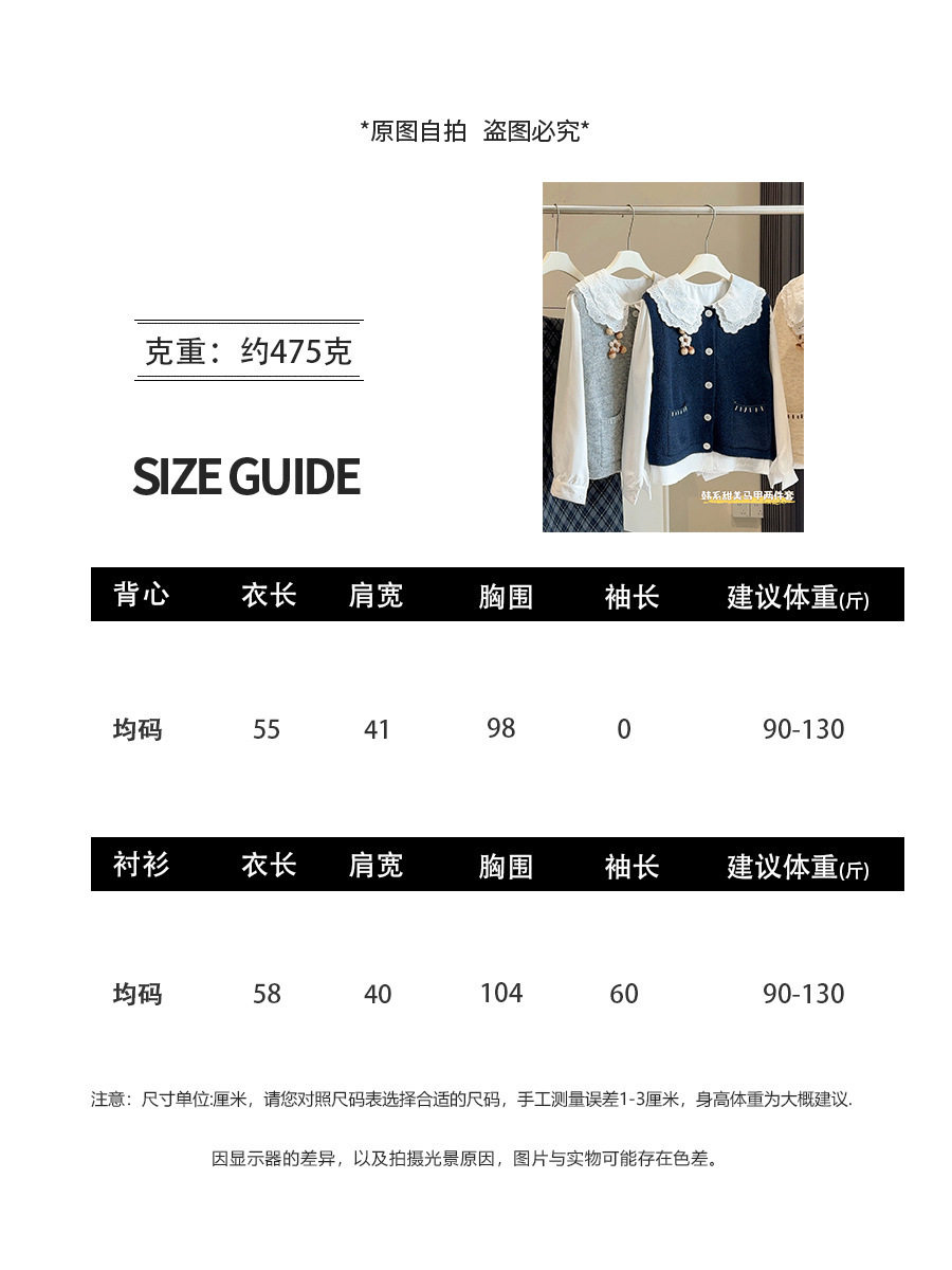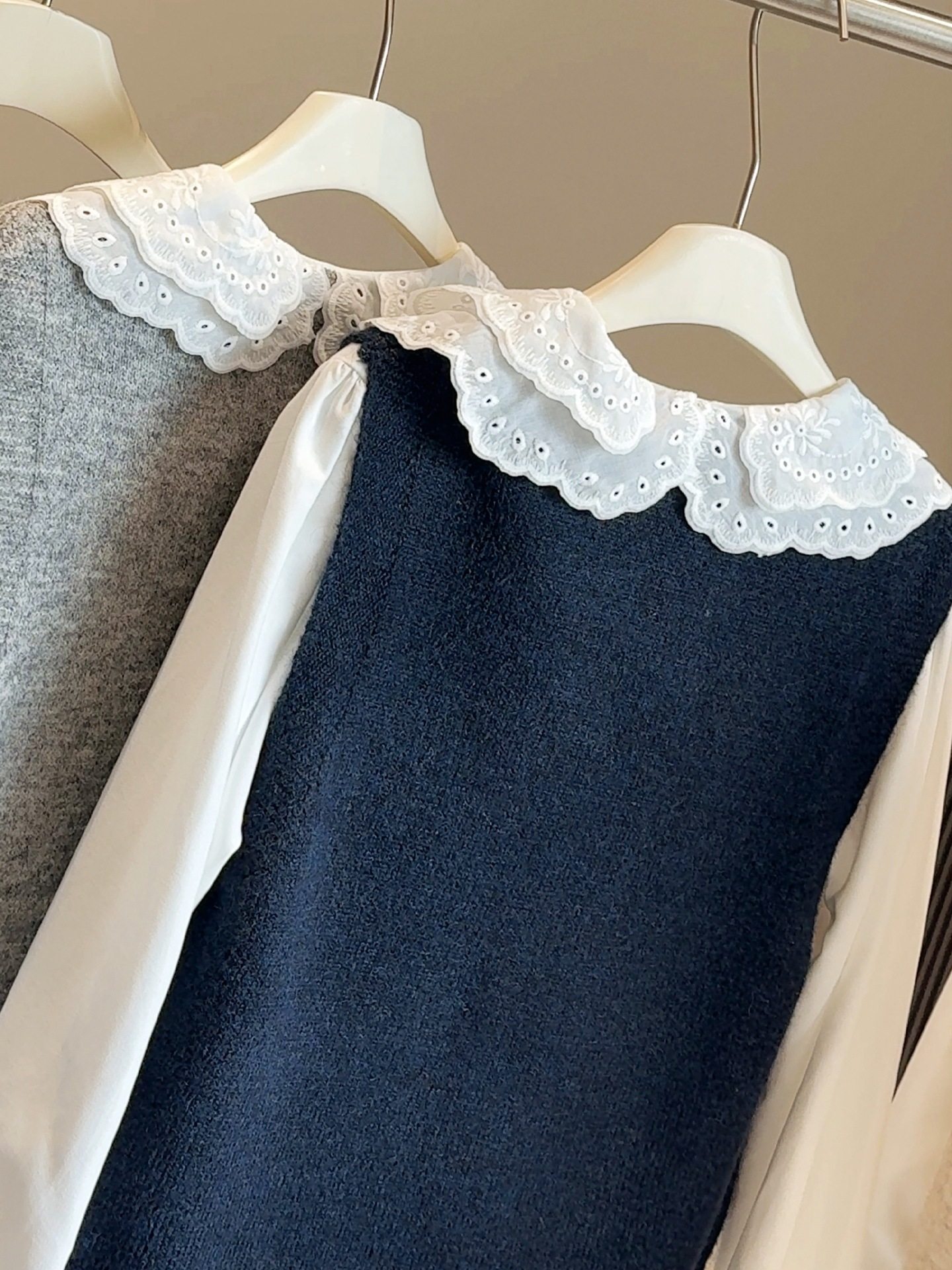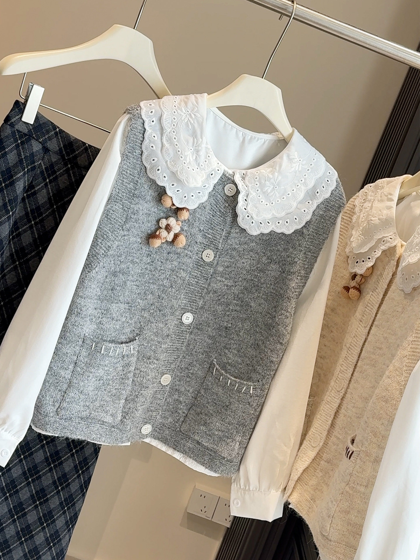 Three-Dimensional Flower Design, Age-Reducing, Slimming, Versatile Layering Knit Vest + Peter Pan Collar Shirt for Women, Autumn and Winter Fashion Set