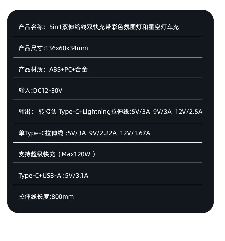 Starry Sky Car Charger 120W Super Fast Charging for Mobile Phones, Dual Port Retractable Cable