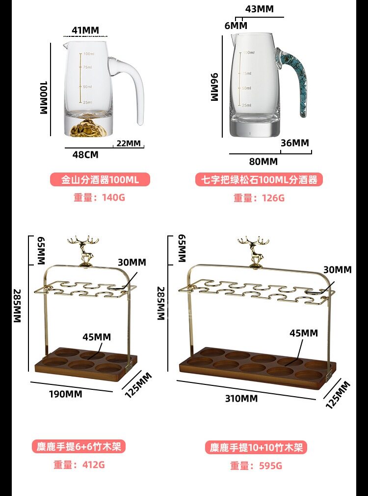 | Color | [transparent without handle] 6 pots, 6 cups + golden deer cup holder,[transparent without handle] 10 pots, 10 cups + golden deer cup holder,[transparent with handle] 6 pots, 6 cups + golden deer cup holder,[transparent with handle] 10 pots, 10 cups + golden deer cup holder,[gold foil model] 6 pots, 6 cups + golden deer cup holder,[gold foil style] 10 pots, 10 cups + golden deer cup holder,[blue mountain model] 6 pots, 6 cups + golden deer cup holder,[blue mountain style] 10 pots, 10 cups + golden deer cup holder,[gold mountain gold foil style] 6 pots, 6 cups + golden deer cup holder,[gold mountain gold foil style] 10 pots, 10 cups + golden deer cup holder,Gold foil jinshan wine dispenser 100ml*6+jinshan white wine glass 10ml*6+golden deer cup holder,Gold foil jinshan wine dispenser 100ml*10+jinshan white wine glass 10ml+golden deer cup holder,[jinshan model] 6 pots, 6 cups + golden deer cup holder,Jinshan model 10 pots, 10 cups + Golden Deer cup holder,Gold foil wine dispenser 100ml*6+white wine glass 10ml*6+gold deer cup holder+gift box,Gold foil wine dispenser 100ml*10+white wine glass 10ml*+gold deer cup holder+leather case,Gold foil jinshan wine dispenser 100ml*6+white wine glass 10ml+gold deer cup holder+gift box,Gold foil jinshan wine dispenser 100ml*10+white wine glass 10ml+gold deer cup holder+leather case,[transparent model] 6 pots, 6 cups + golden deer cup holder,[transparent model] 10 pots, 10 cups + golden deer cup holder,[gold-painted model] 6 pots, 6 cups + golden deer cup holder,[gold-painted model] 10 pots, 10 cups + golden deer cup holder,[turquoise style] 6 pots, 6 cups + golden deer cup holder,[turquoise style] 10 pots, 10 cups + golden deer cup holder,[transparent model] small tall cup/6 pots and 6 cups + golden deer cup holder,[transparent model] small tall cup/10 pots and 10 cups + golden deer cup holder,[gold-painted model] gold-rimmed goblet/6 pots and 6 cups + golden deer cup holder,[gold-painted model] small tall cup/10 pots and 10 cups + golden deer cup holder,[gold foil style] small tall cup/6 pots and 6 cups + golden deer cup holder,[gold foil style] small tall cup/10 pots and 10 cups + golden deer cup holder |