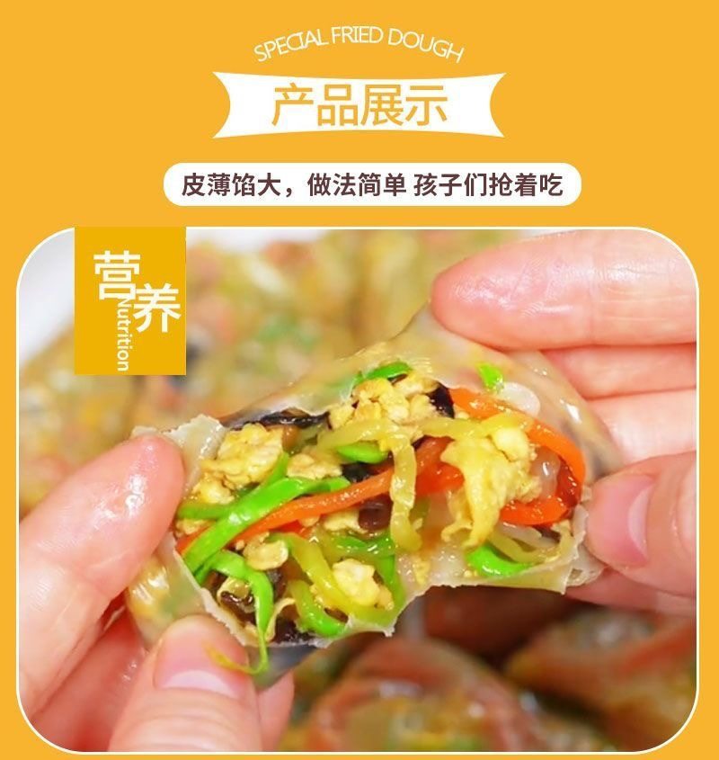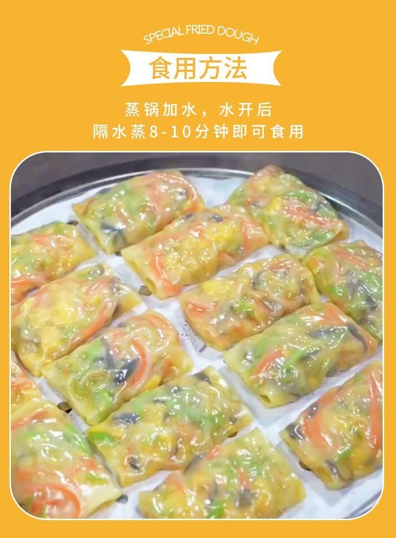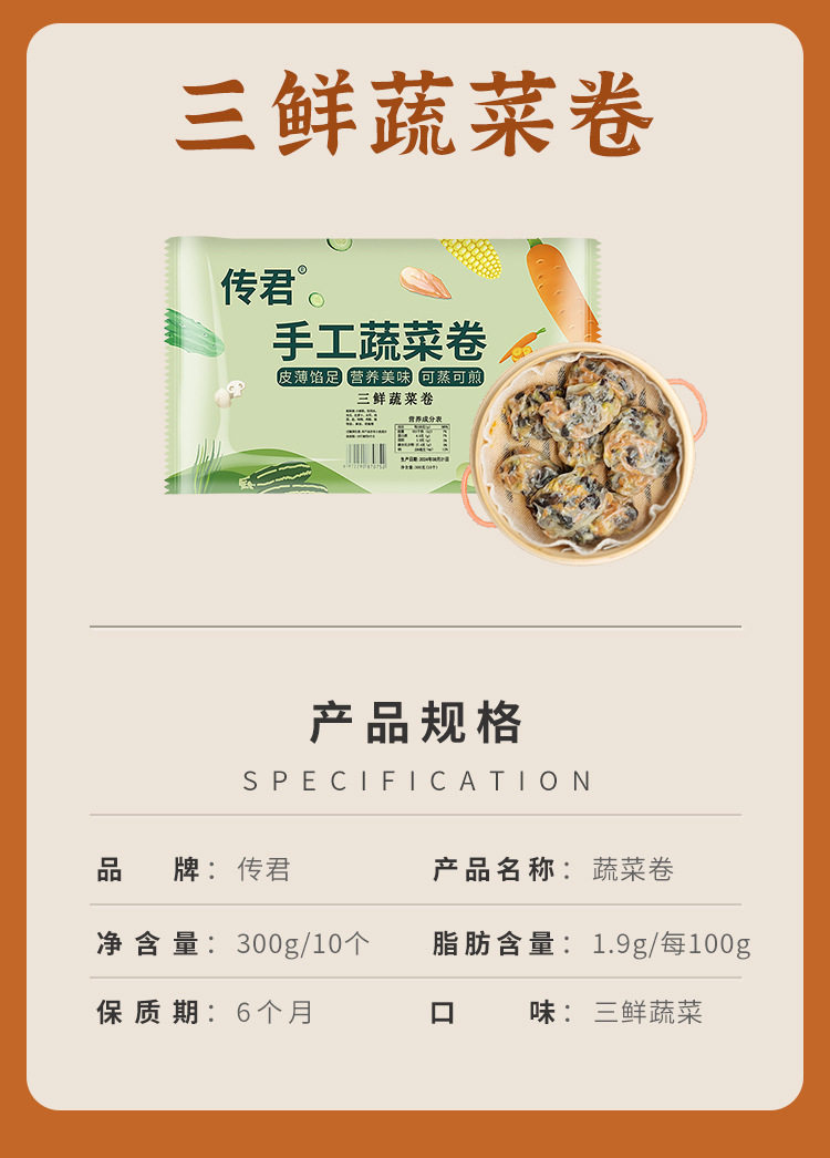 | Packaging specifications | Steamed and fried: [three fresh vegetable rolls] 10 pieces,Steamed and fried: [three fresh vegetable rolls] 20 pieces,Steamed and fried: [three fresh vegetable rolls] 40 pieces,Steamed and fried: [three fresh vegetable rolls] 60 pieces |