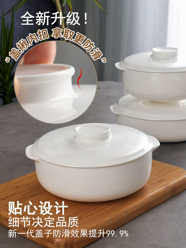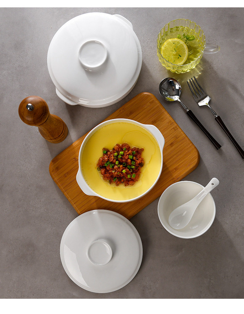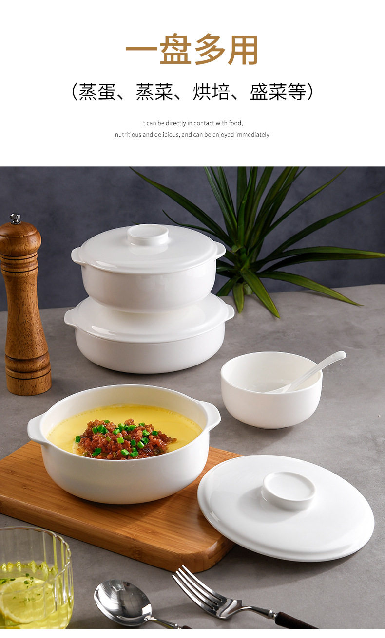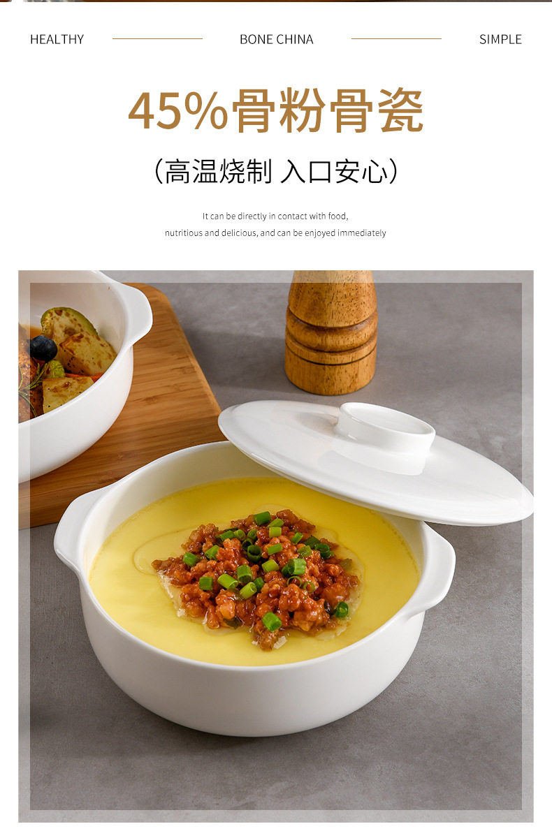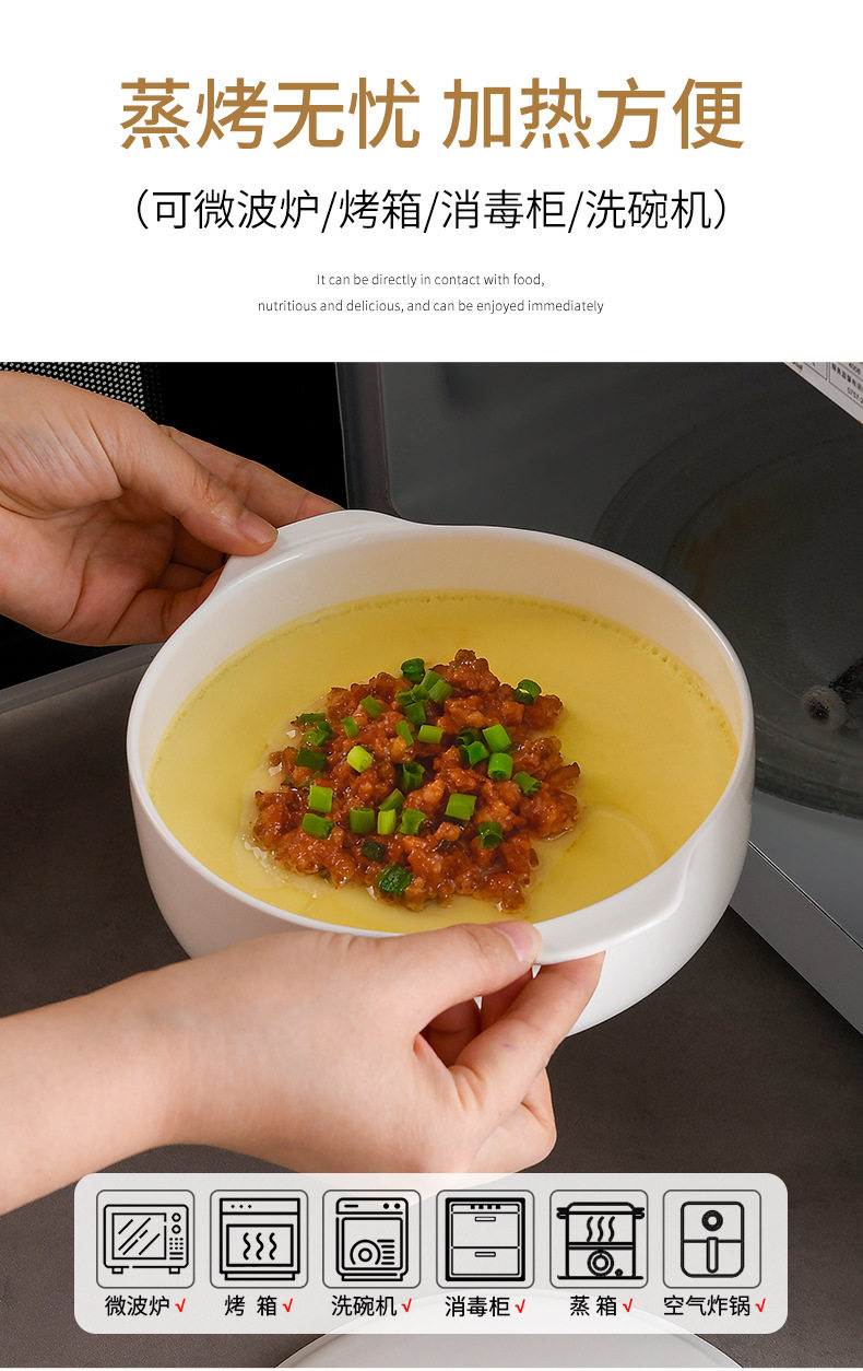 Bone China Double-Eared Steamed Egg Custard Bowl, Microwaveable Steaming Bowl with Lid, Ceramic Food-Grade Japanese-Style Household Underglaze Color